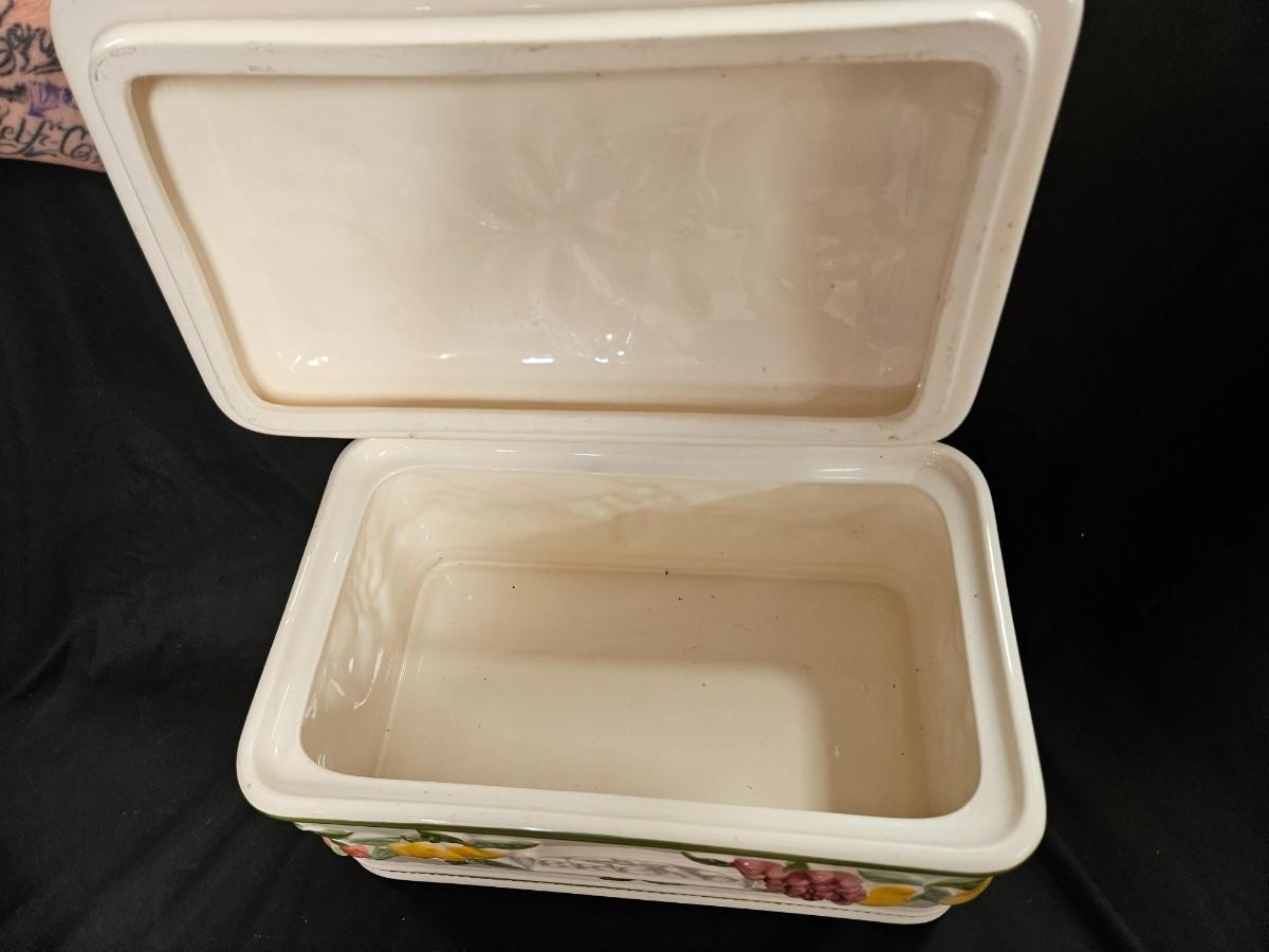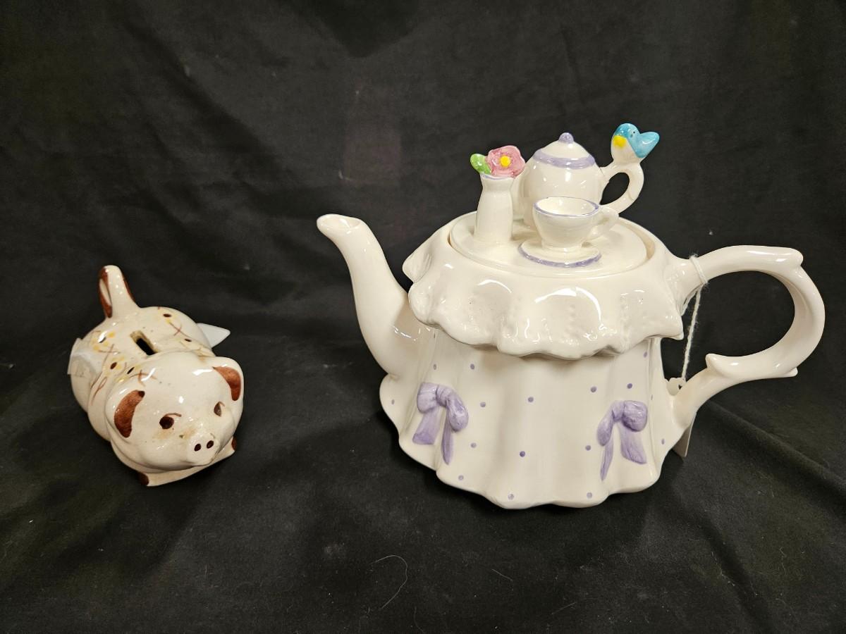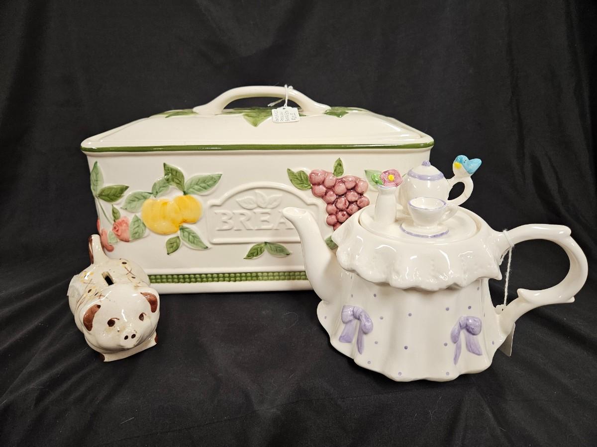 Lot of 3 Vintage Items Including Portuguese Bread Box, Teleflora Teapot and Rio Hondo California Pottery Type Piggy Bank