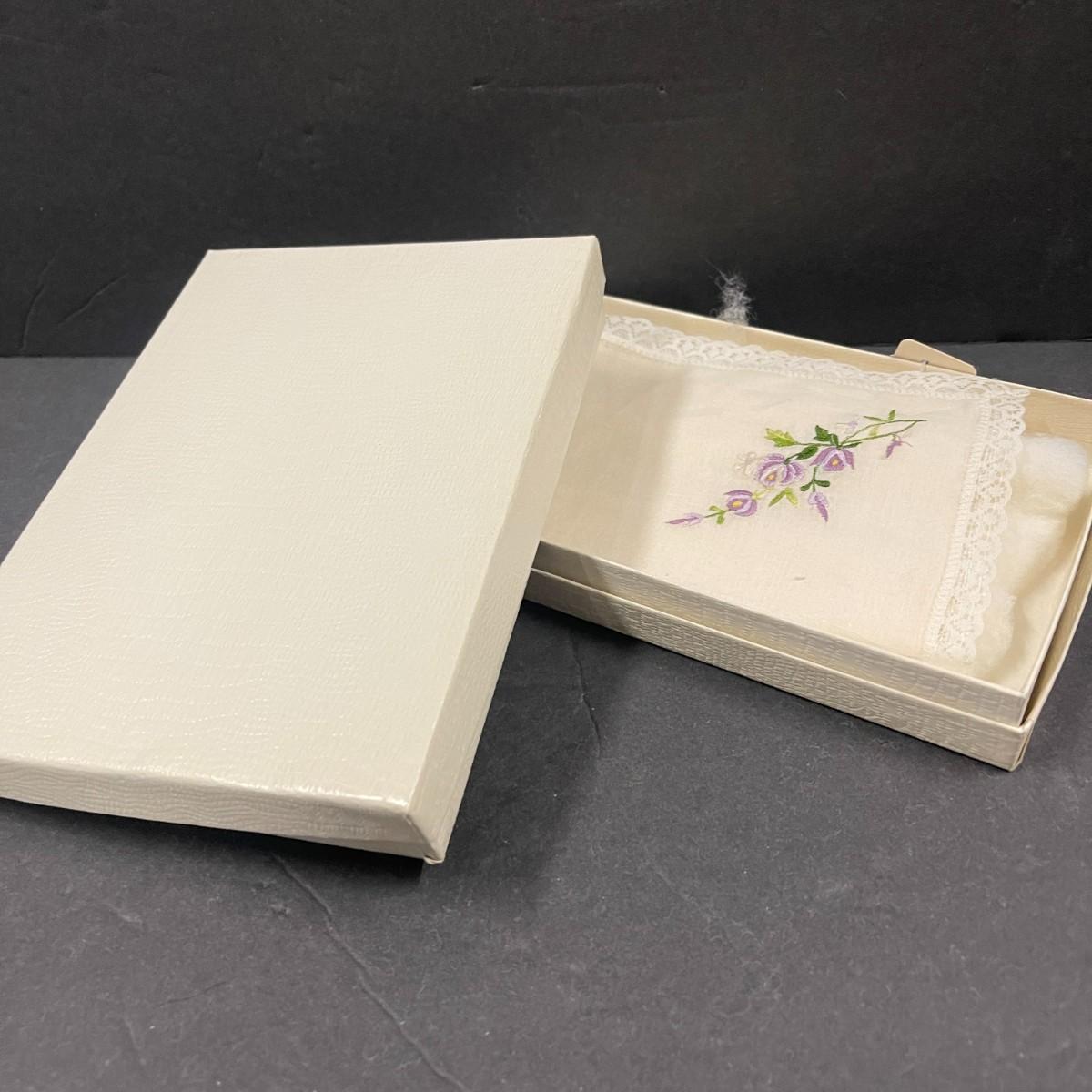 Lot of 3 vintage linen handkerchiefs. All new in gift boxes. 11" square.