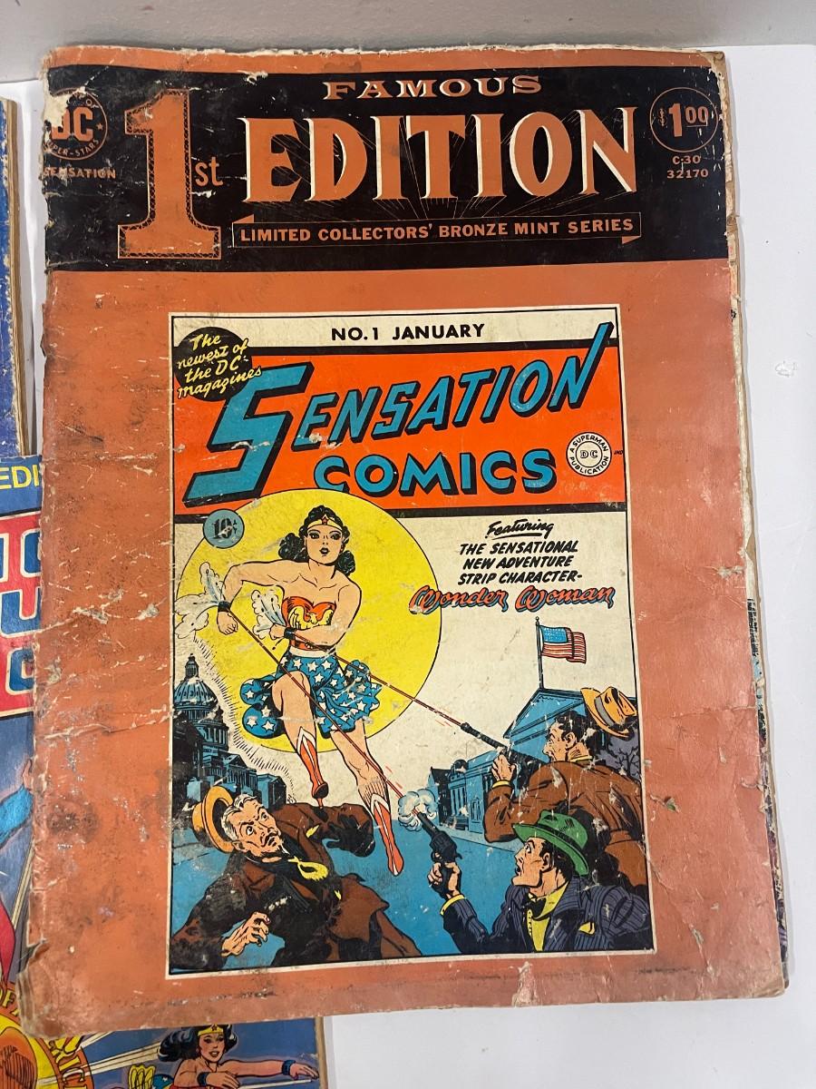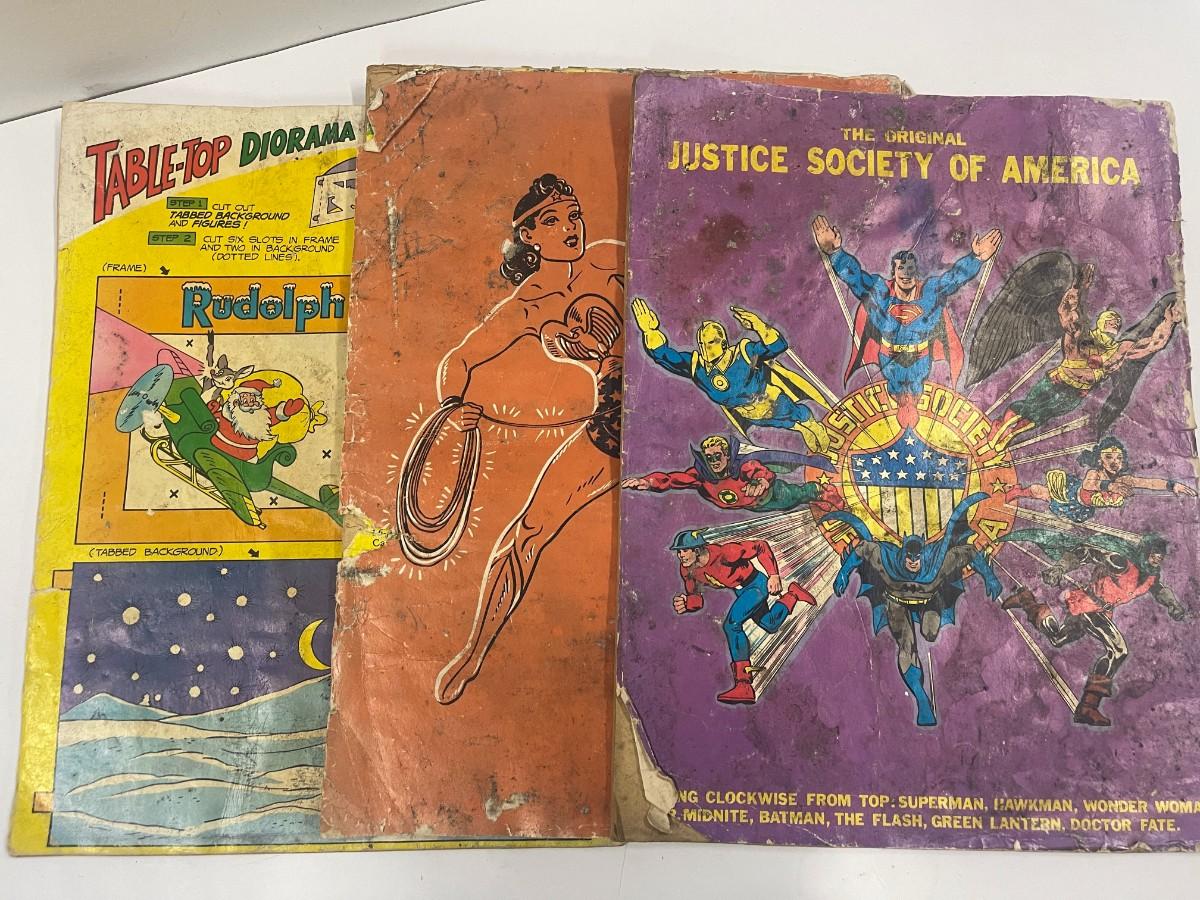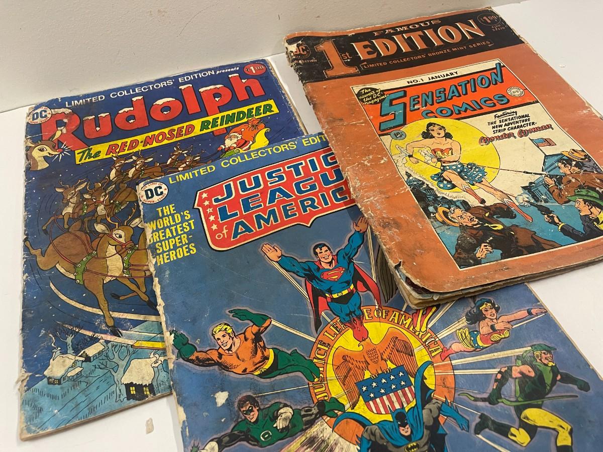 Lot of 3 vintage oversized comic books. Inludes Sensation Comics Wonder Woman Famous 1st edition, DC Limited Collector's Edition Justice League, DC Limited Collector's Rudolph The Red Nosed Reindeer. All have damage to the covers so please view photos carefully for condition. Each is 10" x 13"