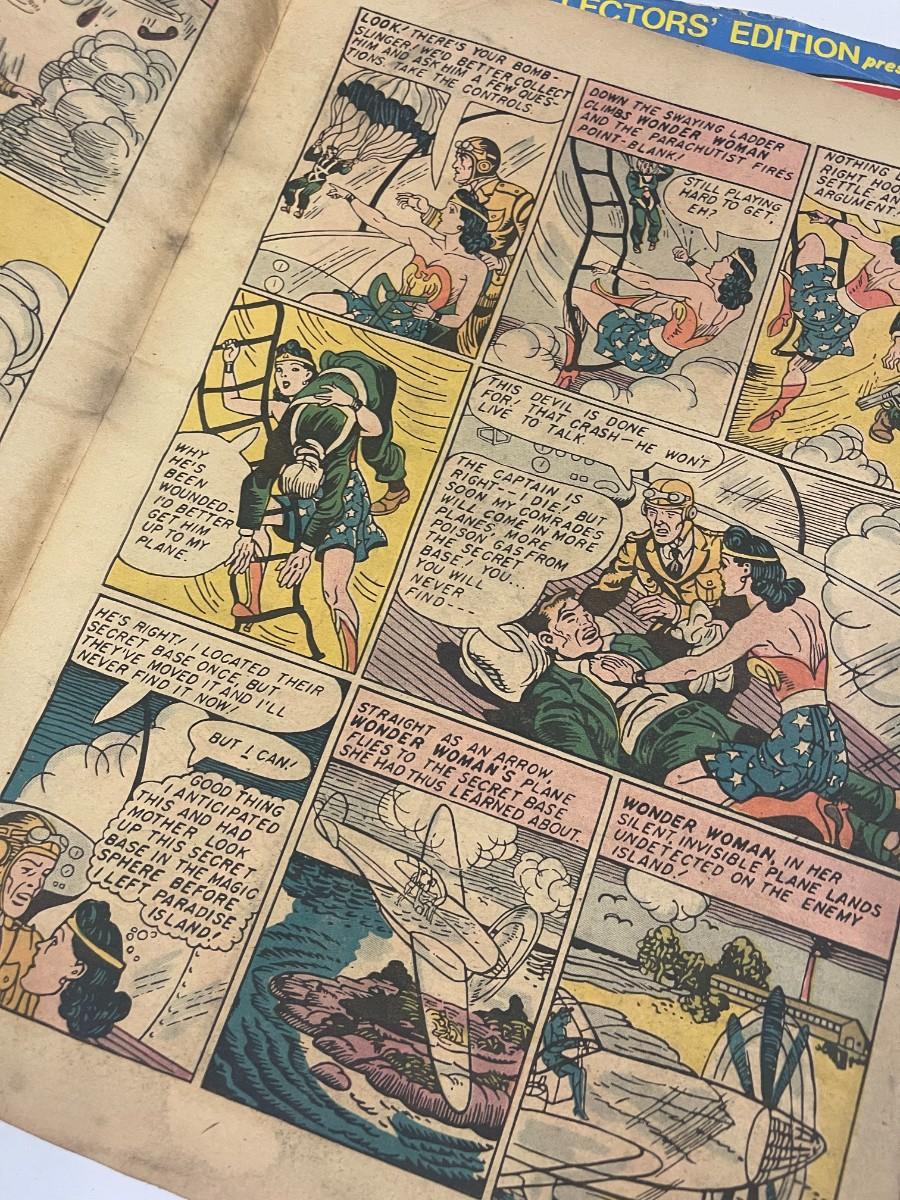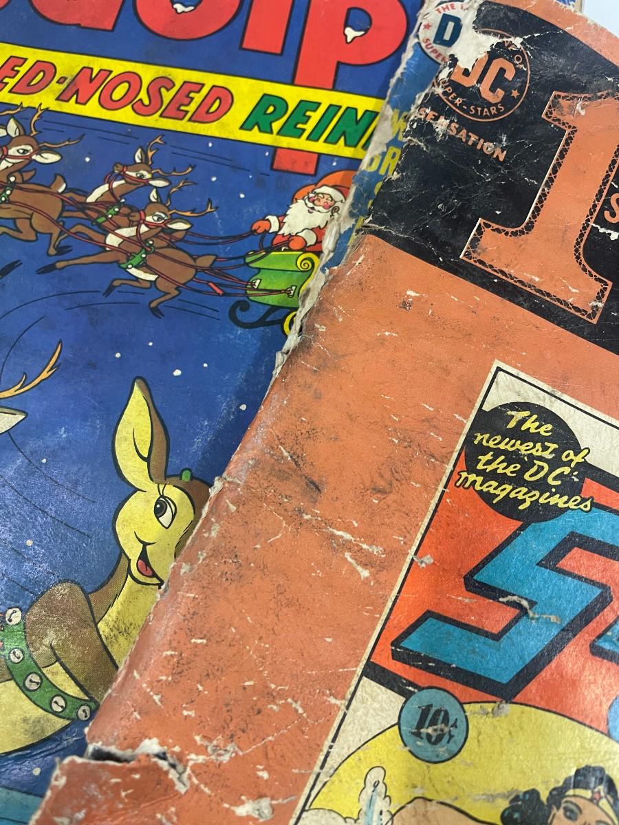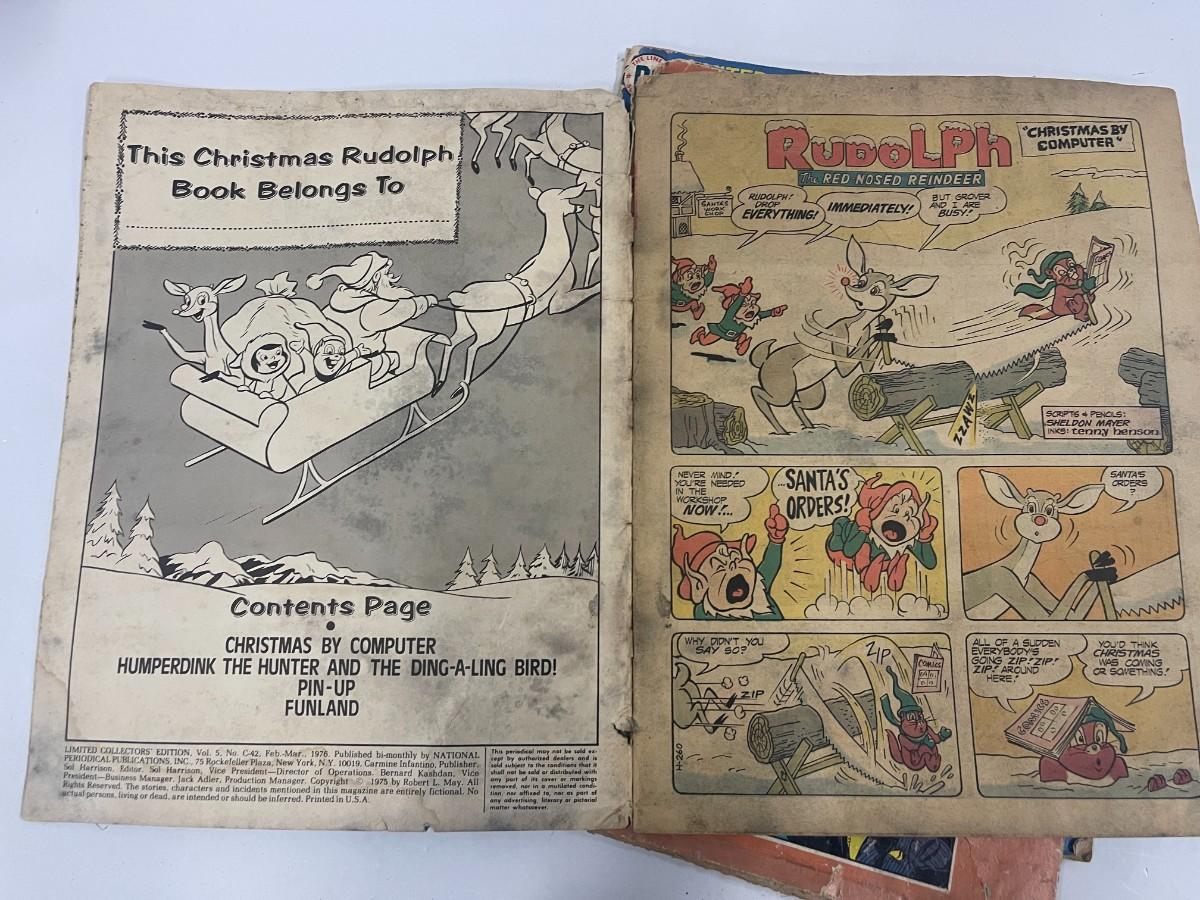 Lot of 3 vintage oversized comic books. Inludes Sensation Comics Wonder Woman Famous 1st edition, DC Limited Collector's Edition Justice League, DC Limited Collector's Rudolph The Red Nosed Reindeer. All have damage to the covers so please view photos carefully for condition. Each is 10" x 13"