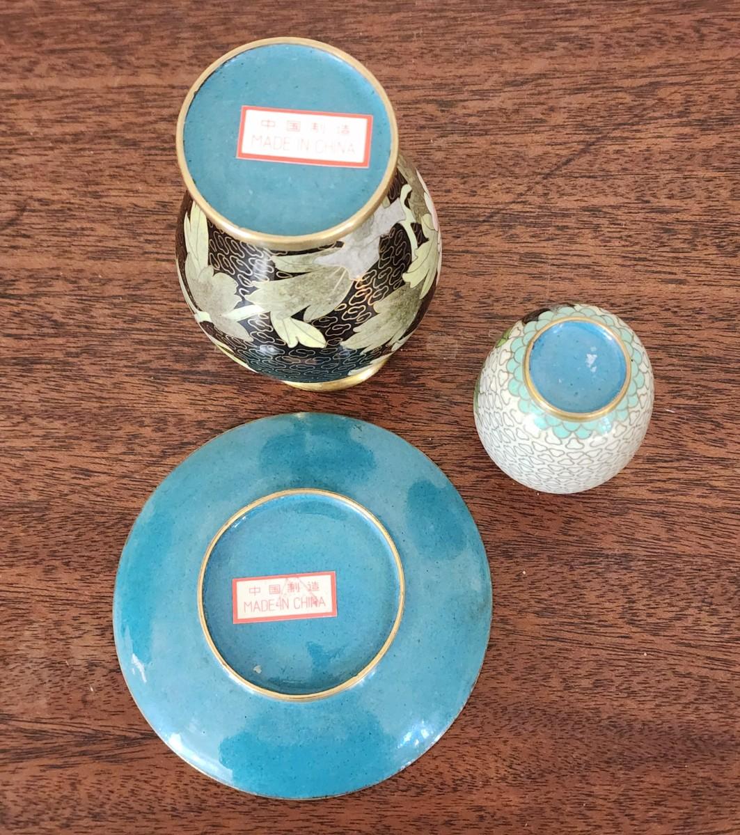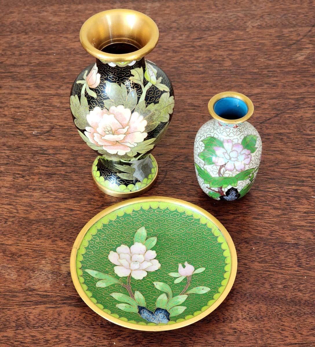 Lot of 3 Vintage Pieces of Chinese Cloisonne - 2 Vases and 1 dish