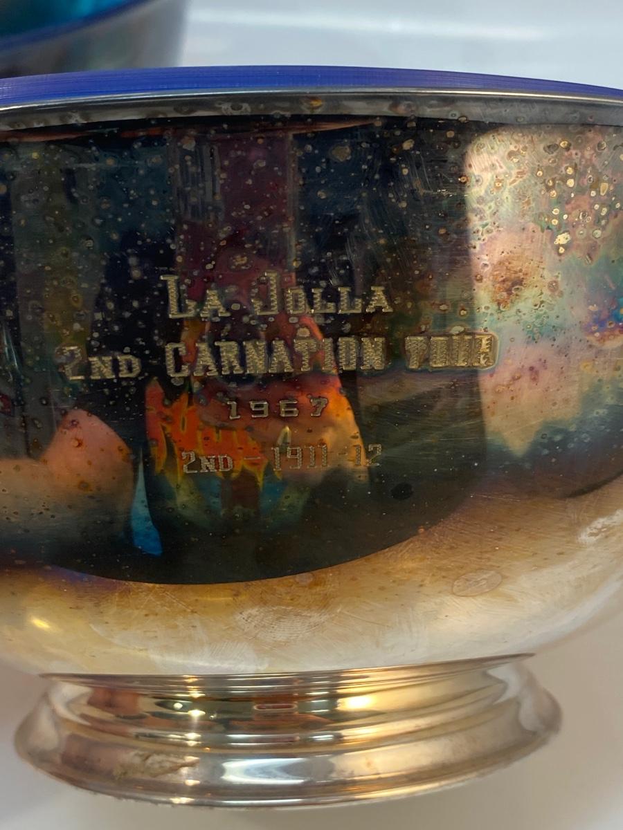 Lot of 3 Vintage Silver Plate Serving Bowls with Plastic Inserts. Two have plastic inserts for food use. One is engraved on the front from the 2nd Carnation Tour La Jolla 1967. All are in vintage condition.