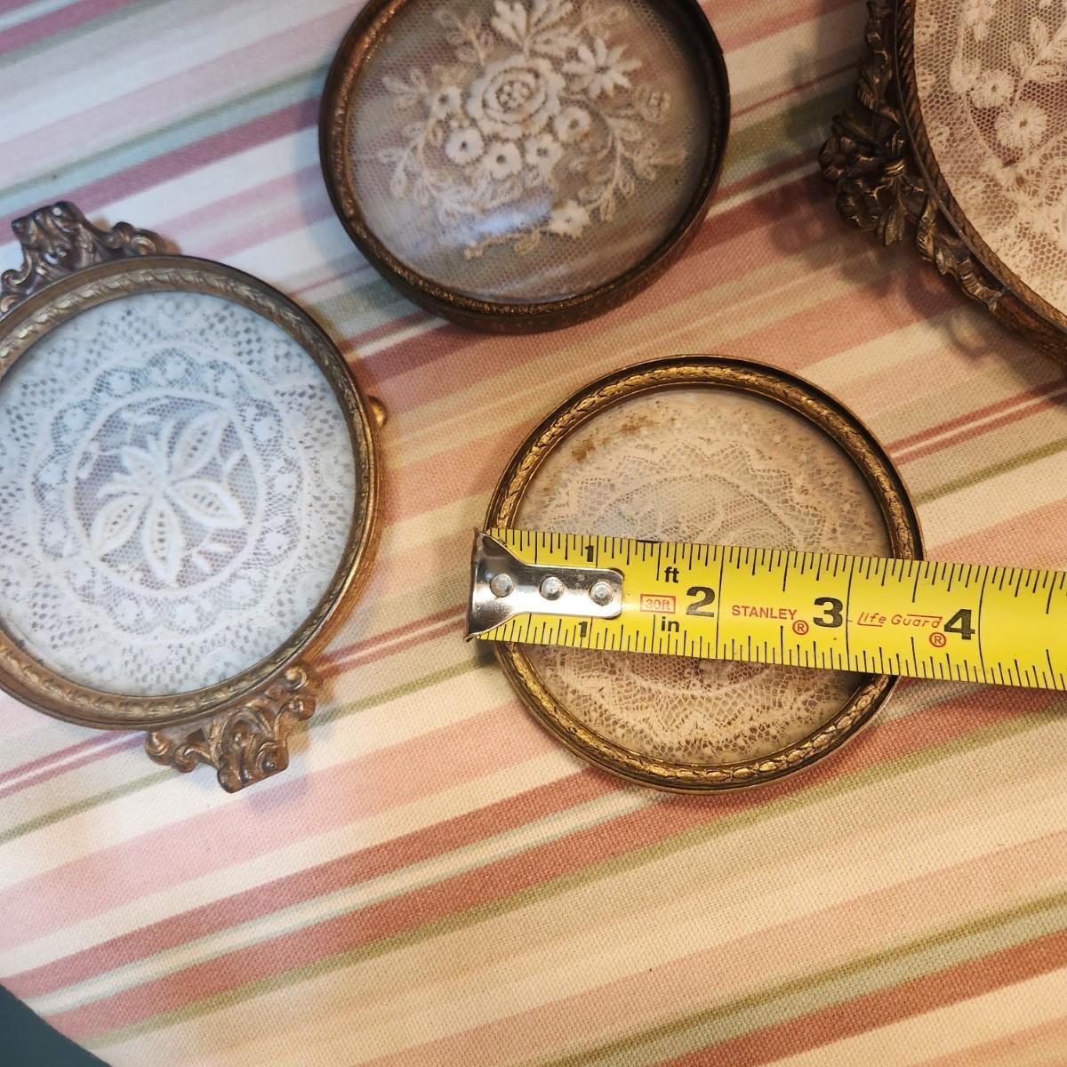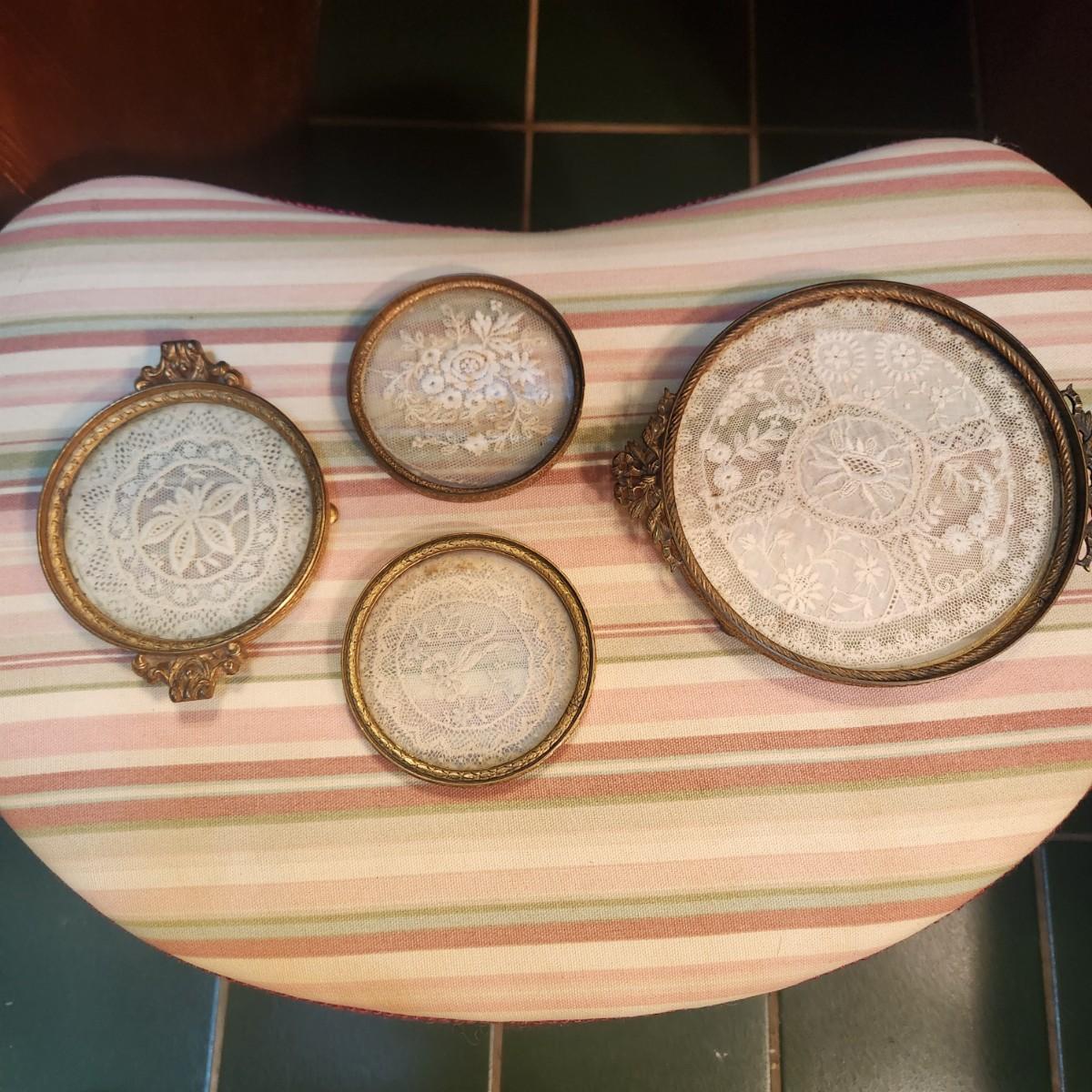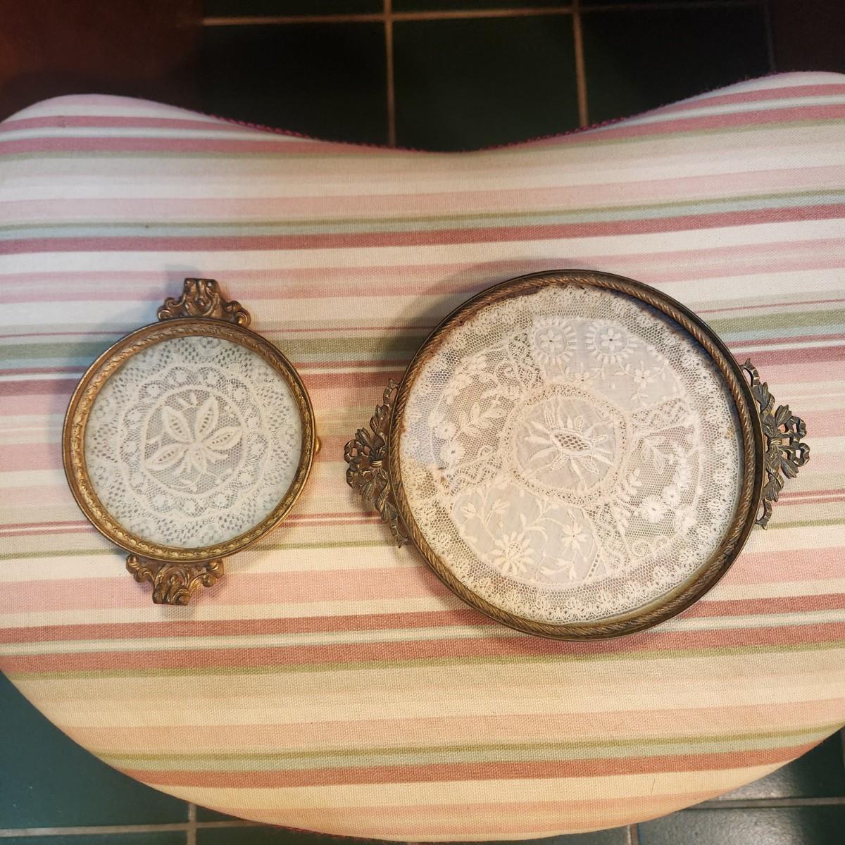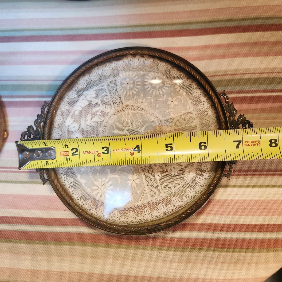 Lot of 4 Antique Brass & Glass w Lace Vanity Trays Apollo 2695 , E & J.B.