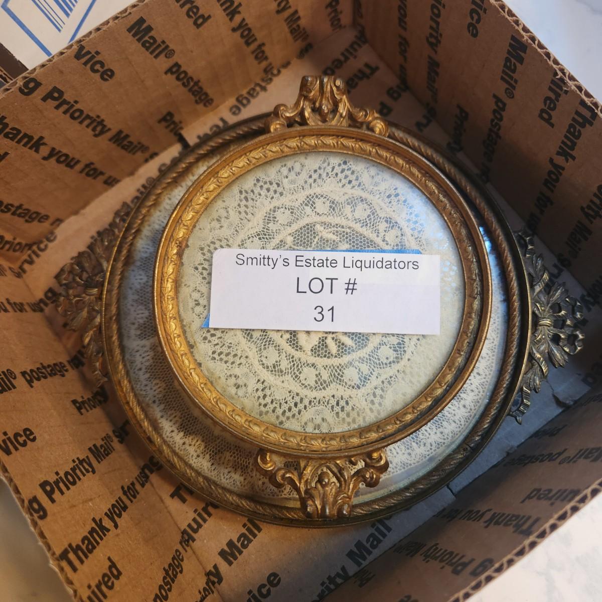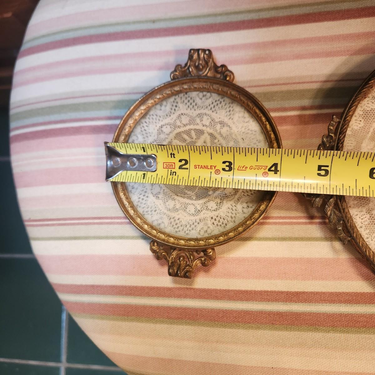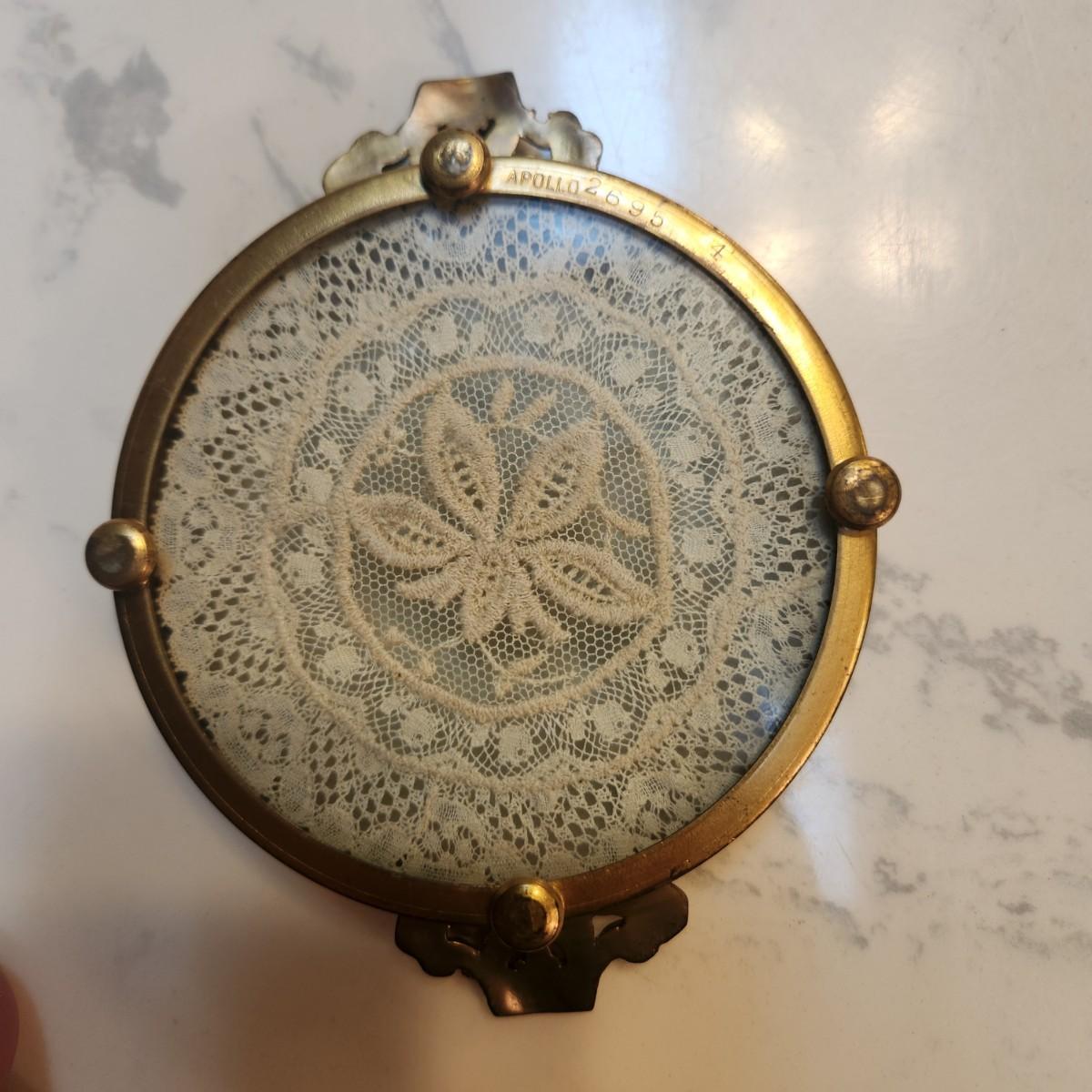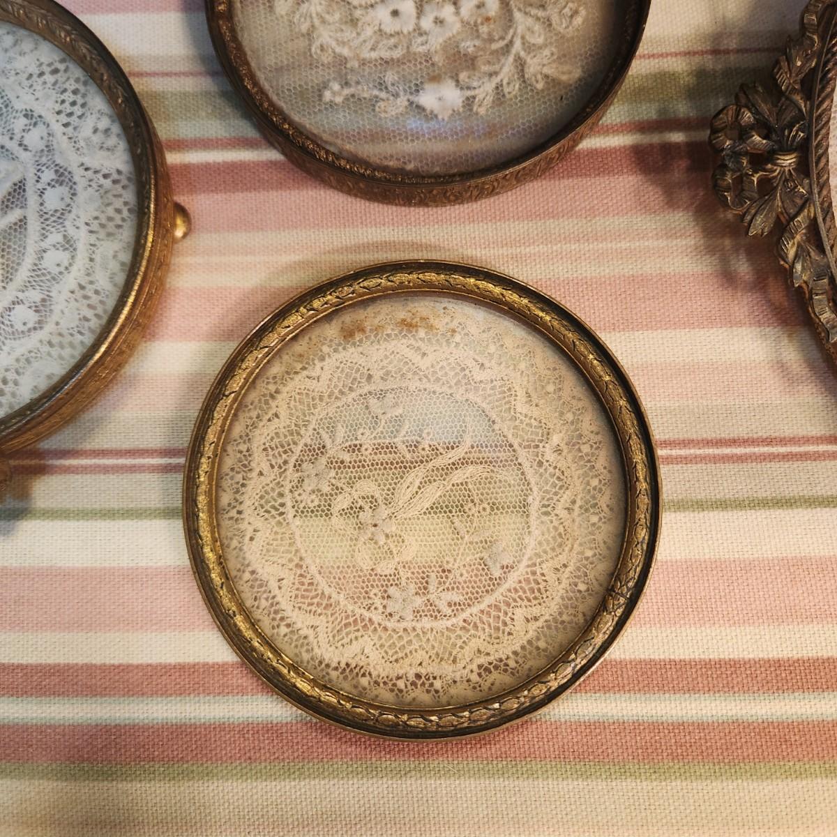 Lot of 4 Antique Brass & Glass w Lace Vanity Trays Apollo 2695 , E & J.B.