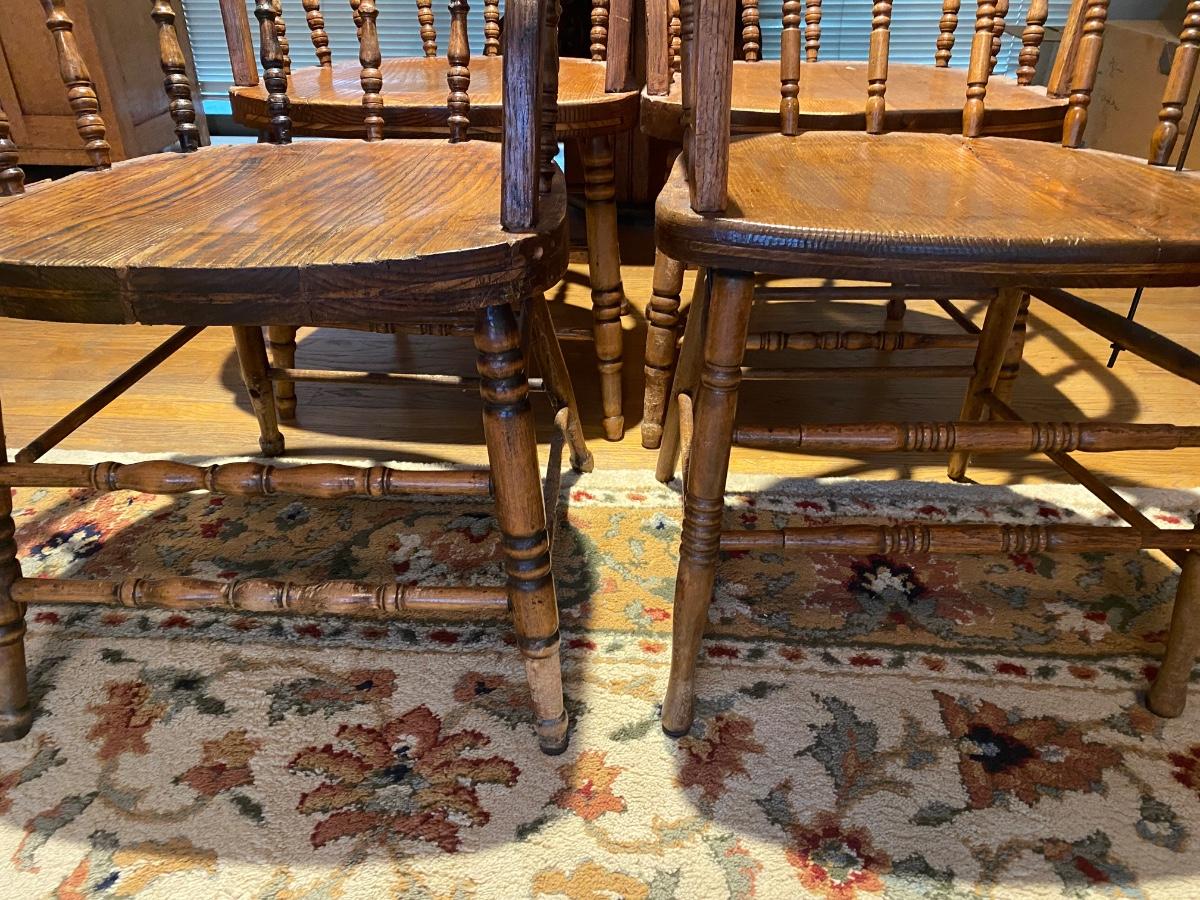 Lot of 4 antique oak chairs from the Hickman County, Tennessee courthouse. One chair is missing a bottom rung and the other bottom rung was chewed on. There is some wear on all the chairs but otherwise in good condition. Approx 21w x 18d x 31h.
