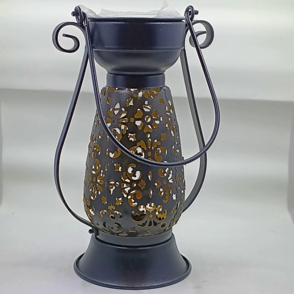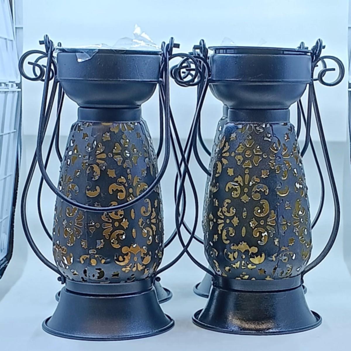 These stamped tin lanterns feature a removable top that contains a solar panel, LED light and rechargeable battery pack.