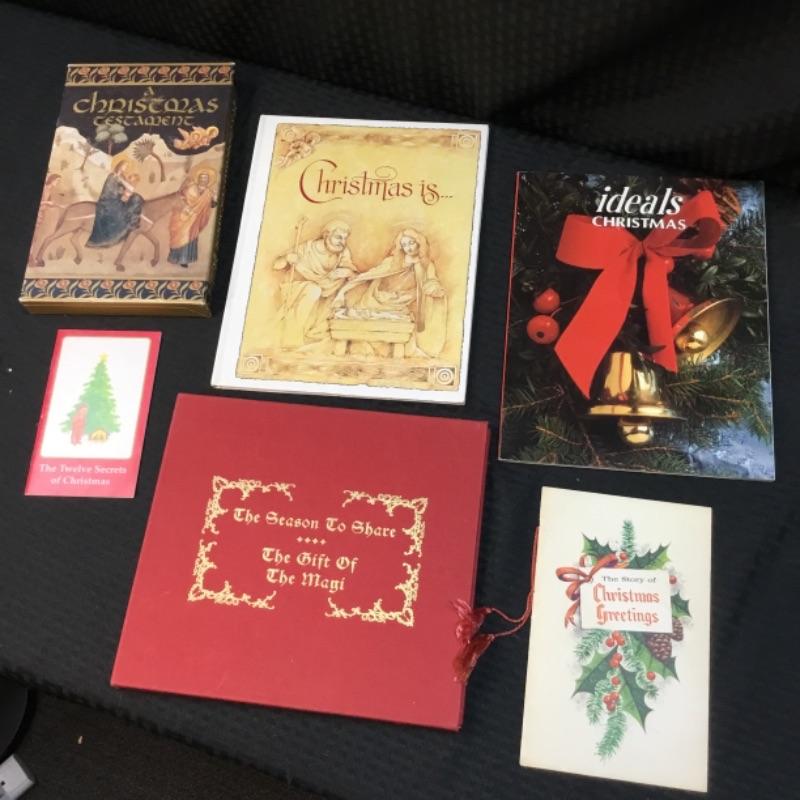 Up for auction is a lot of 4 Christmas books, and 2 Christmas pamphlets. All are in good used condition. Titles include: “The Story of Christmas Greetings“, “Christmas Is“, “ideals Christmas“, “ 12 Secrets of Christmas“, “Christmas Testament“.