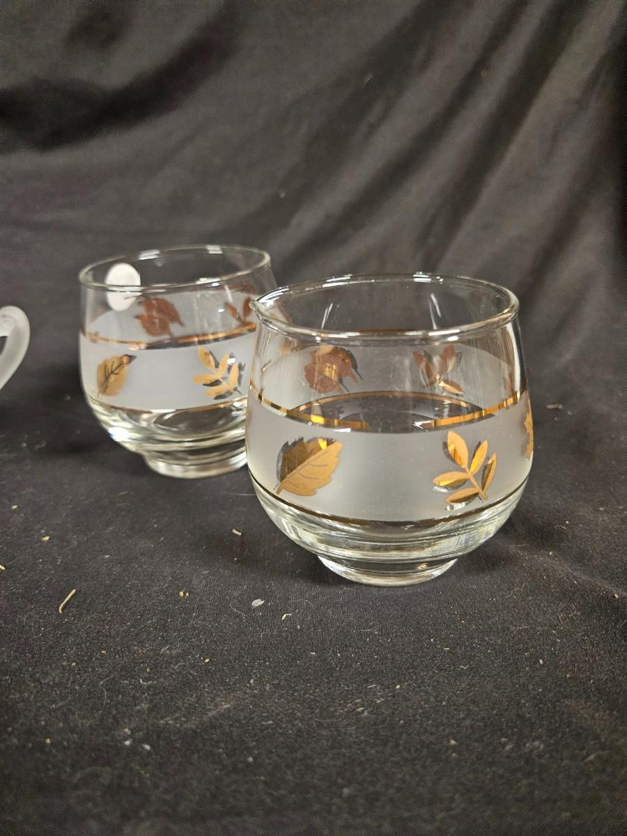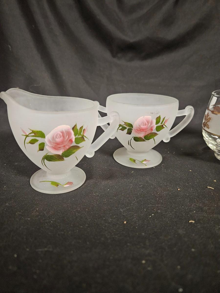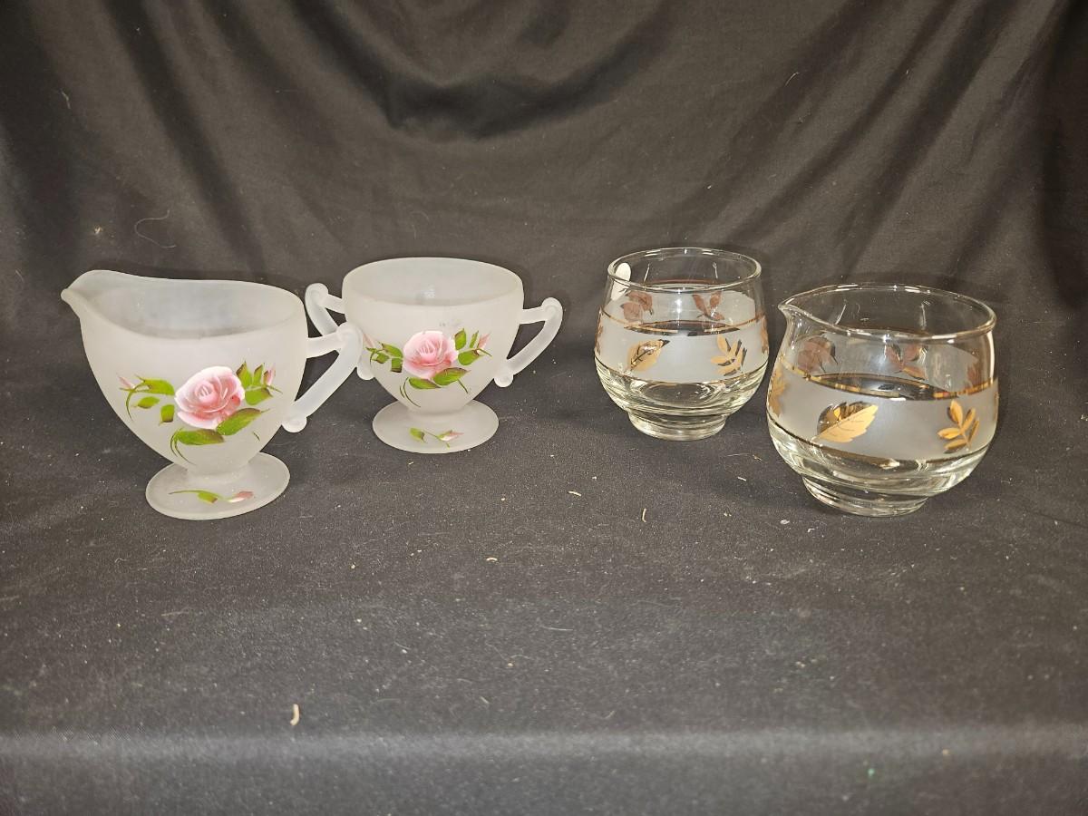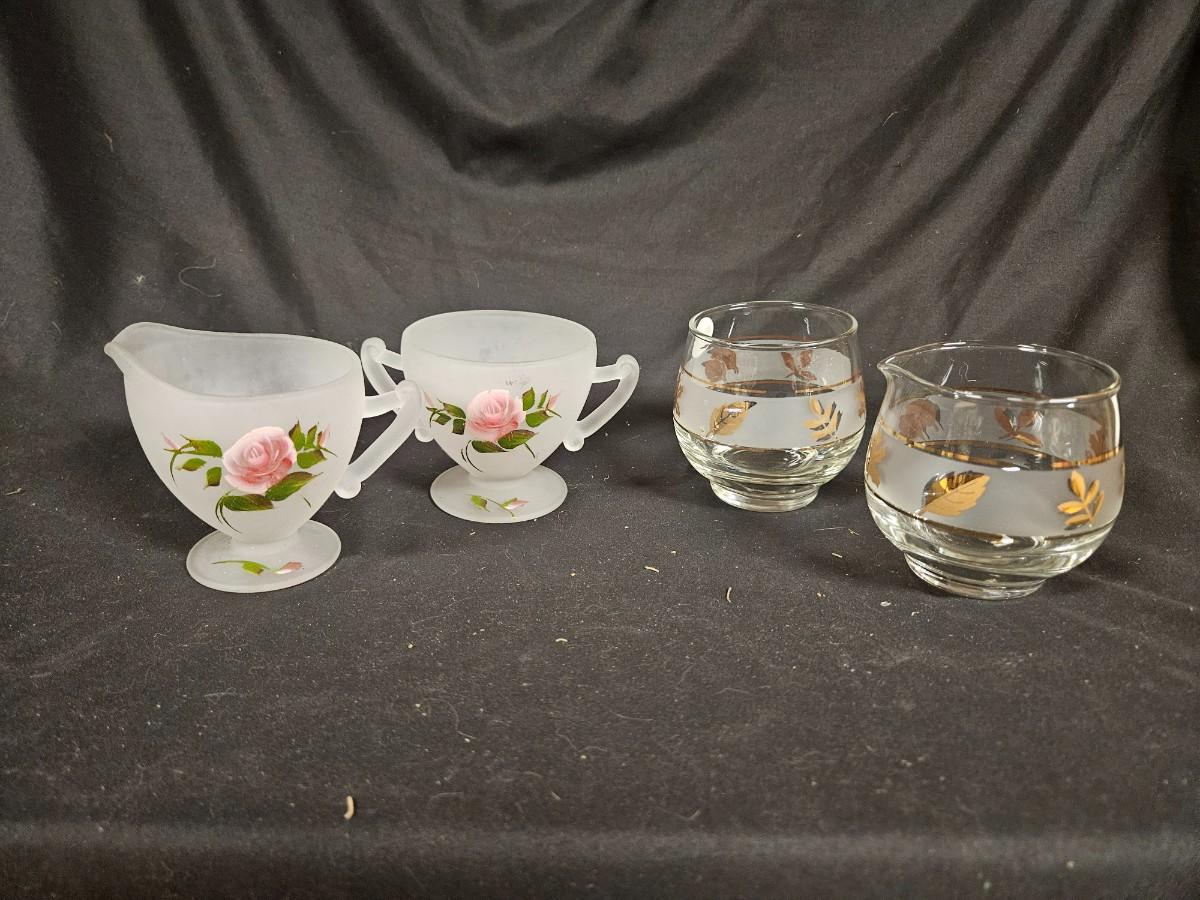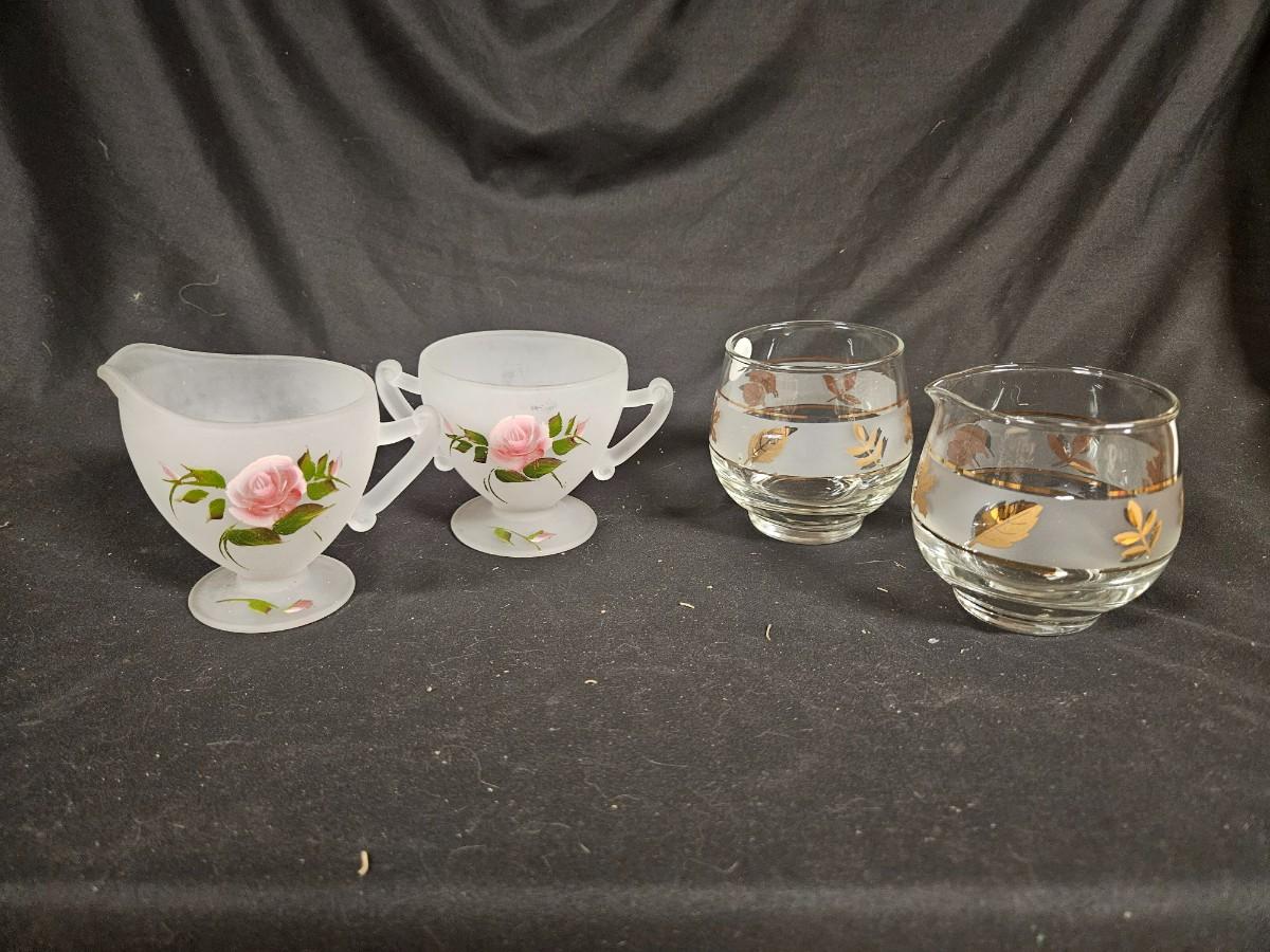 Lot of 4 Creamer & Sugars Including Hand Painted Depression Frosted Glass and Libbey Golden Foilage