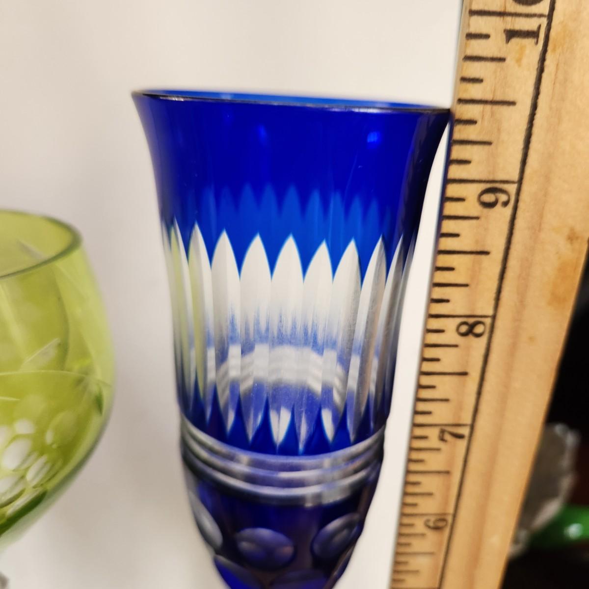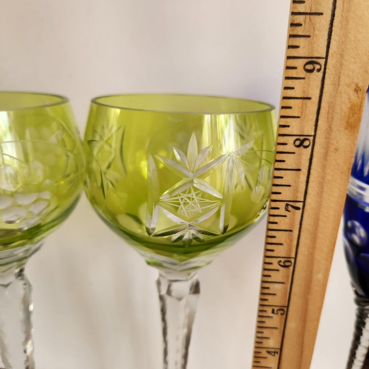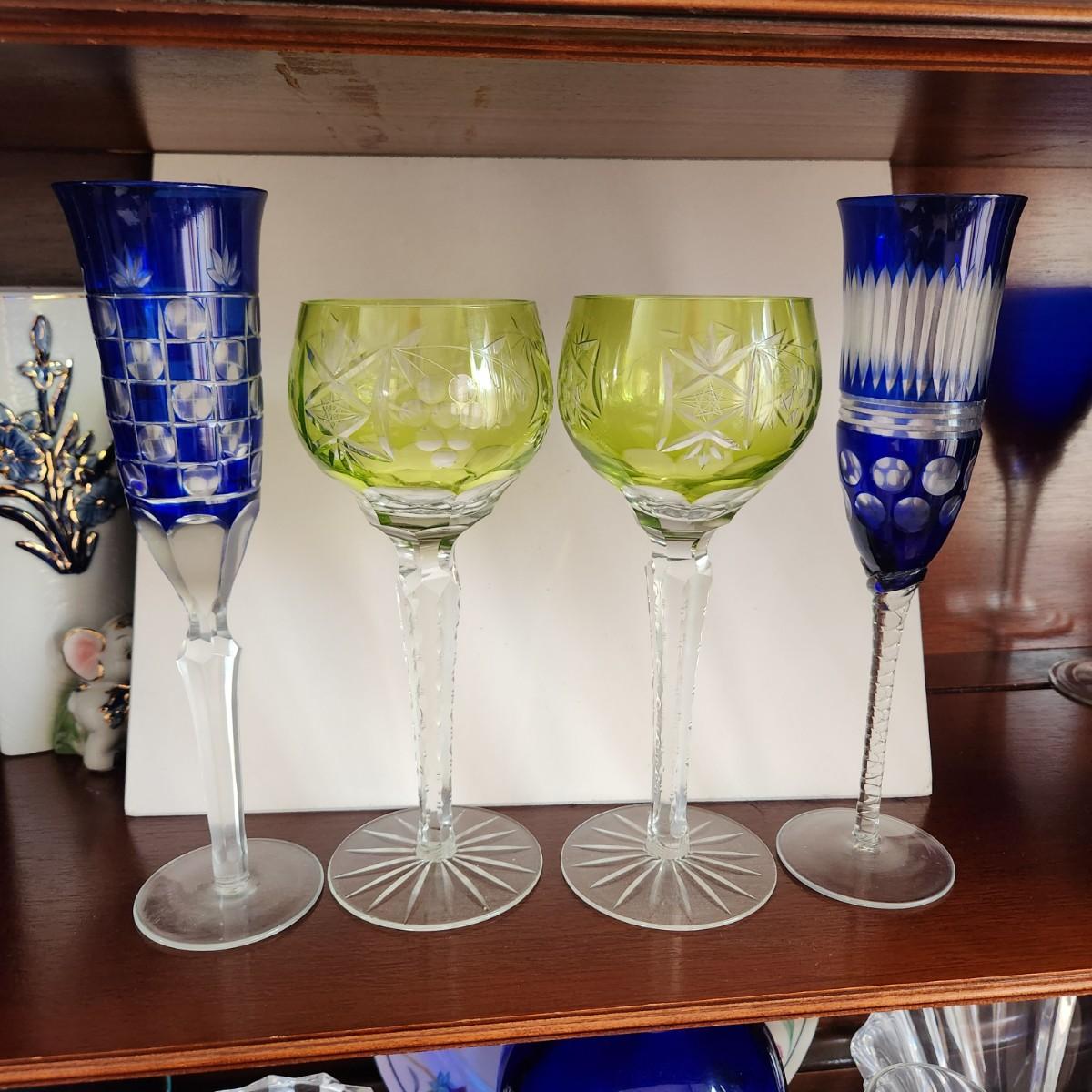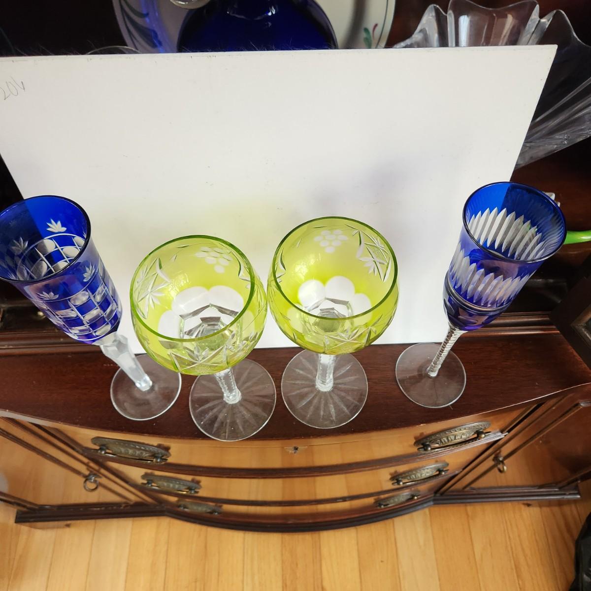 Lot of 4 Crystal Wine Glasses 2 Blue Cut to Clear 2 Yellow/Green Cut to Clear