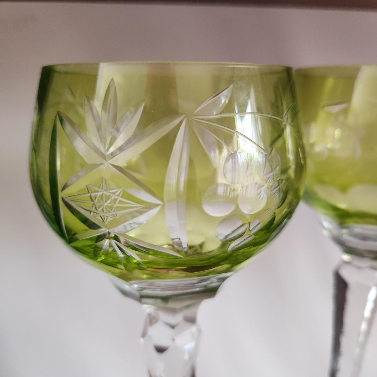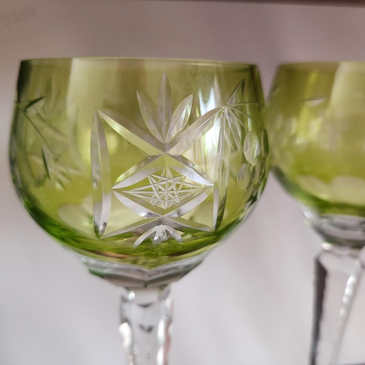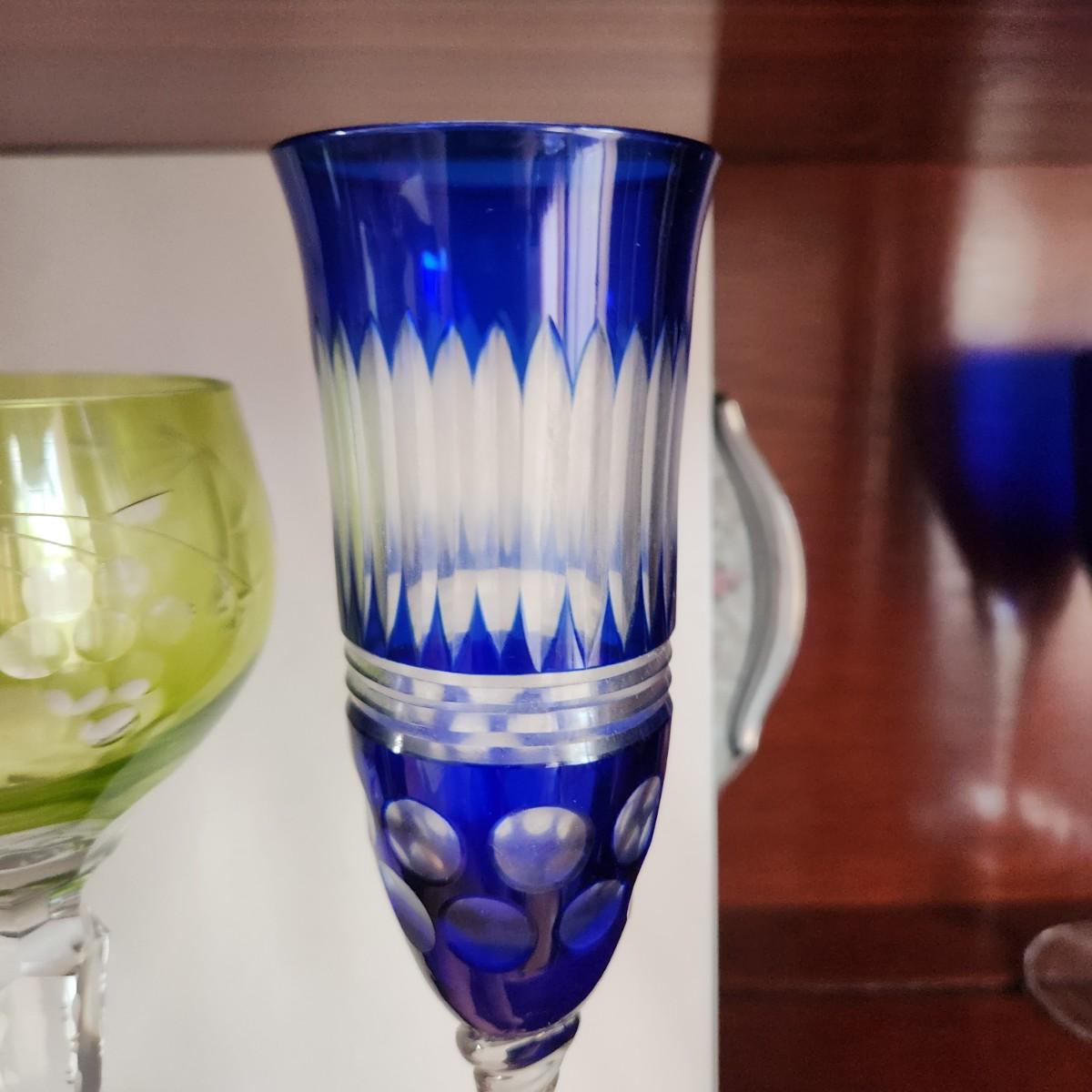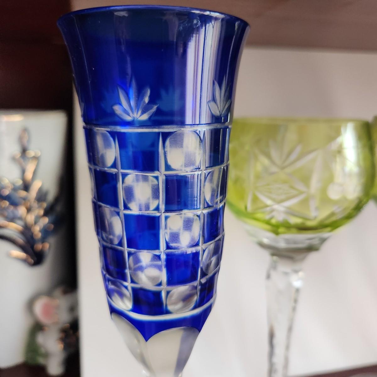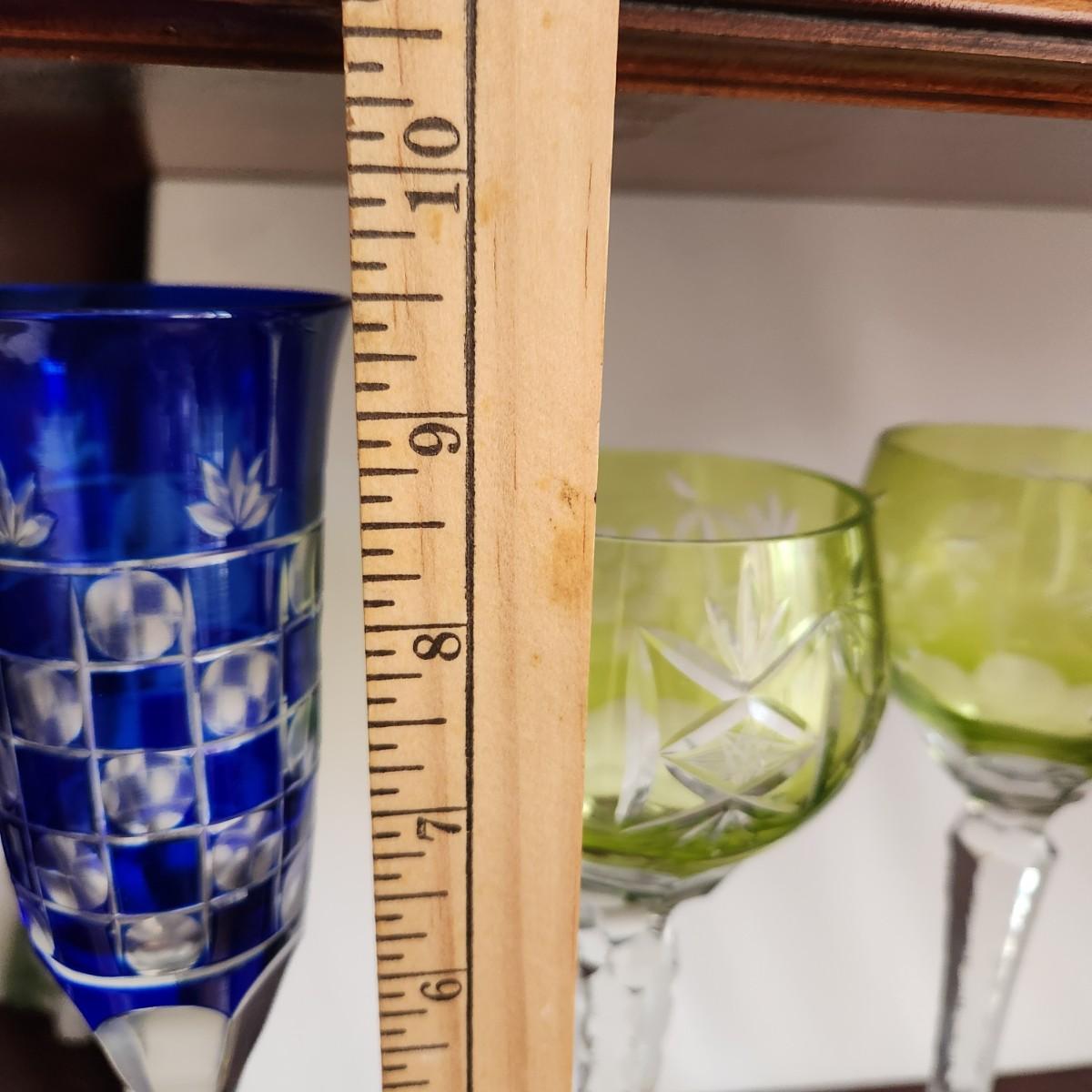 Lot of 4 Crystal Wine Glasses 2 Blue Cut to Clear 2 Yellow/Green Cut to Clear