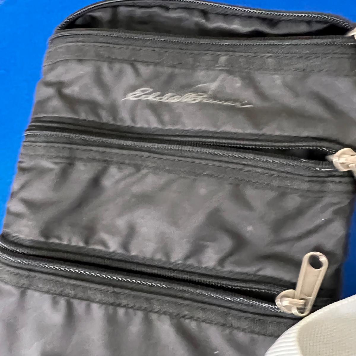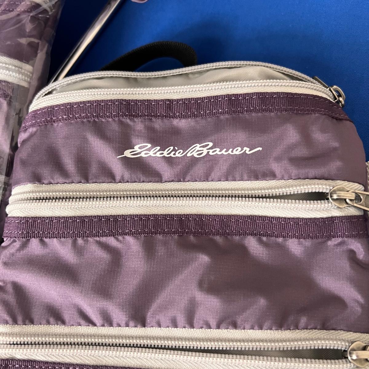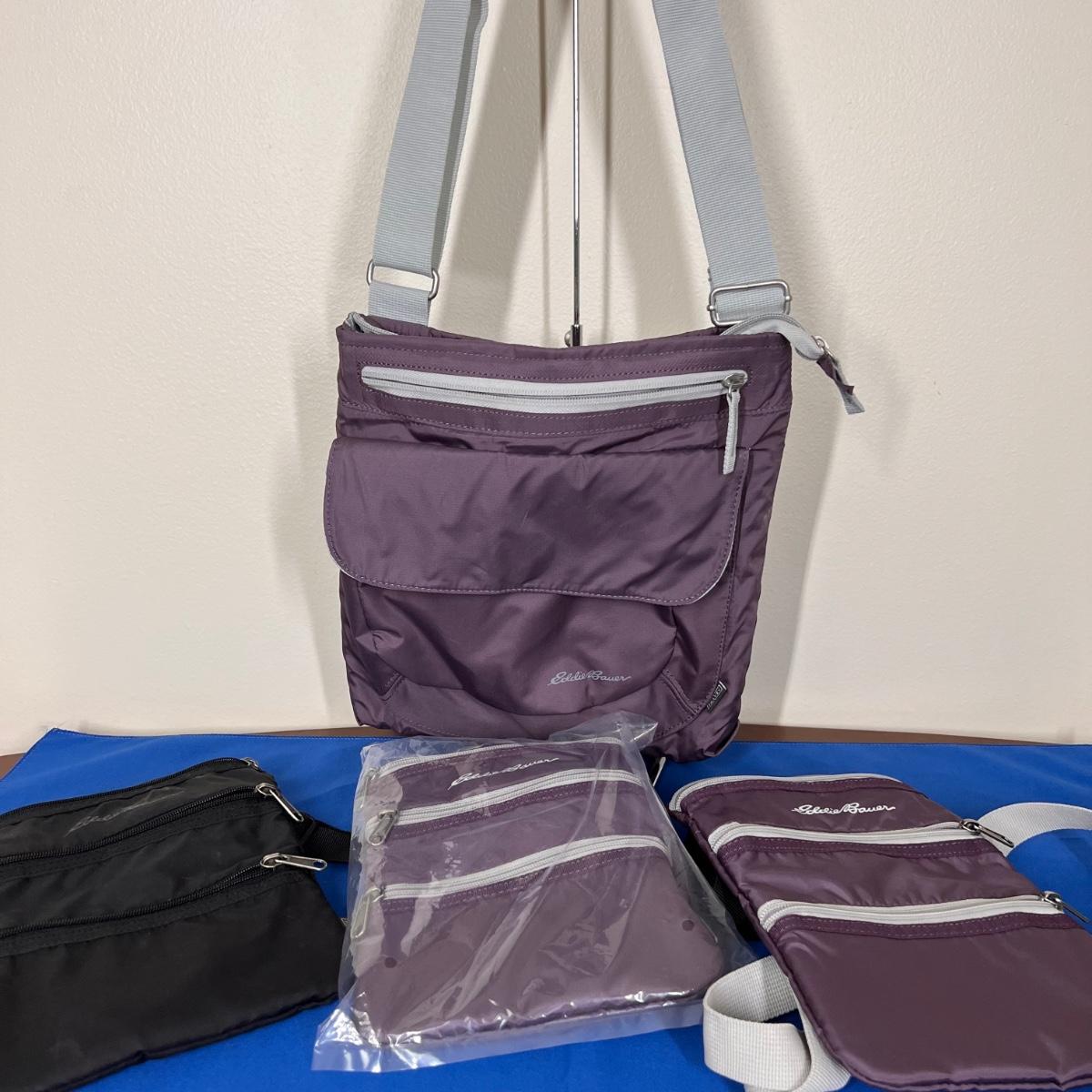 3 purple and 1 black Eddie Bauer bags. 1 new in plastic. Other 2 in excellent condition. Black in fair condition. Shows signs or use and wear