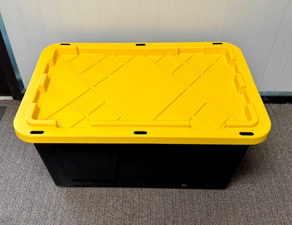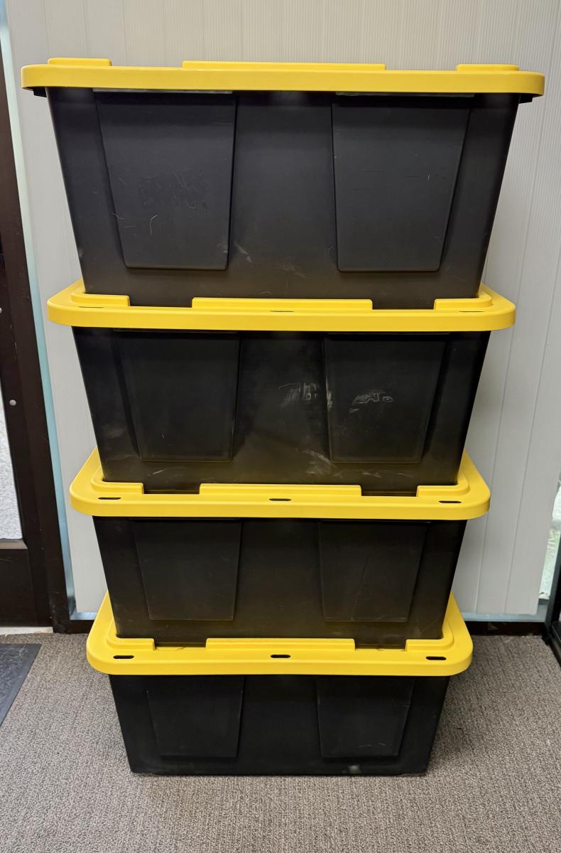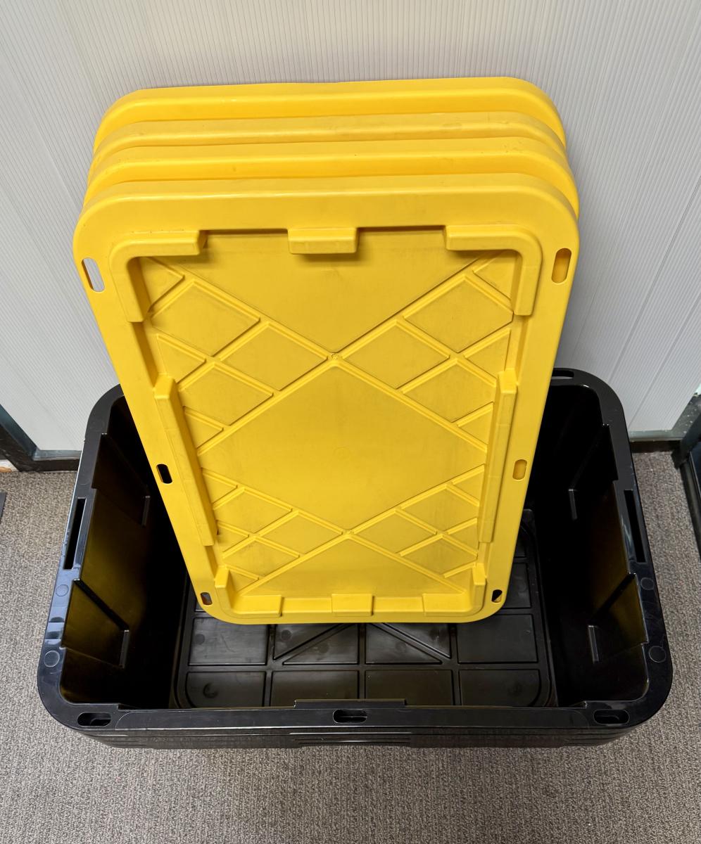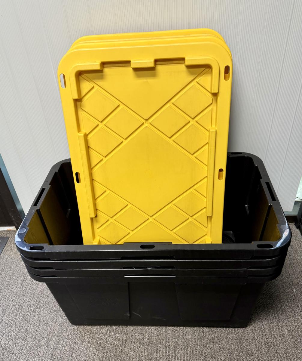 Black bins with yellow lids. Measures 30” x 20” x 14” deep. Stackable. Near new condition.