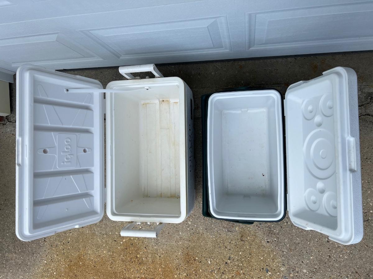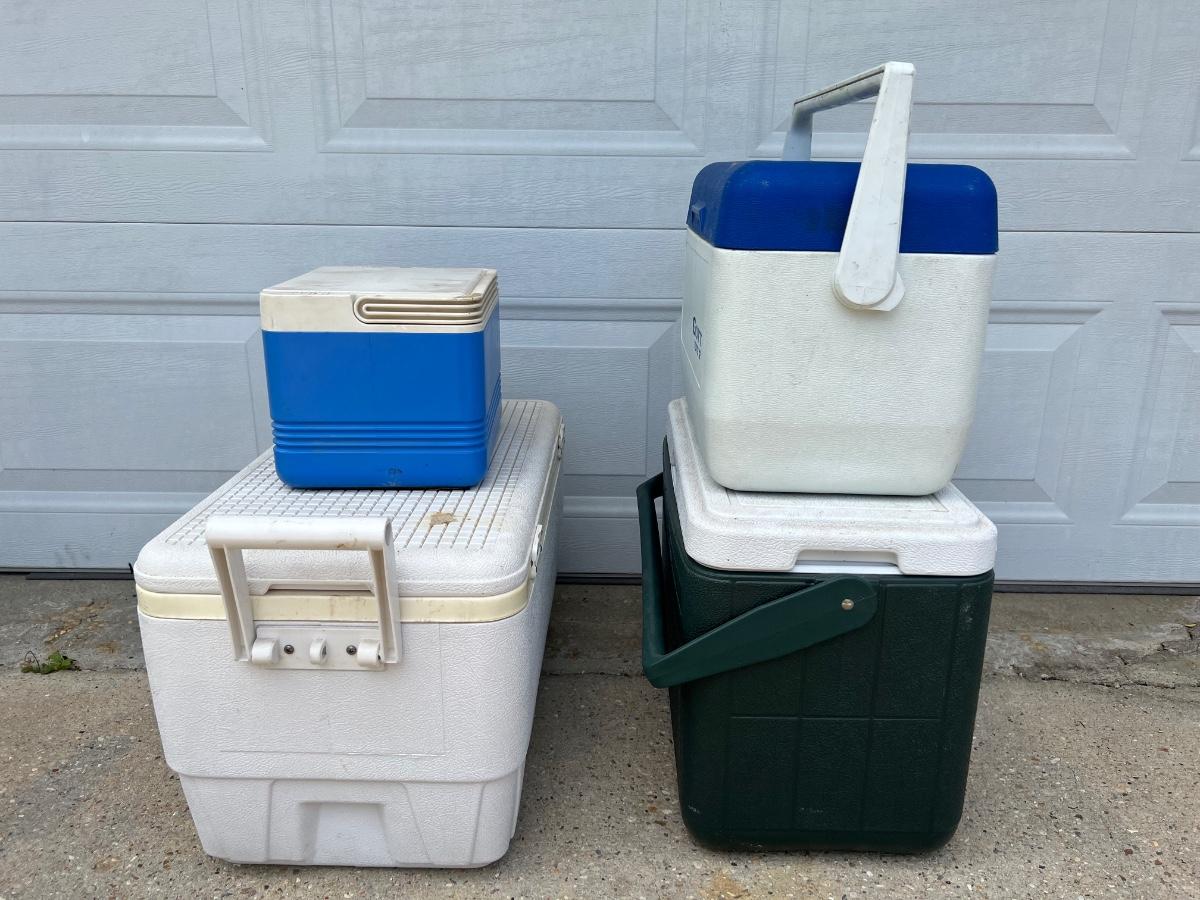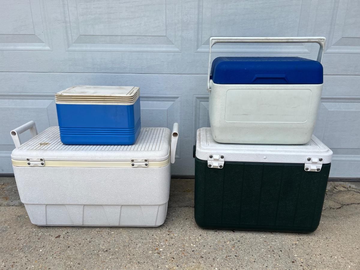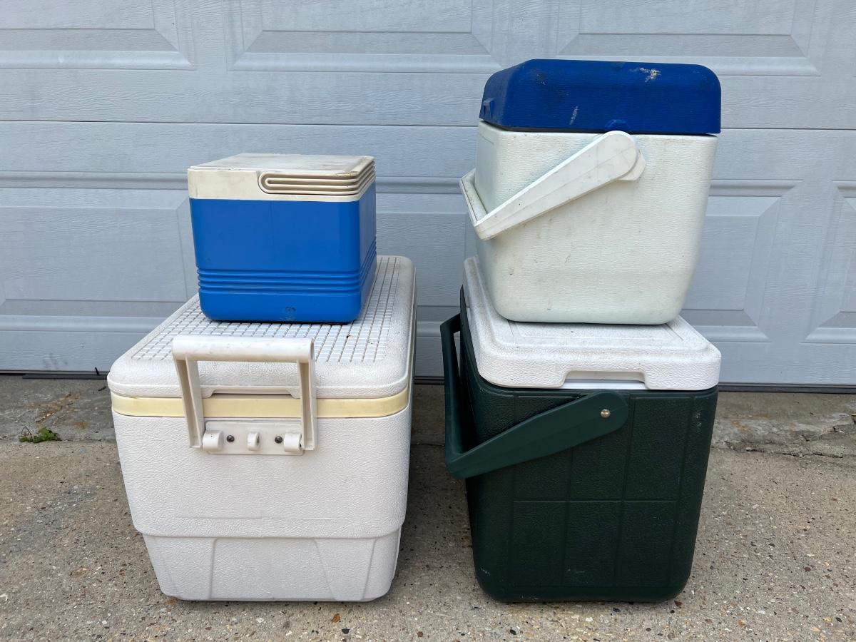 All in used condition. All hinges work and there are no cracks in the plastic. All 4 ice chests pictured are included.