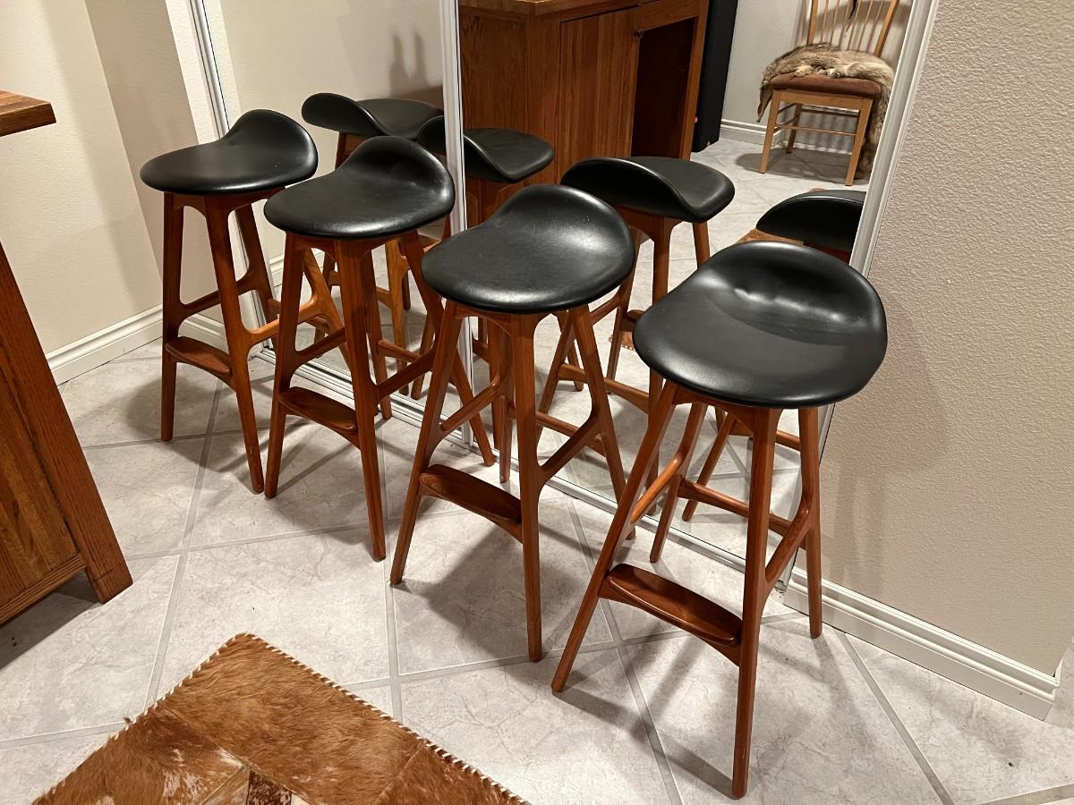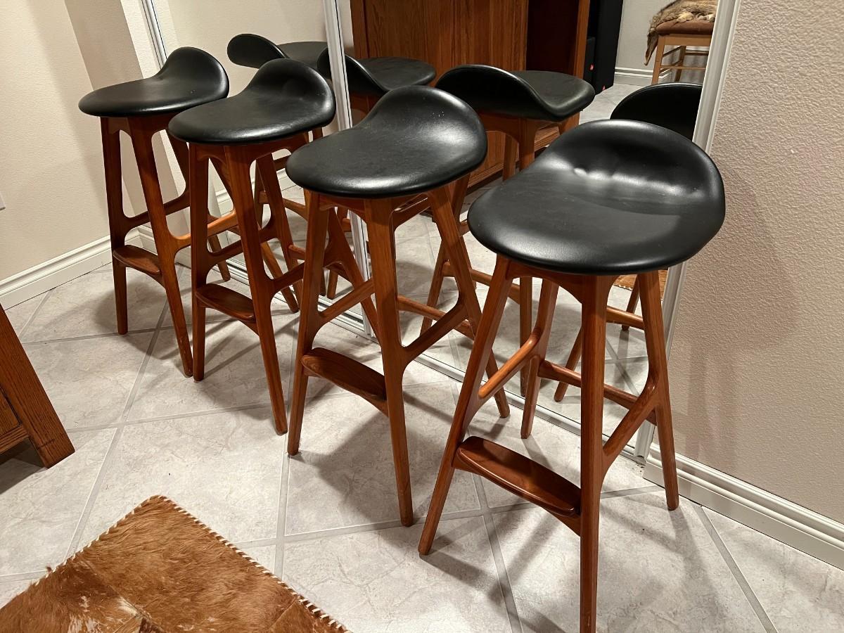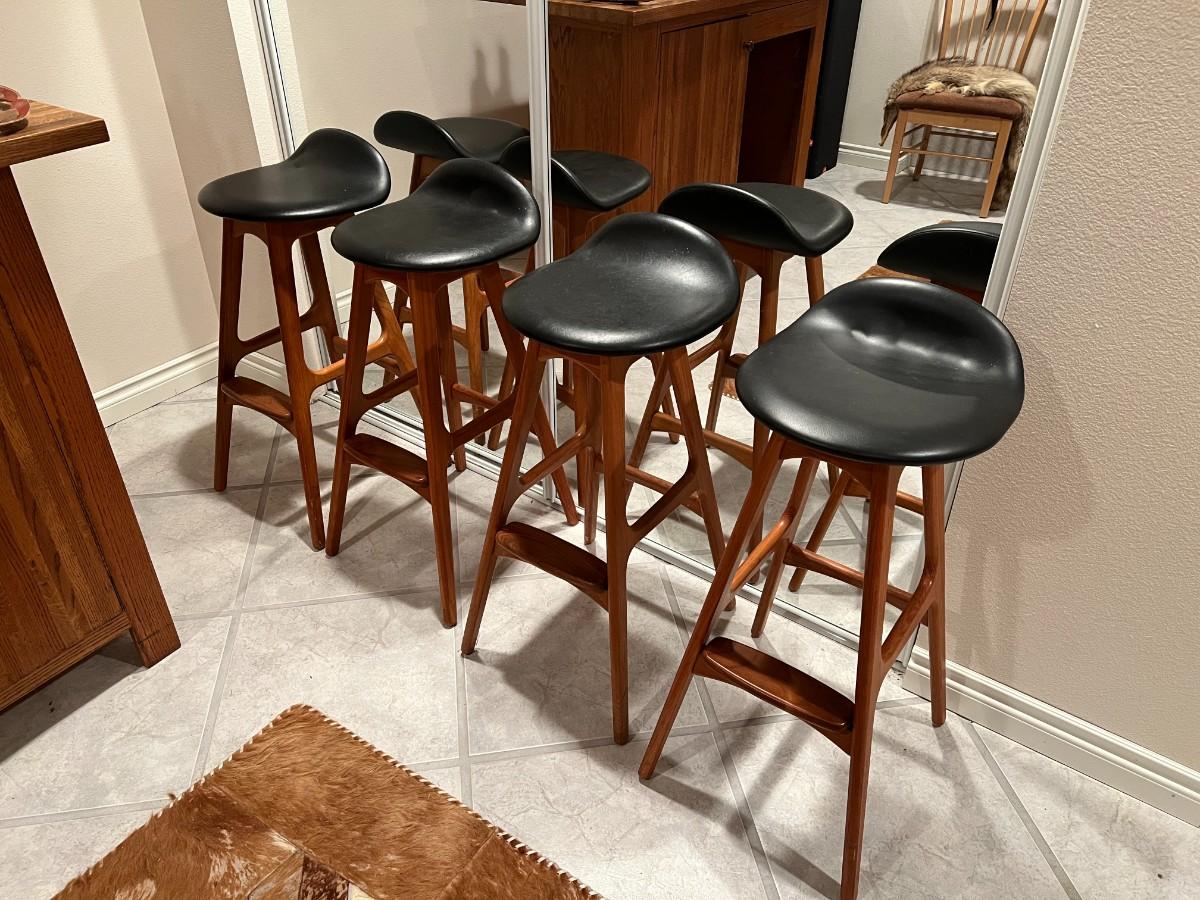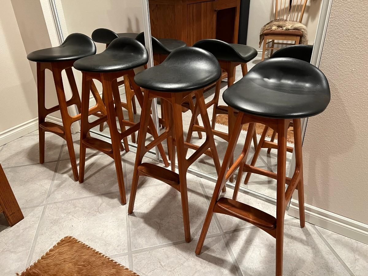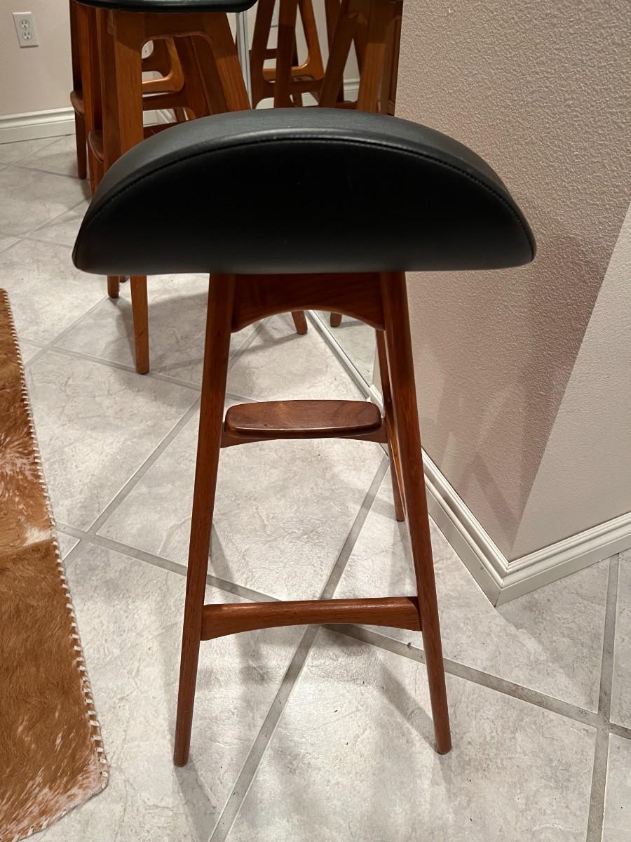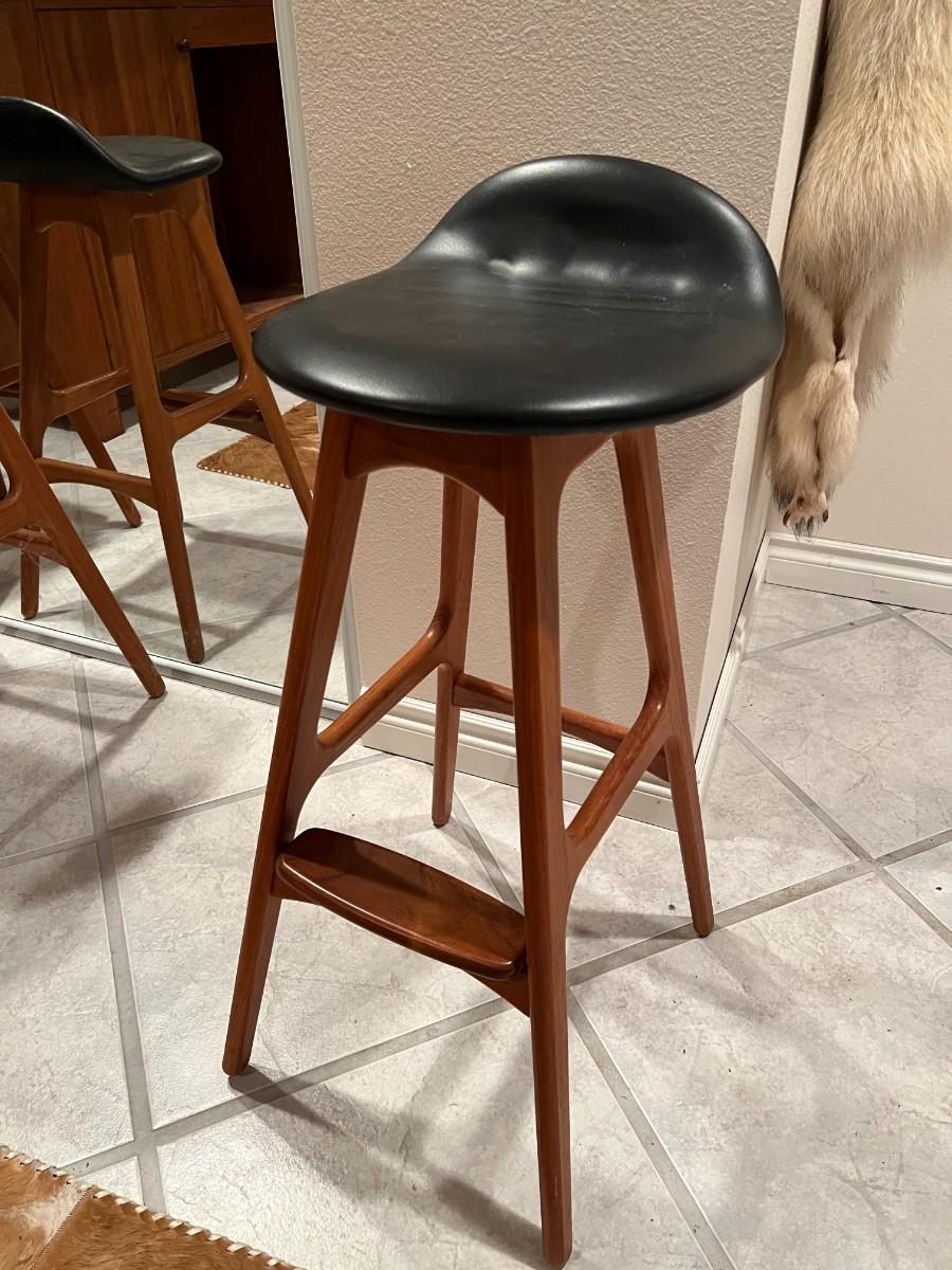 Lot of 4 Mid Century Modern O.D. Mobler Denmark Black Leather and Wood Bar Stools