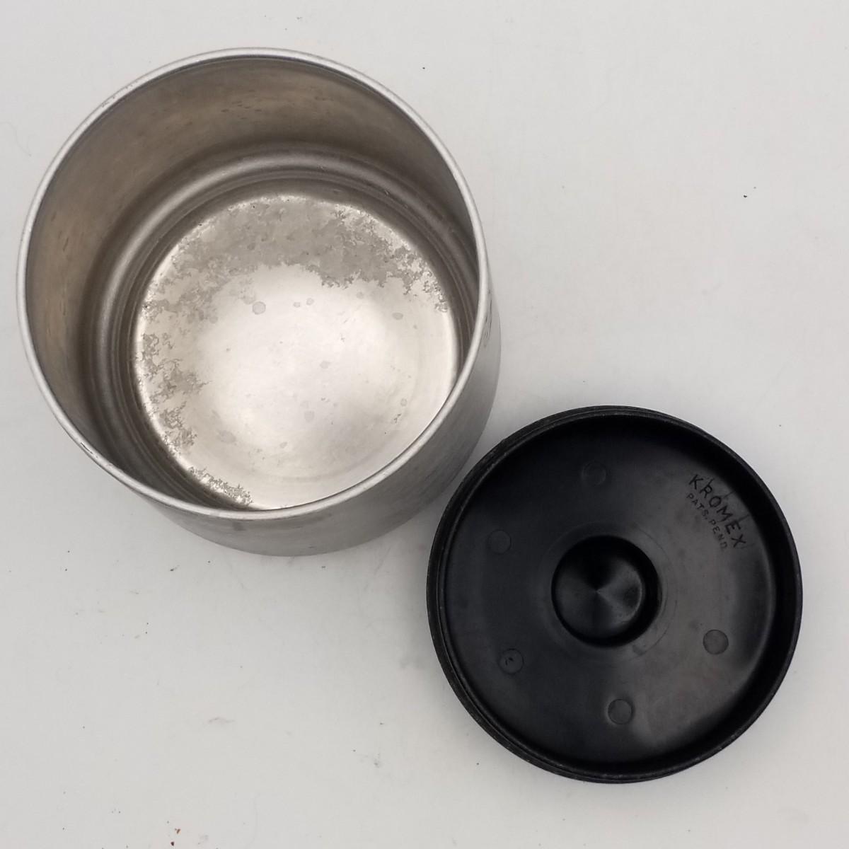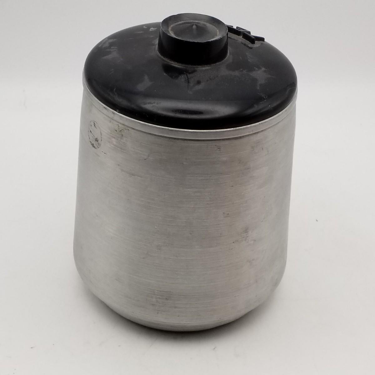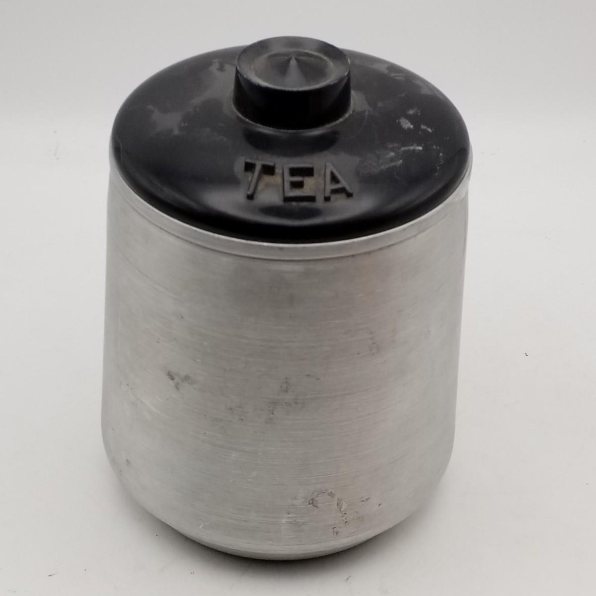Tapered Round Aluminum tea canister with black plastic lid, approximately 5 wide x 6 inches. Kromex mark.