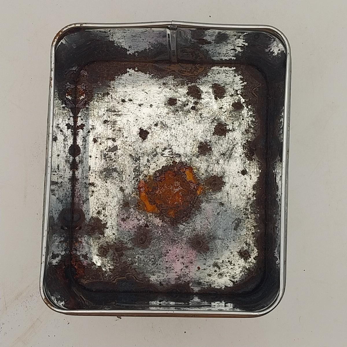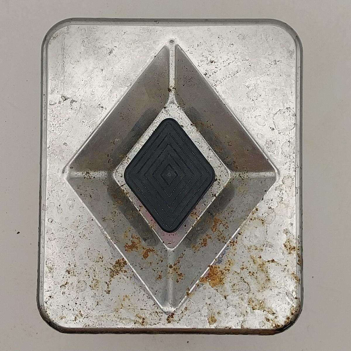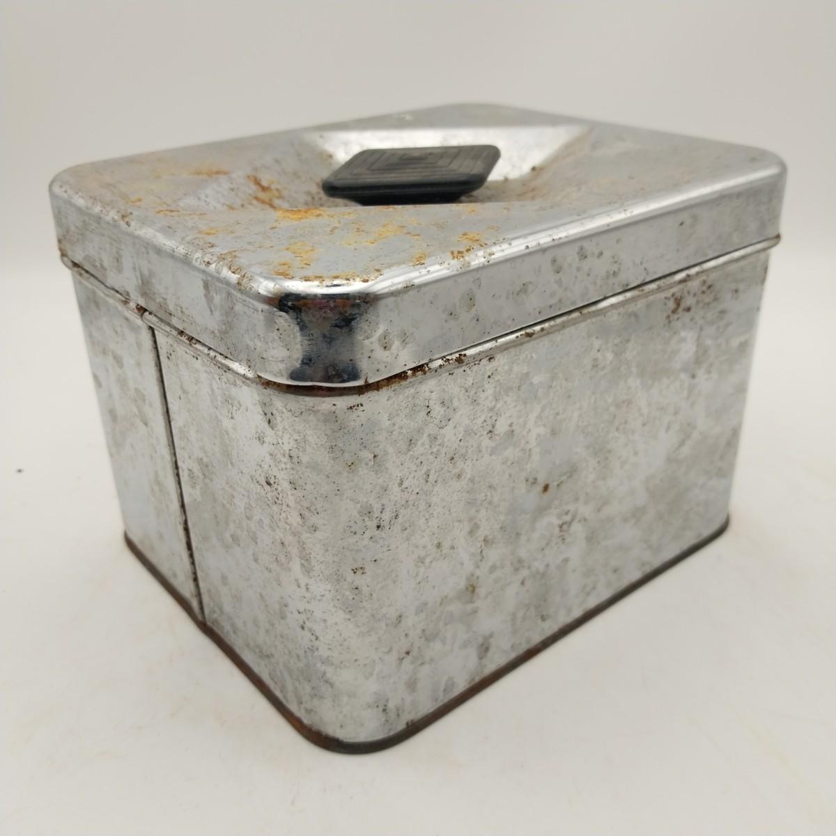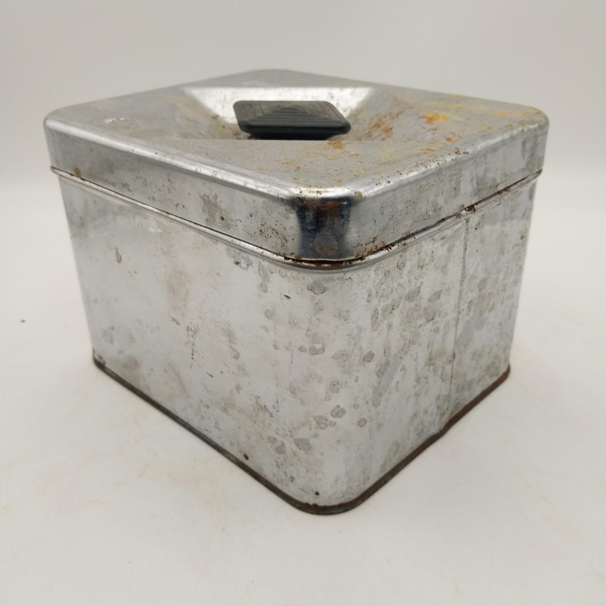 Tapered Round Aluminum tea canister with black plastic lid, approximately 5 wide x 6 inches. Kromex mark.