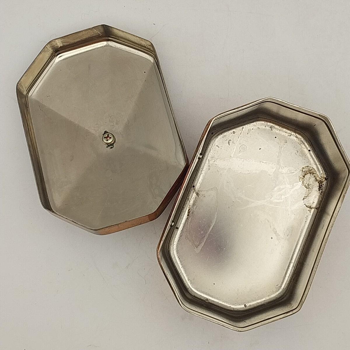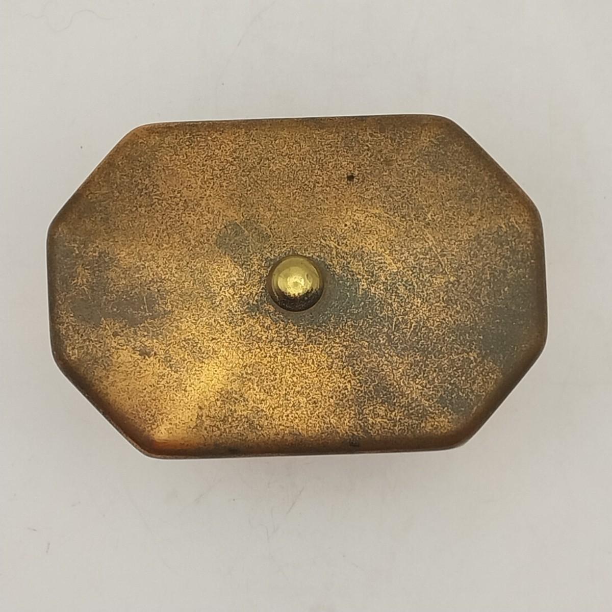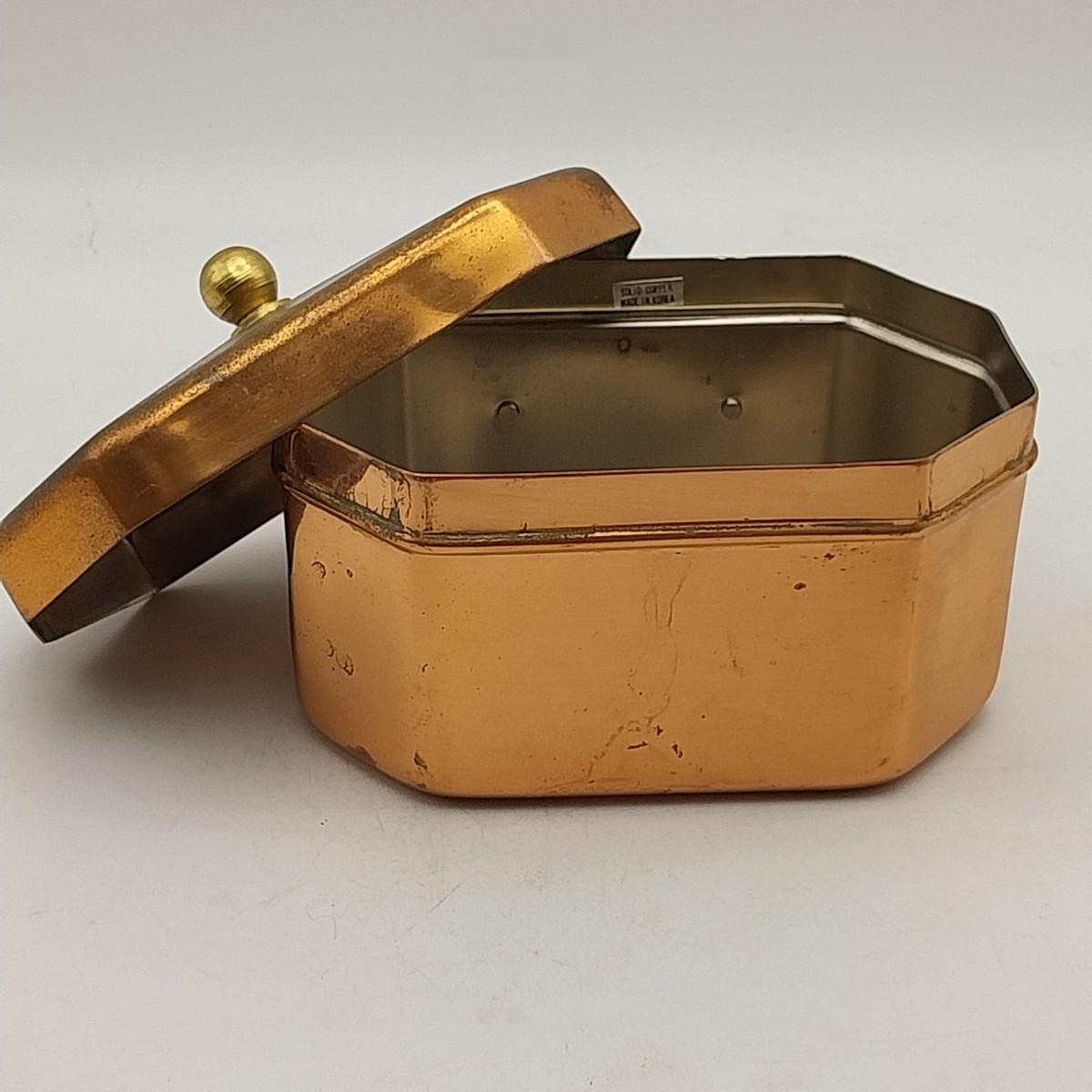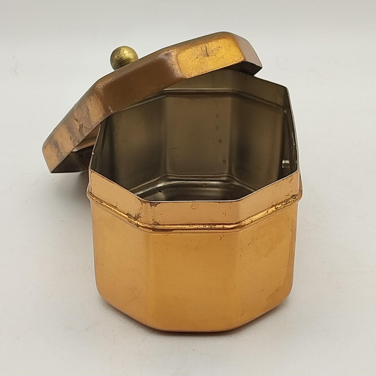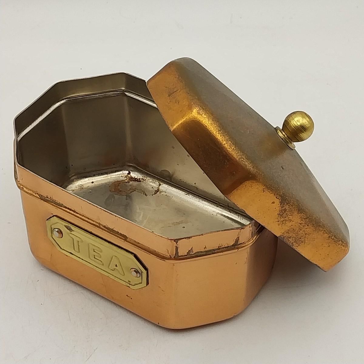 Copper and brass tea canister, approximately 4 wide x 3 x 3 1/2 inches. Unmarked.