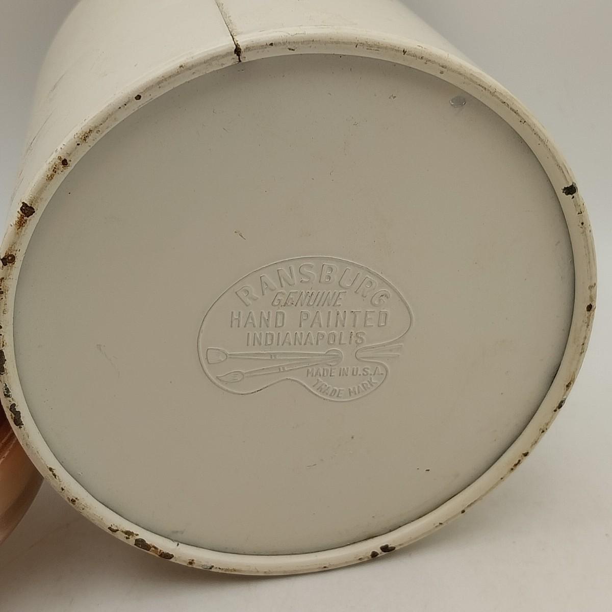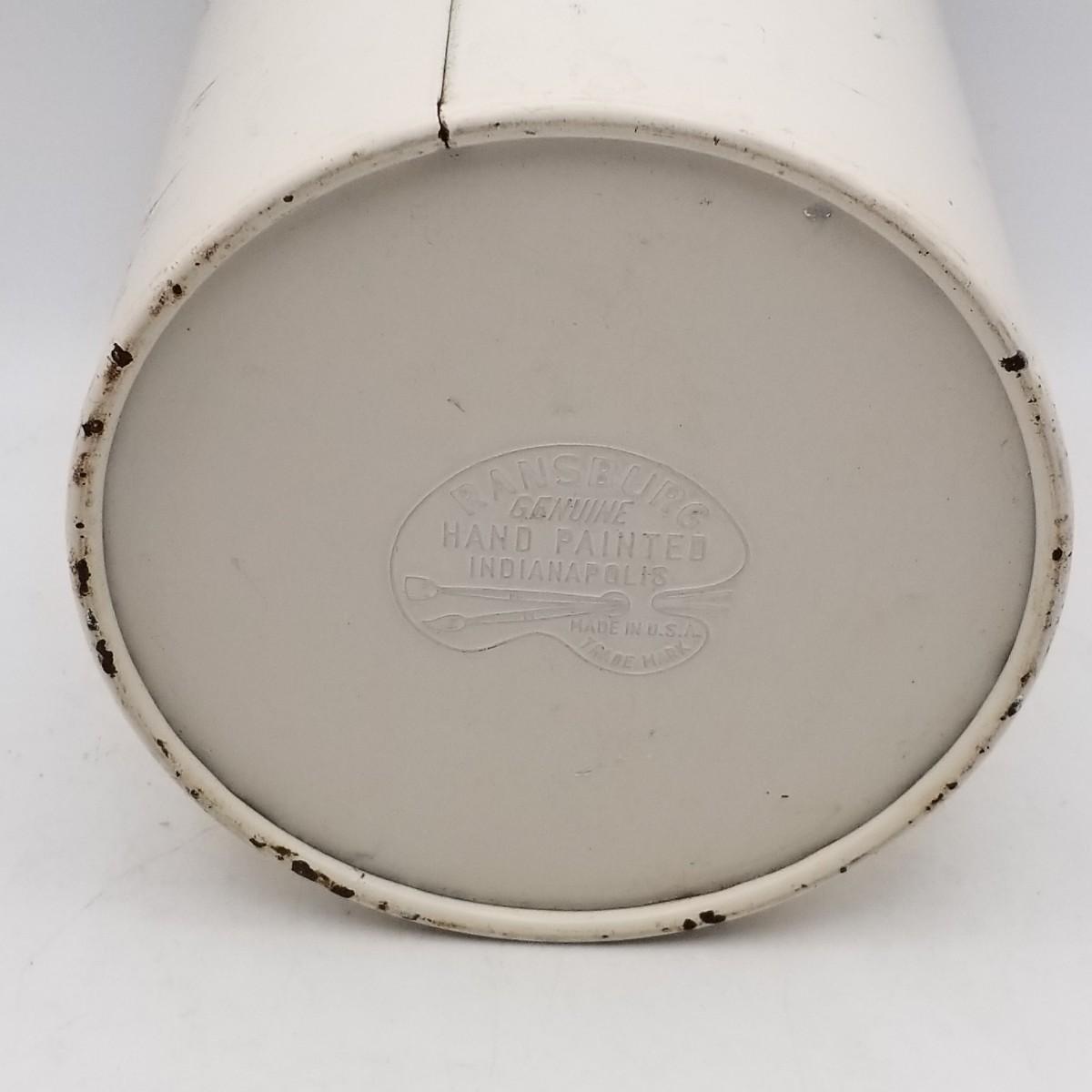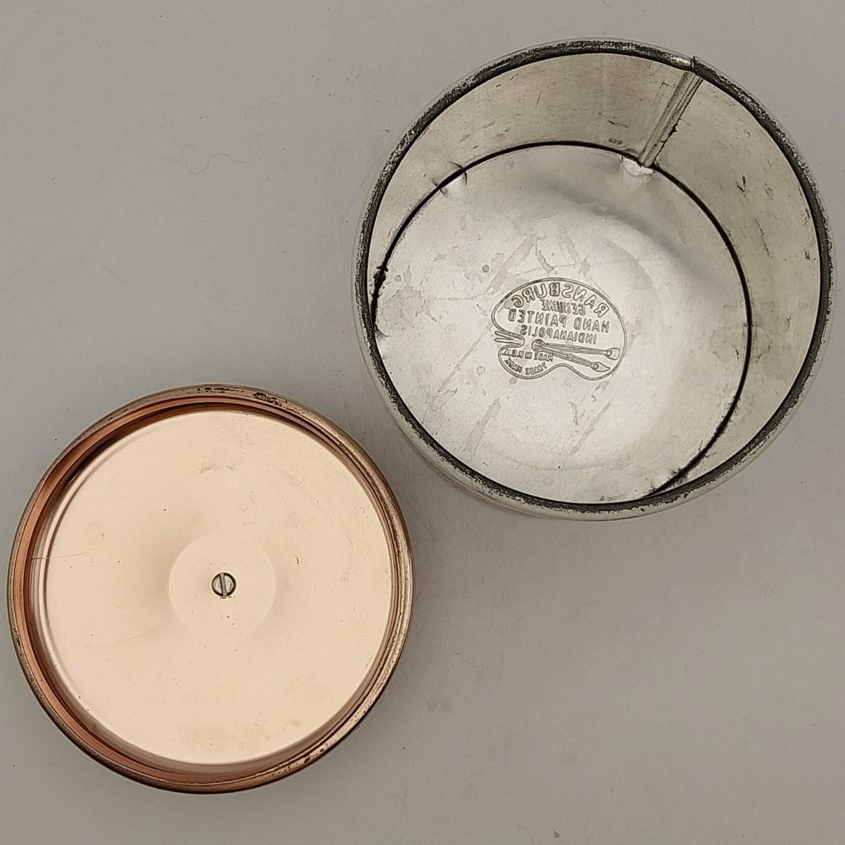 Round Beige Metal body and Lustre Pink Metal lid tea canister, with White Plastic Knob, approximately 4 wide x 6 inches. Ransburg Handpainted Indianapolis Made in USA mark.