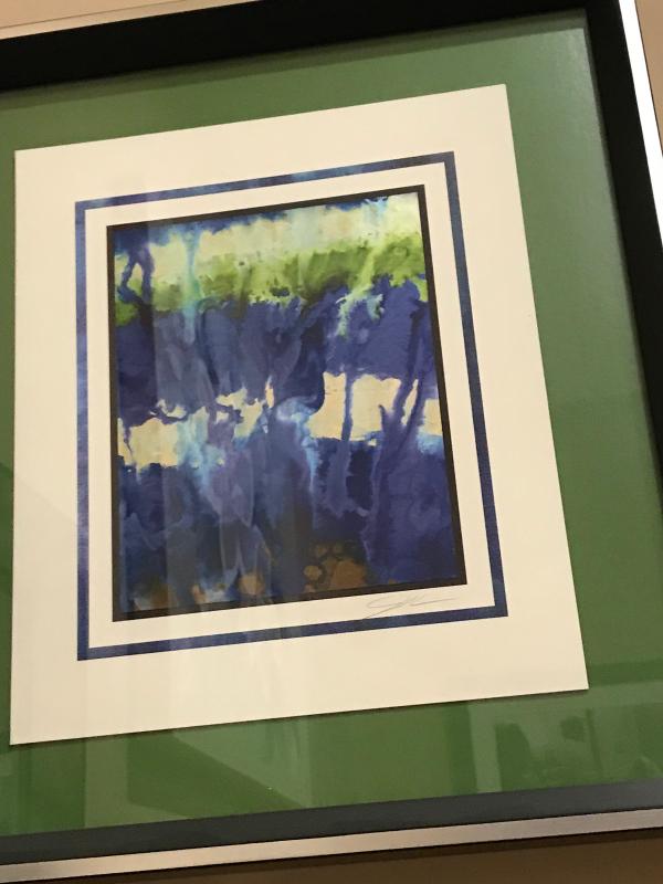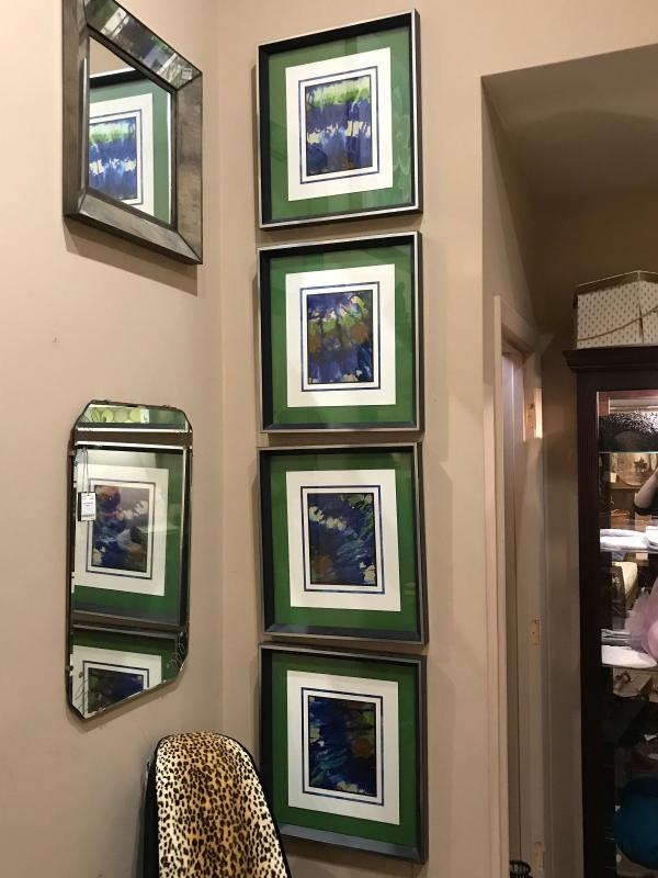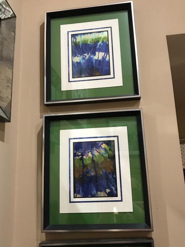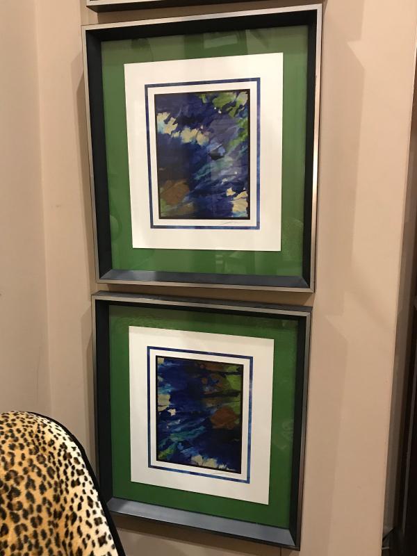 Collection of four matching modern watercolor prints framed in black and silver. Beautiful bright colors, in shades of blue, green, and brown. Emerald green matting. By New Century Picture Corp. Signed in lower corner (unintelligible). Each 17 1/2" x 19 1/2" H.