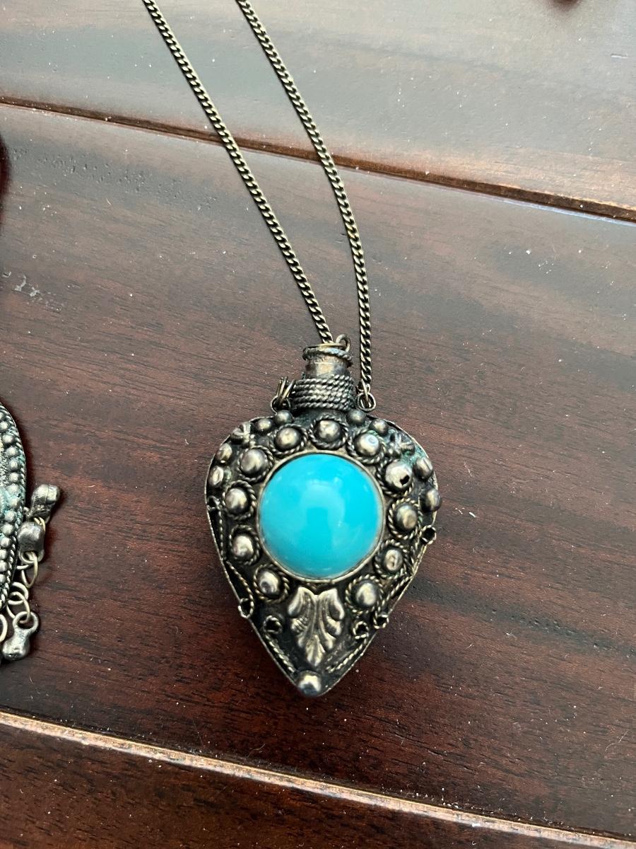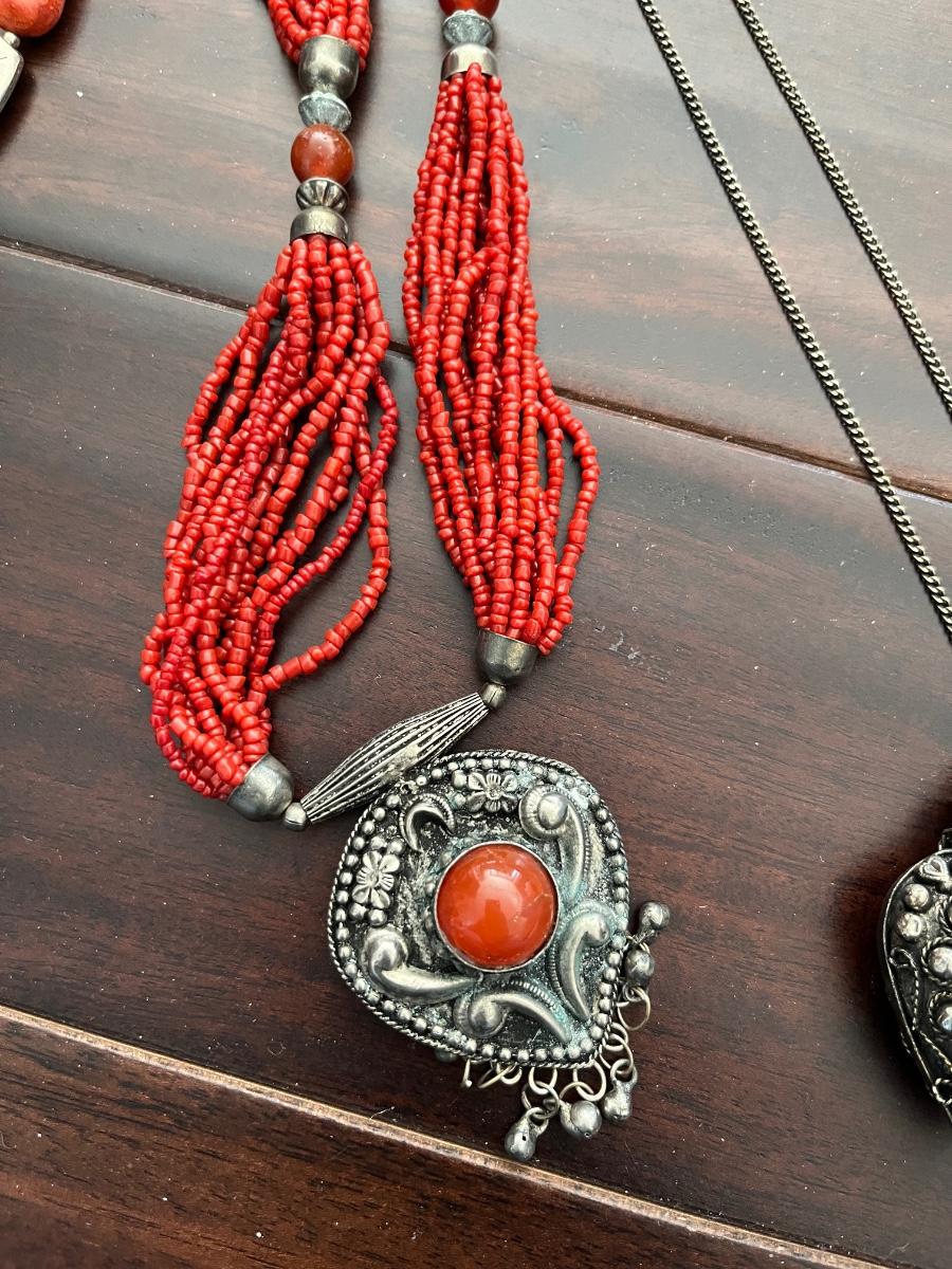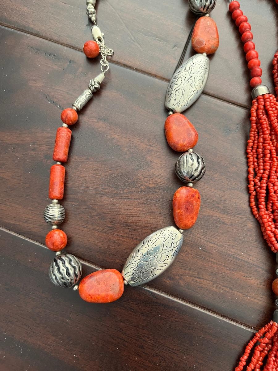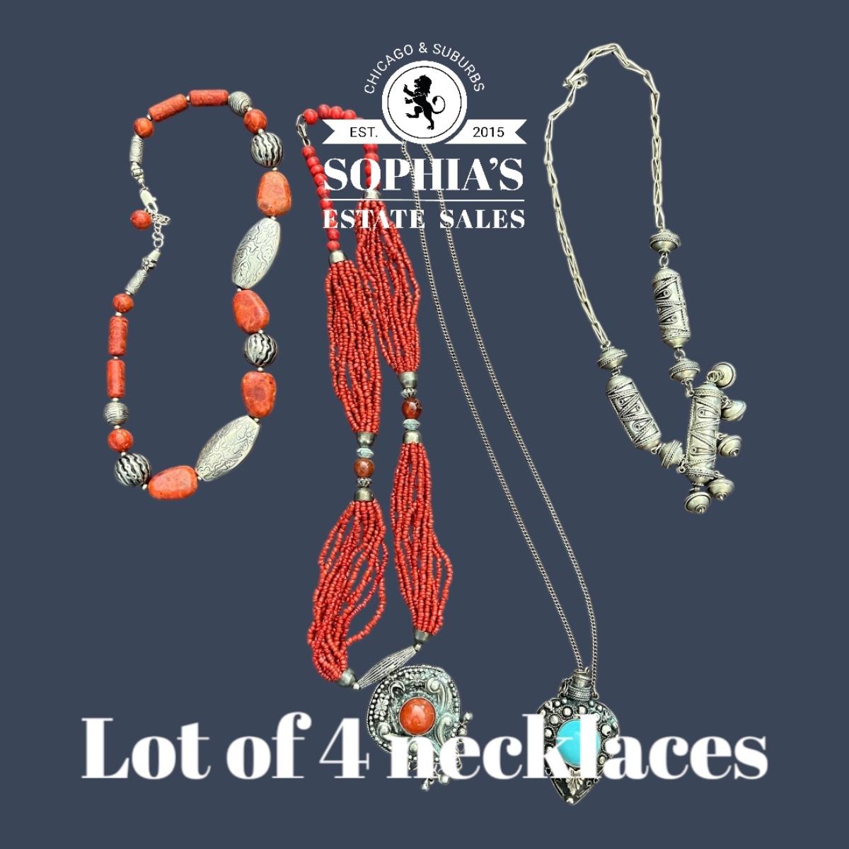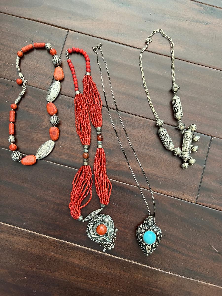 Lot of 4 Asian and ethnic style necklaces--coral, silver and turquoise.