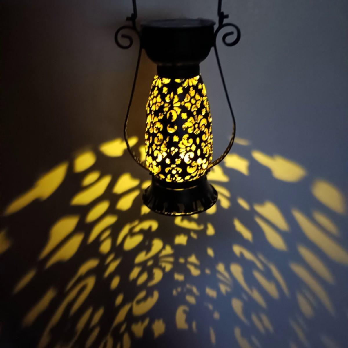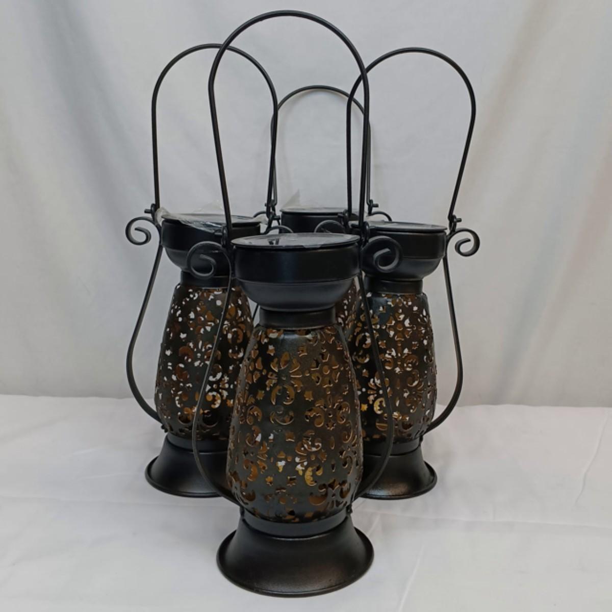 This lot of 4 solar powered LED lanterns are brand new. They feature a small solar panel to charge an internal battery that illuminates the LED light to produce a soft yellow color light. Each lantern measures approximately 9" tall from the base to the top of the lantern and approximately 14" from the base to the top of the handle.