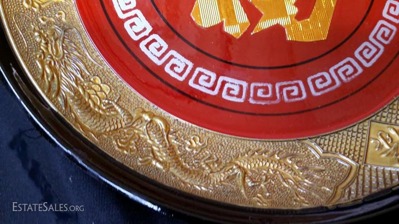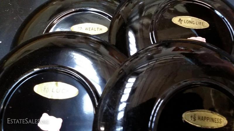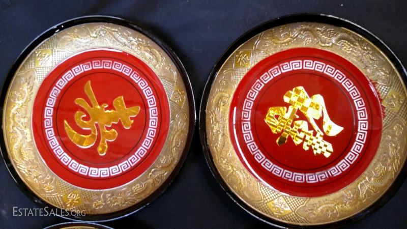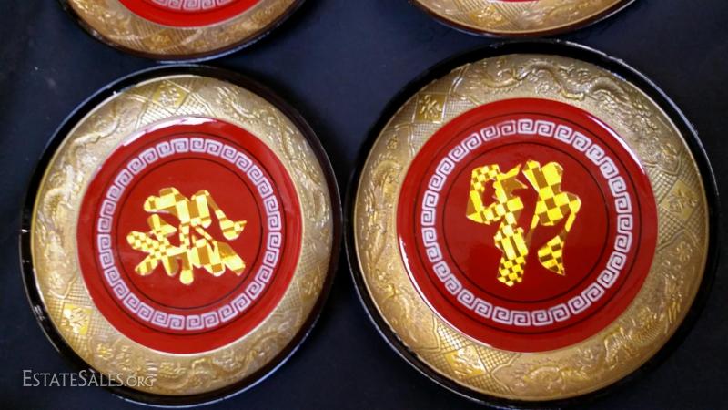 Lot of 4 Norleans Japan Lacquerware fortune plates with beautiful details-Plates are approx. 6.5 inch diameter engraved with Wealth, Good Fortune, Happiness and Long life