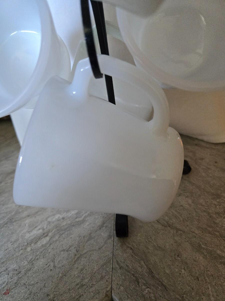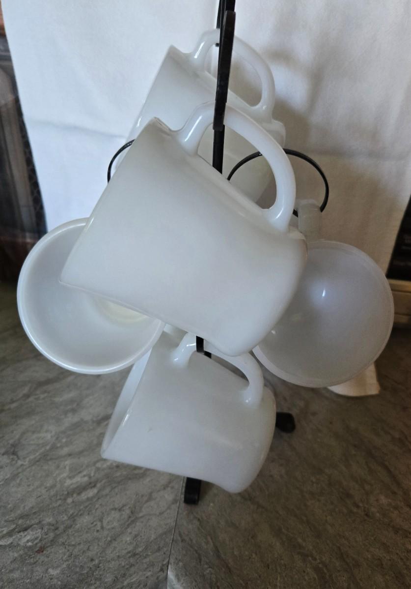 6 FireKing mugs in true opal, includes the cute metal cup holder