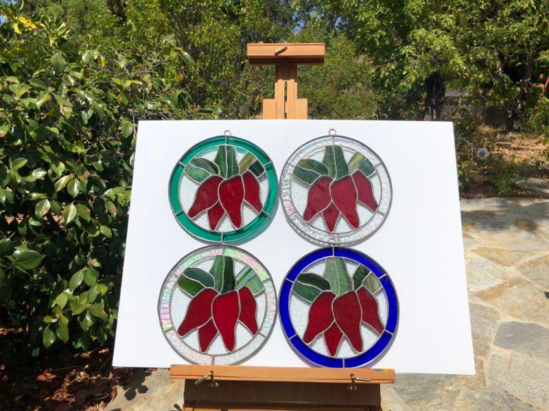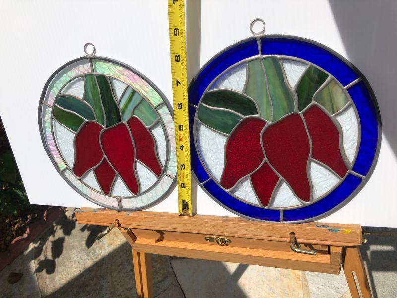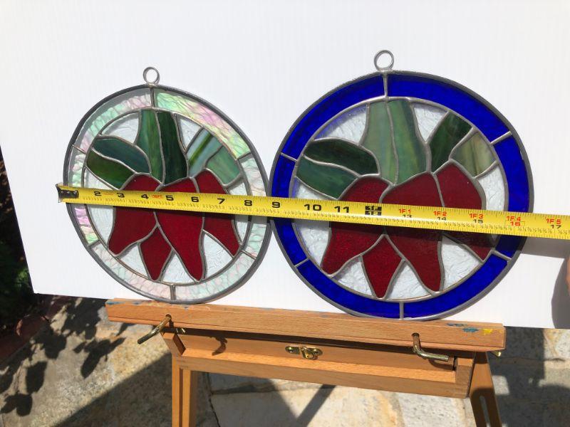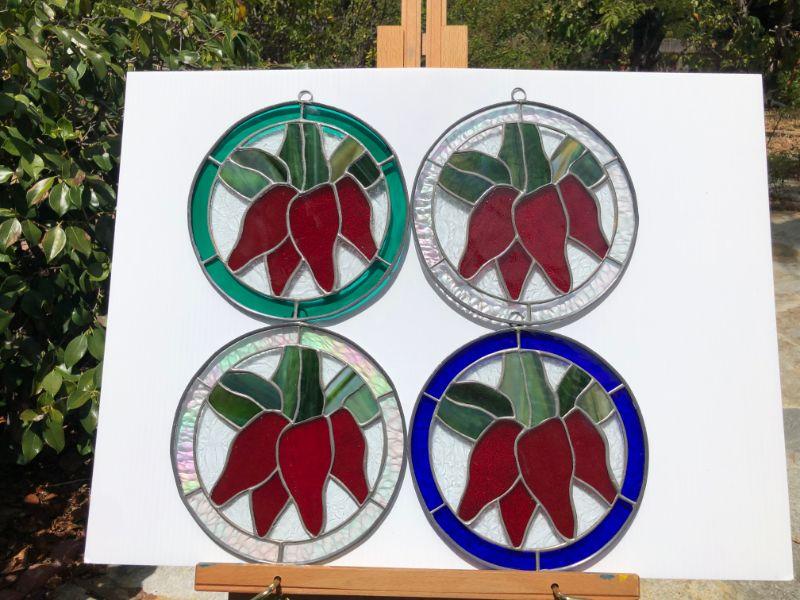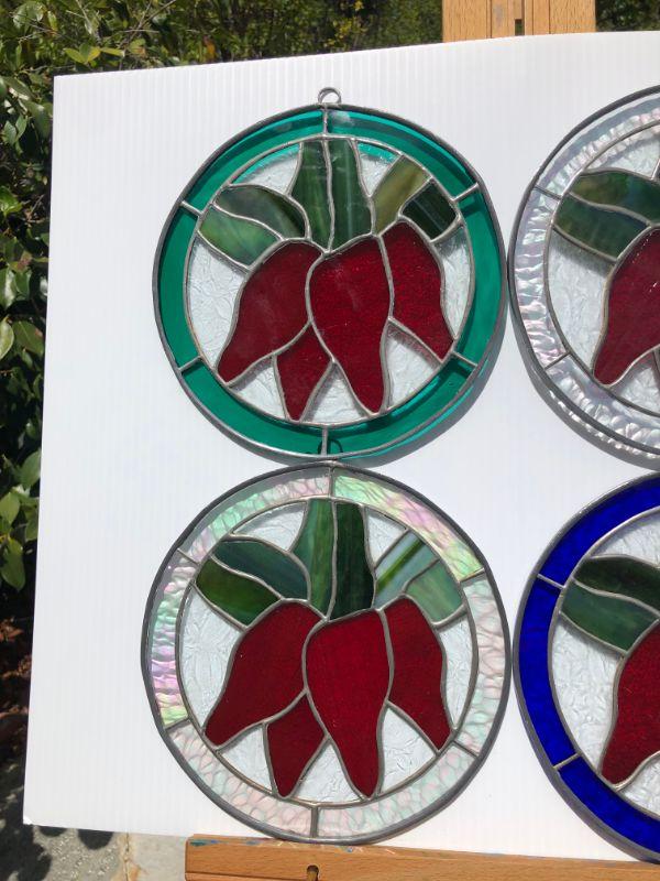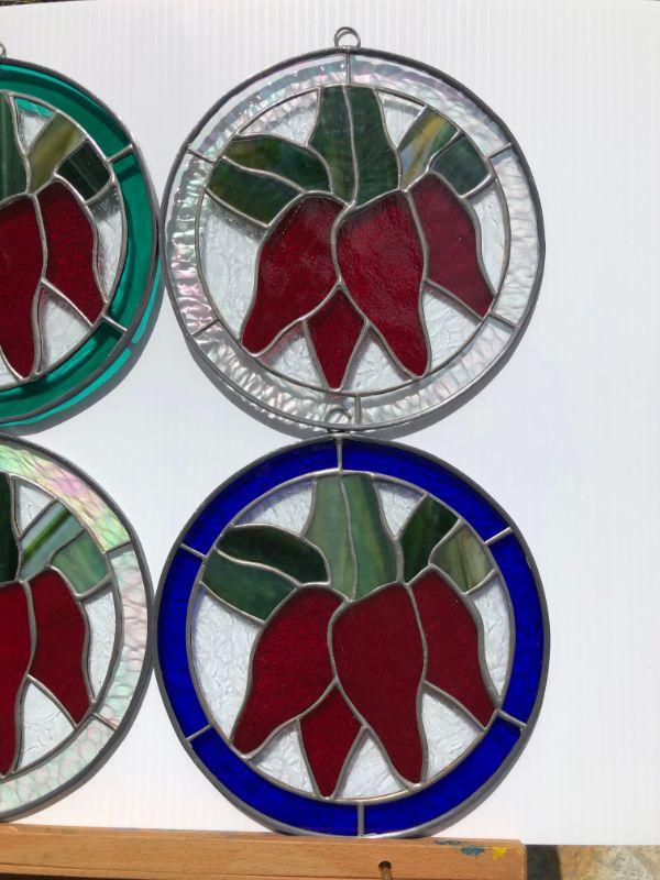 4 beautiful circular stained glass windows, with red peppers (or flowers) in the center. Two of the windows are framed by iridescent glass, one has green, and the other has blue. In very good condition.