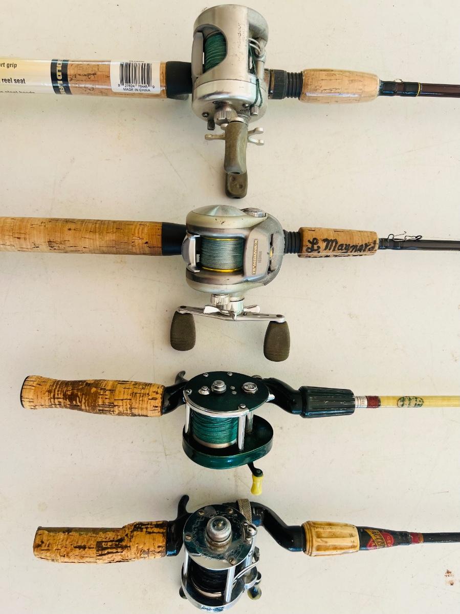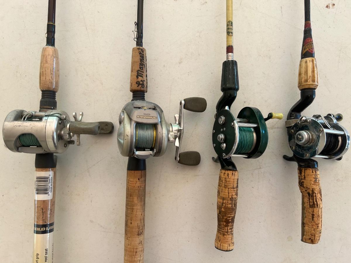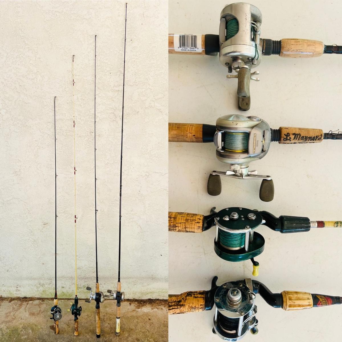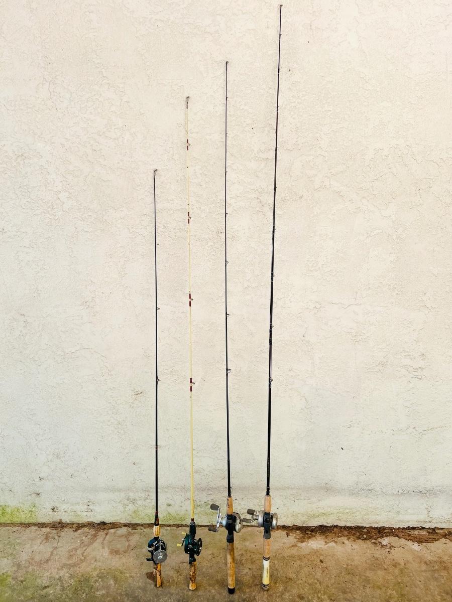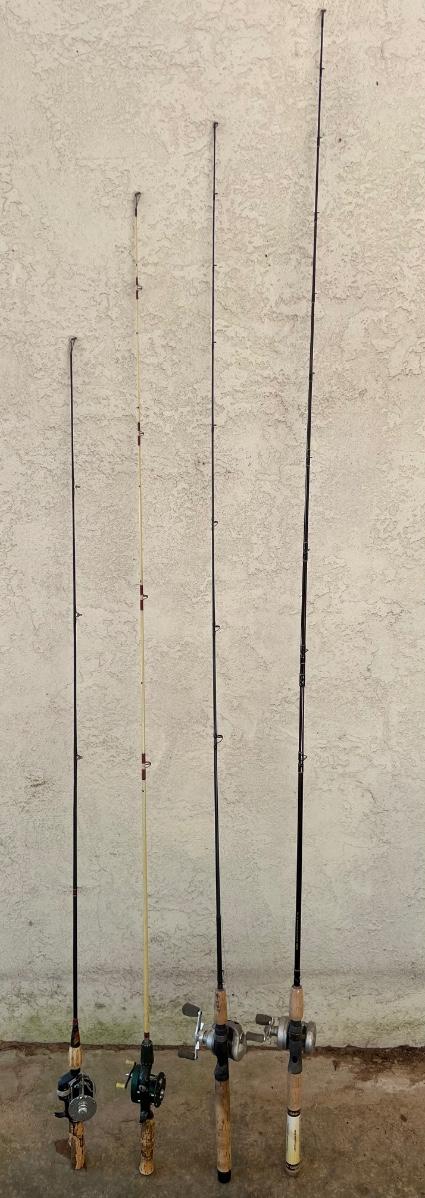 Lot of 4 rod & reel combos. See pictures for brands and condition. Smallest rod does have some damage to handle(see picture). Smallest rod is 5ft. and tallest is 6ft. 6in. Rods do not have any cracks or damaged eyes.