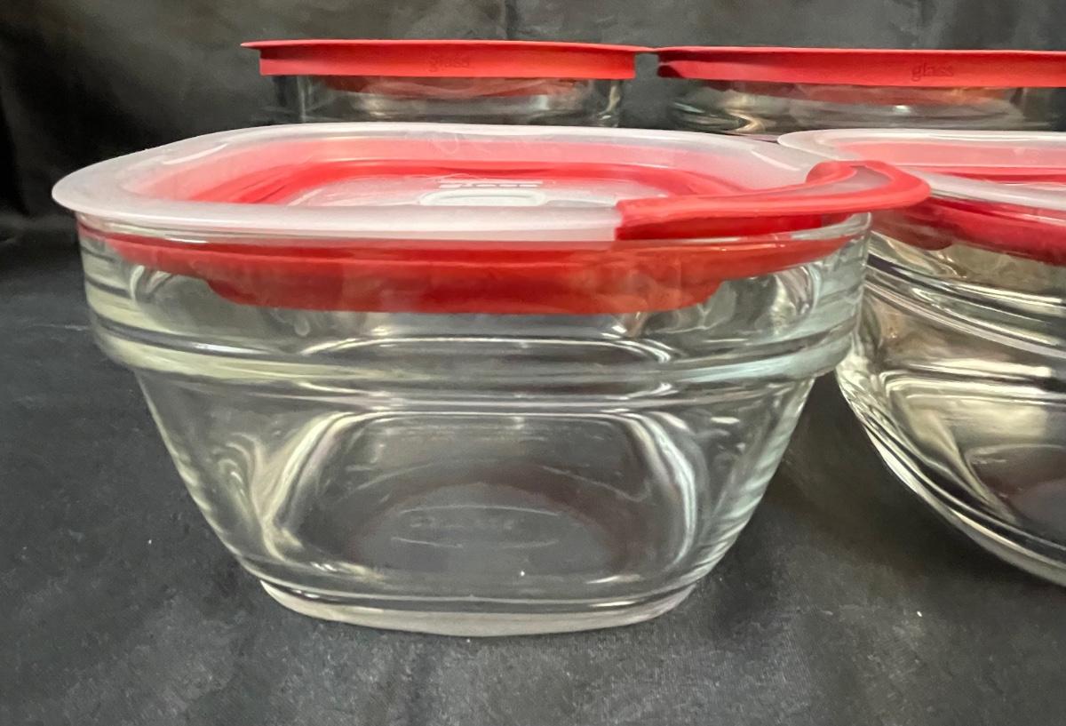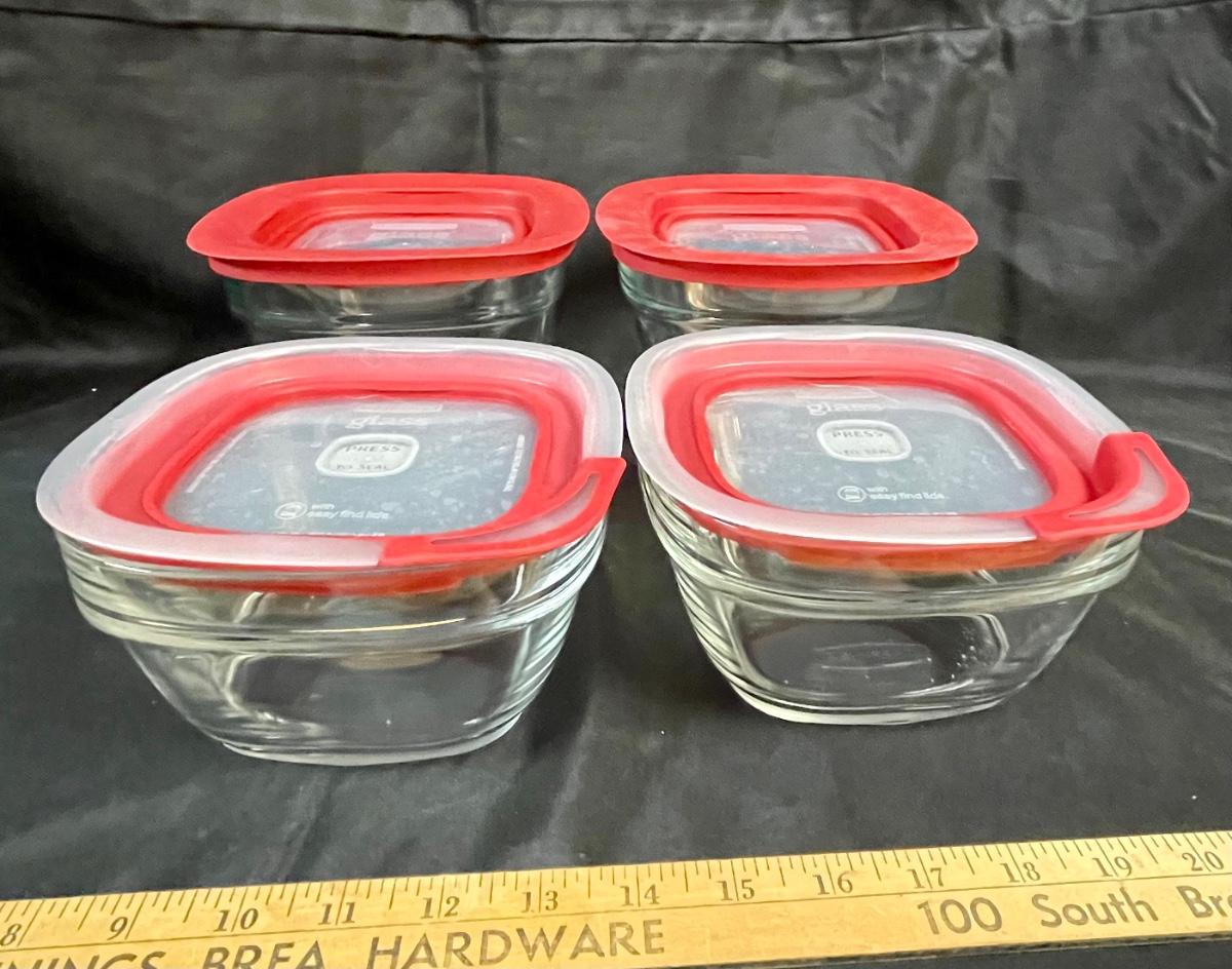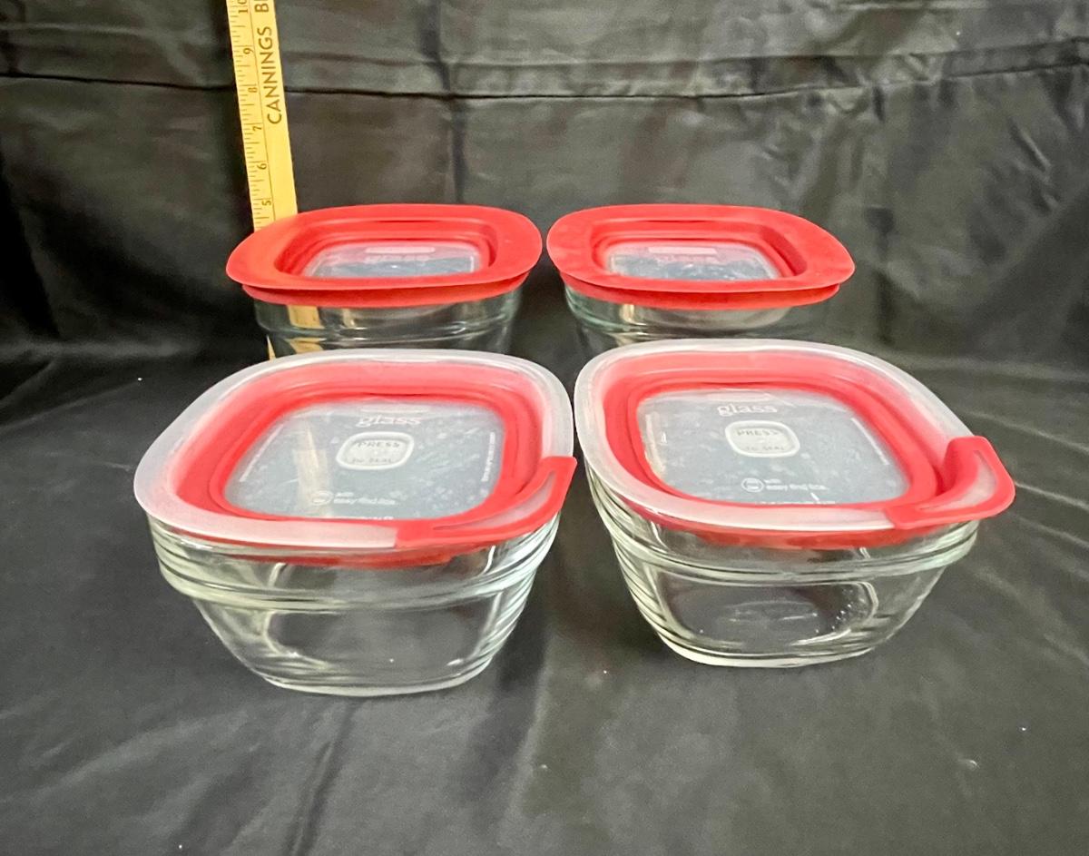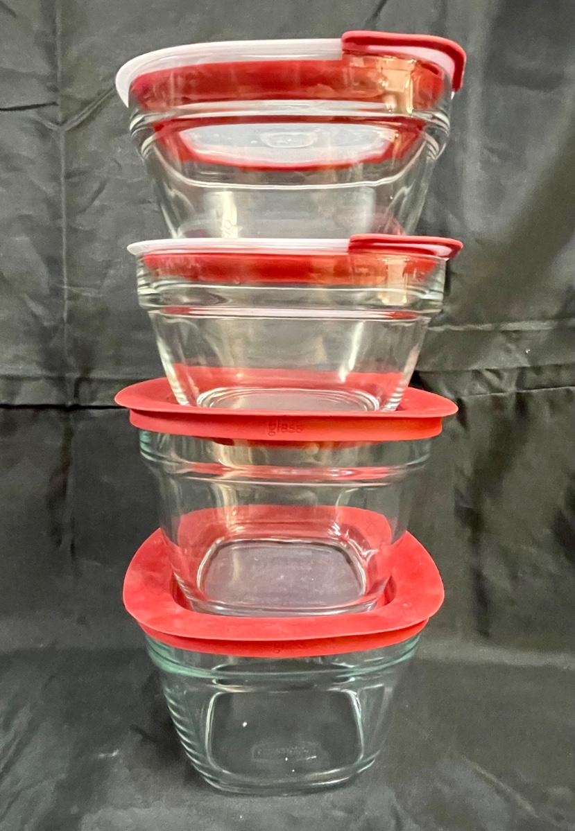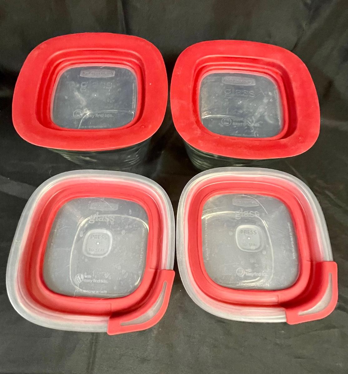 Four Square Rubbermaid food storage containers, glass with plastic lids. In good used condition.