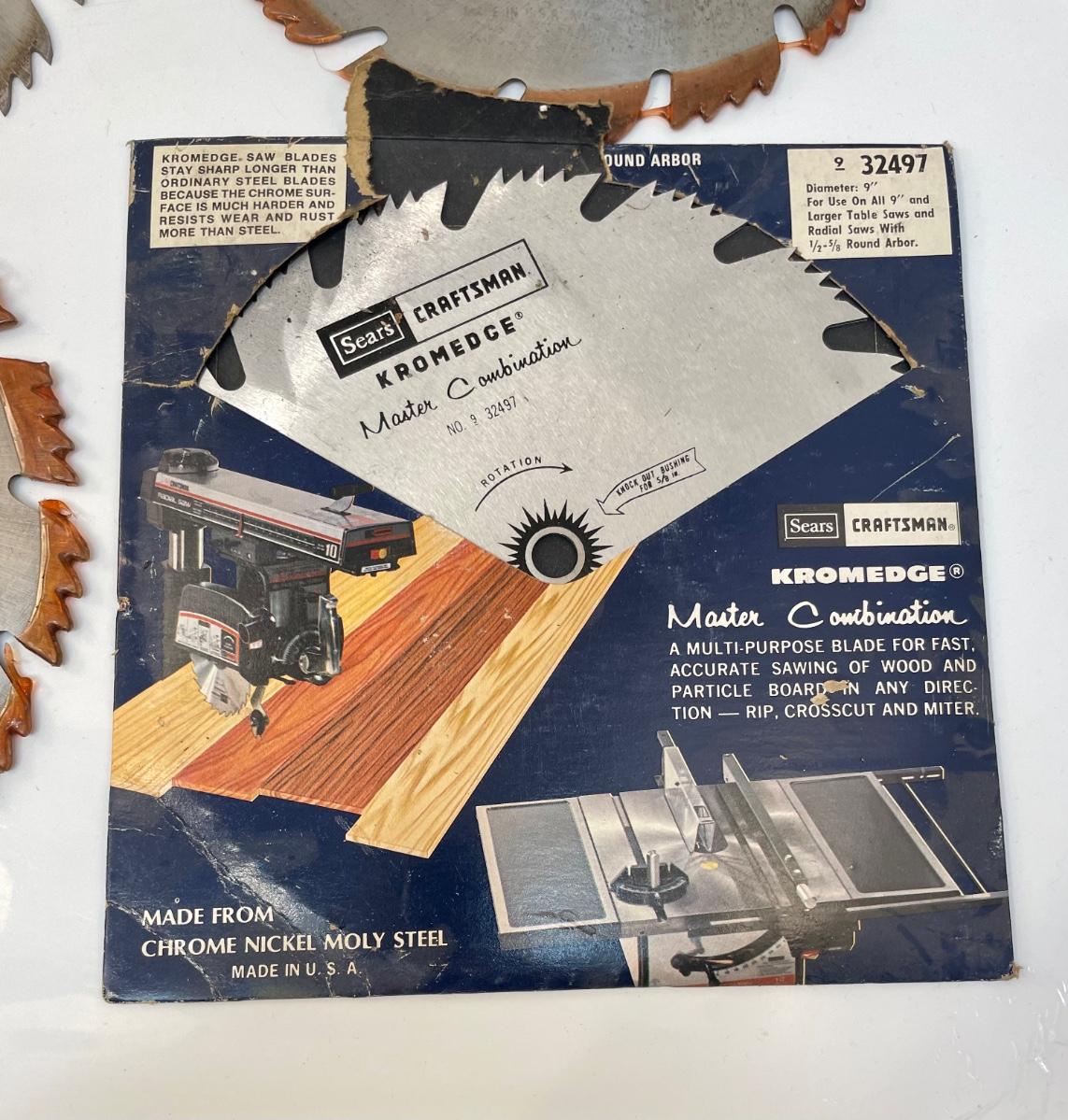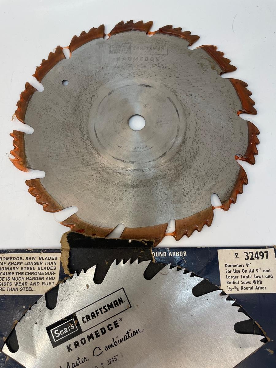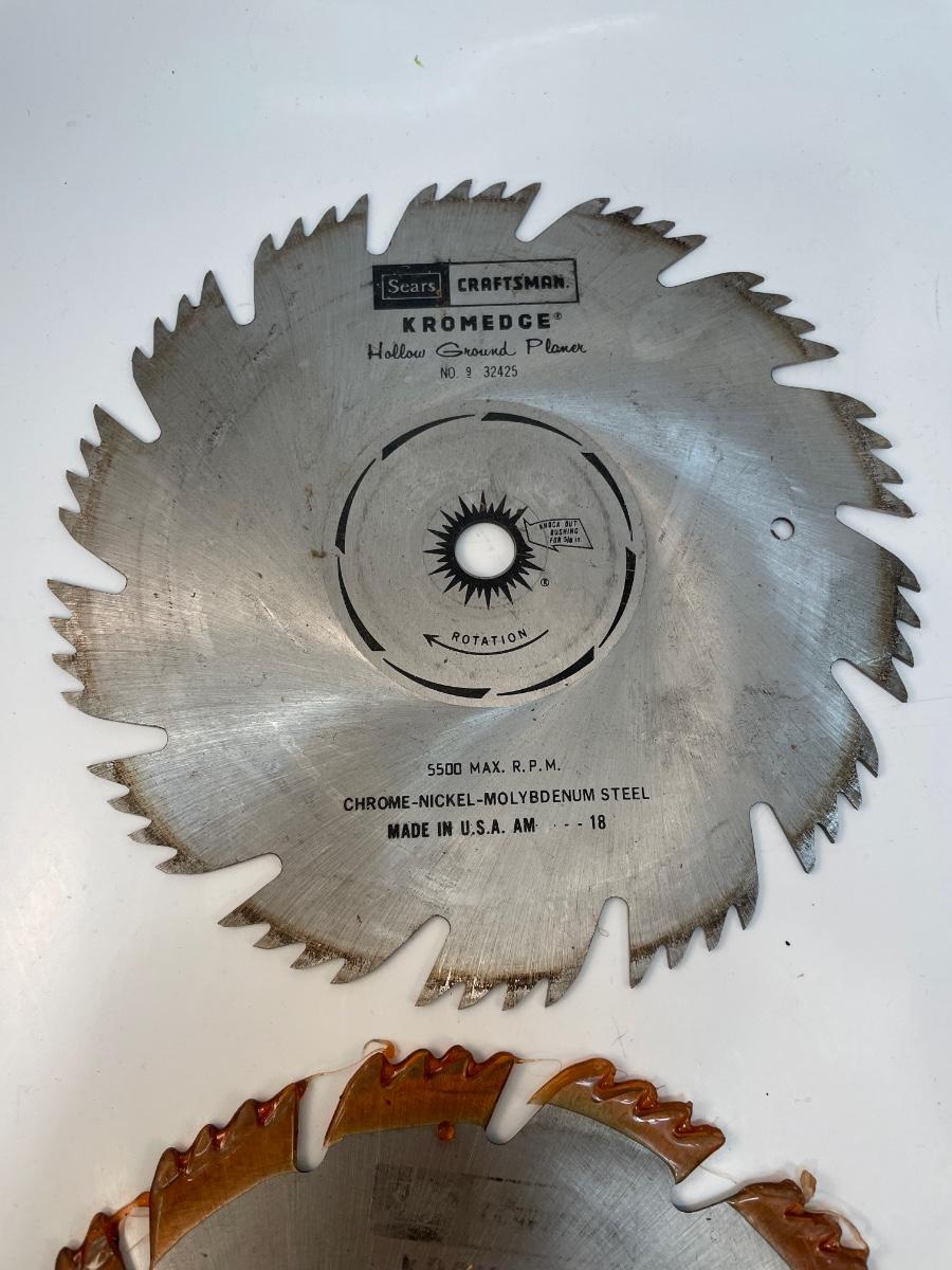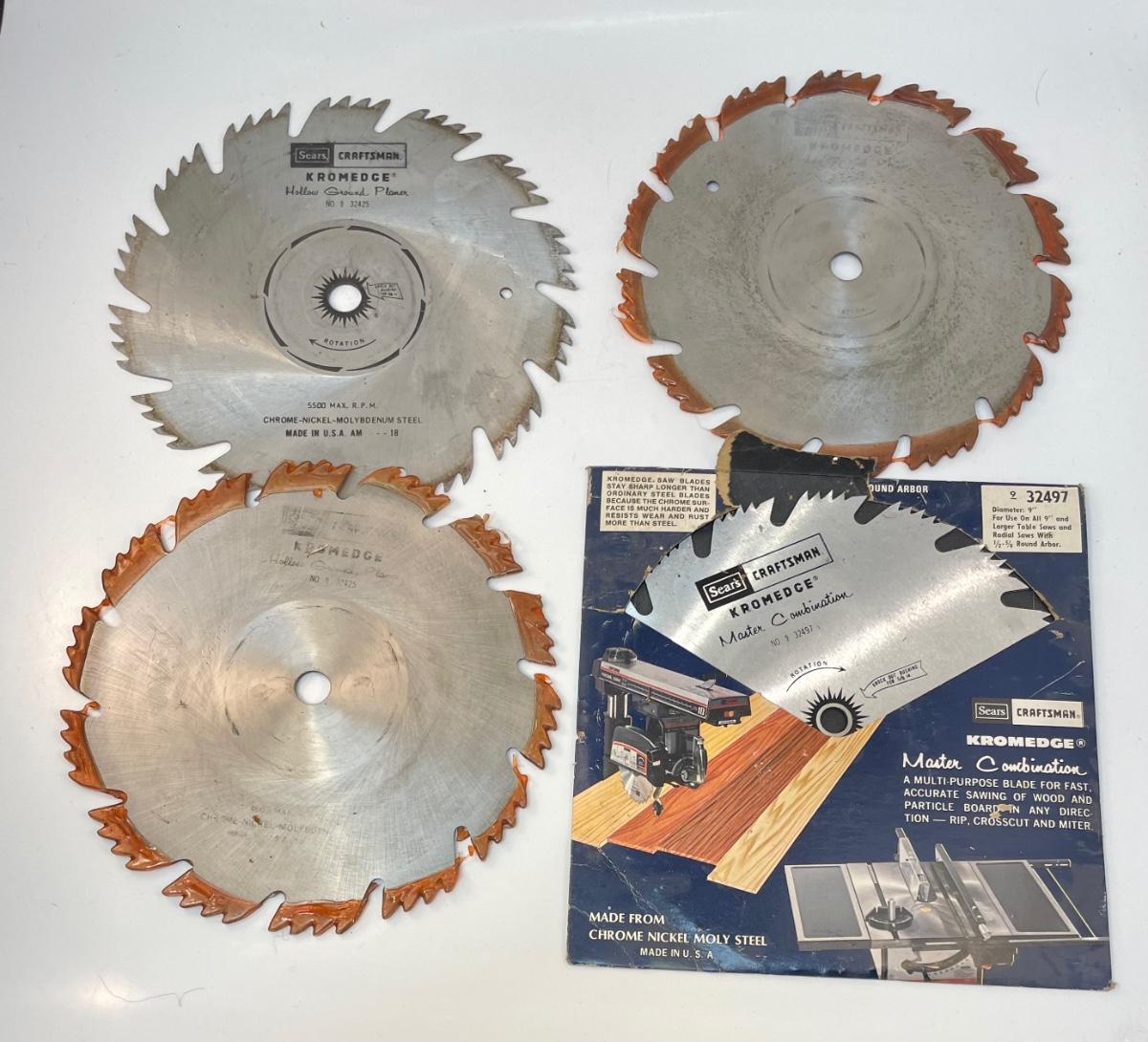 4 used 9” table saw or radial arm saw blades, Craftsman Kromedge made from chrome nickel molybdenum steel.