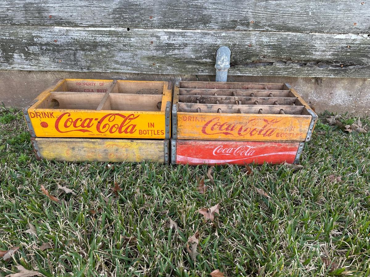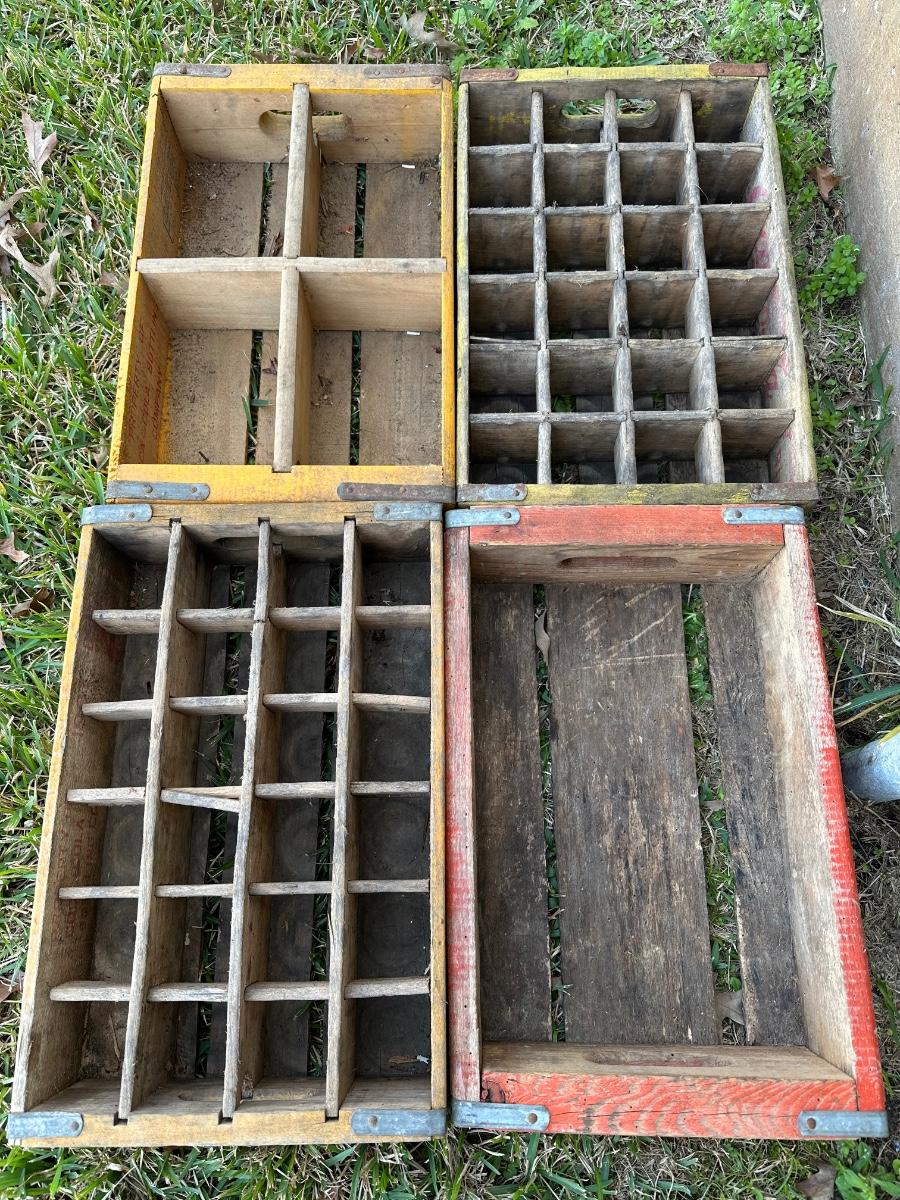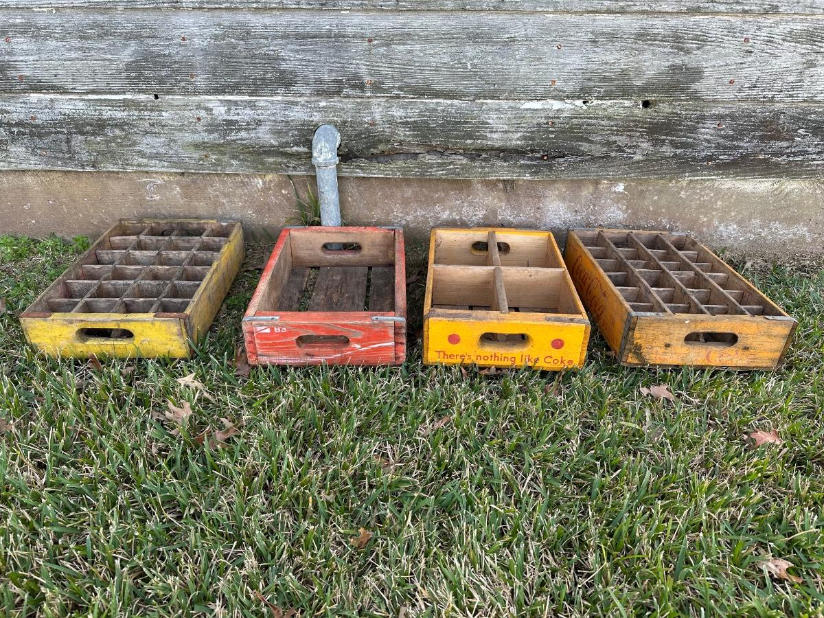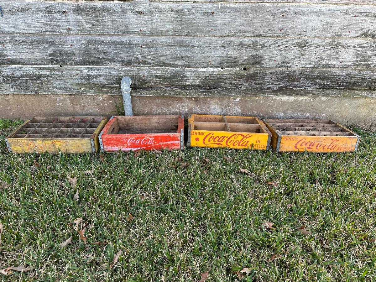Lot of four original vintage Coca-Cola wooden bottle crates in mixed styles and colors.