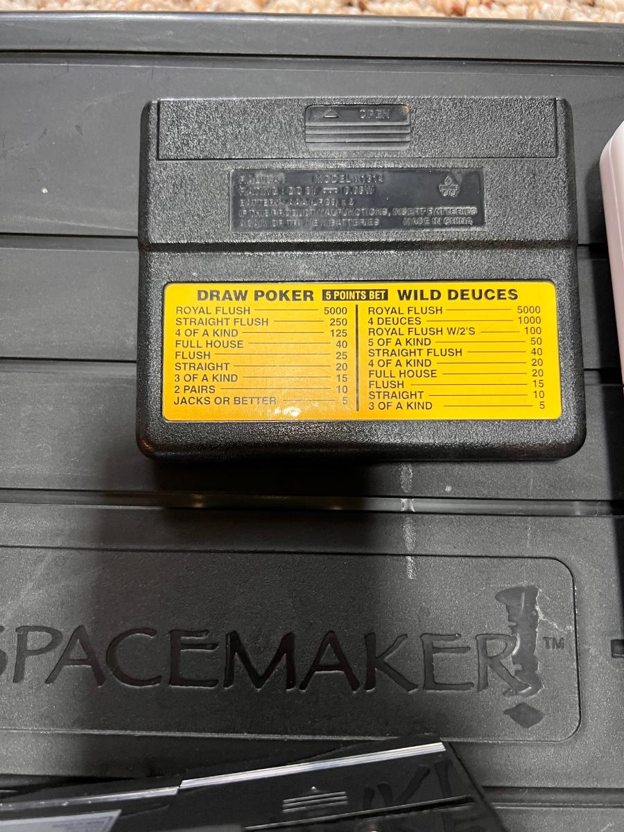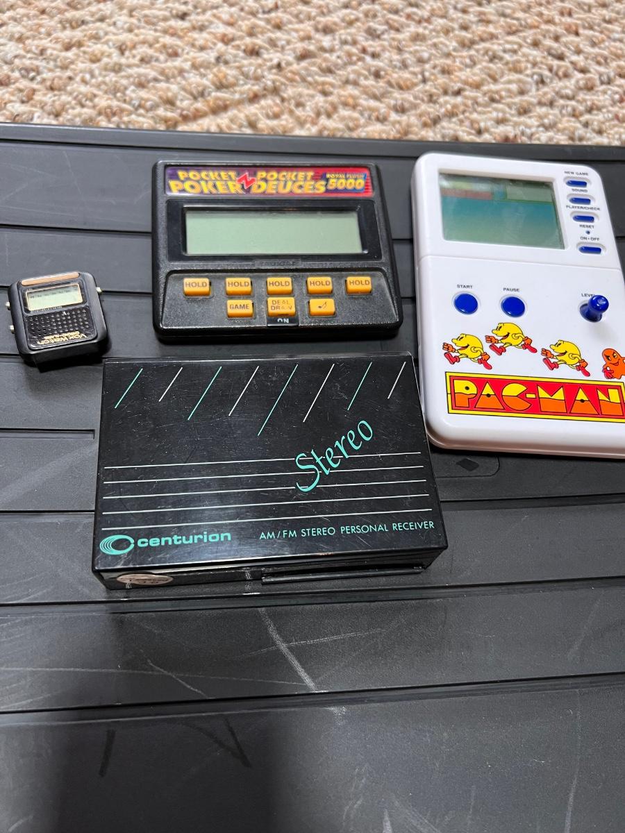All are untested and sold as is. Cassette player Walkman, Pac-Man game, poker game and part of VoxWatch for parts only.