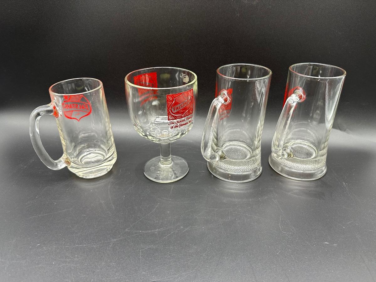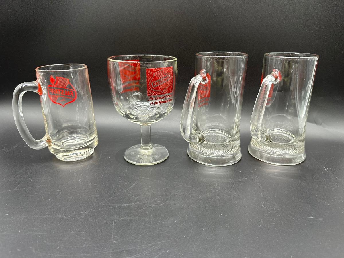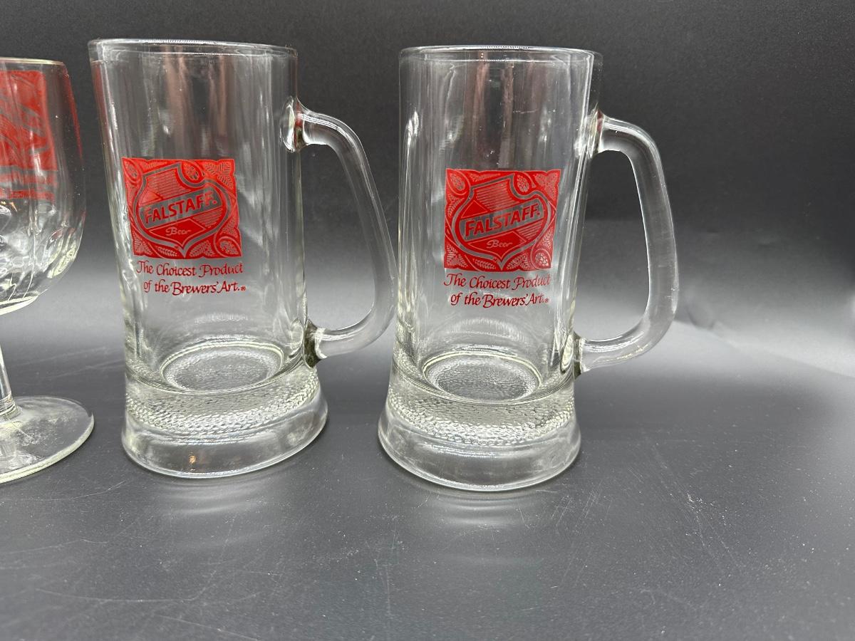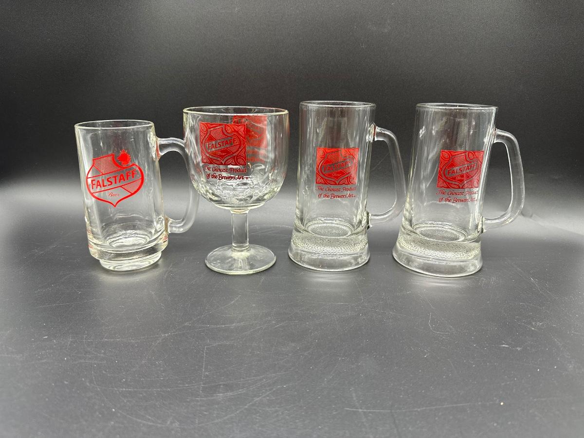 Lot of 4 Vintage Falstaff Beer Glasses – 2 Steins, Mug & Goblet – Red Logo Barware