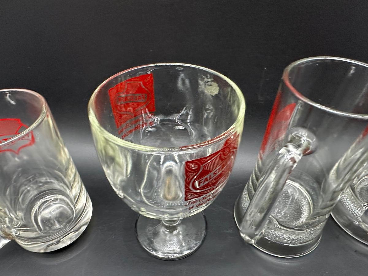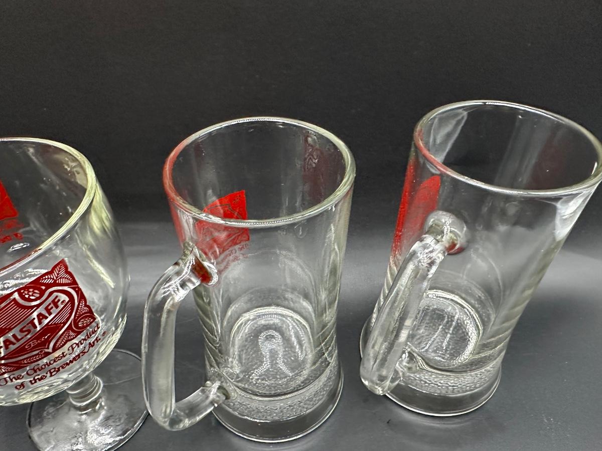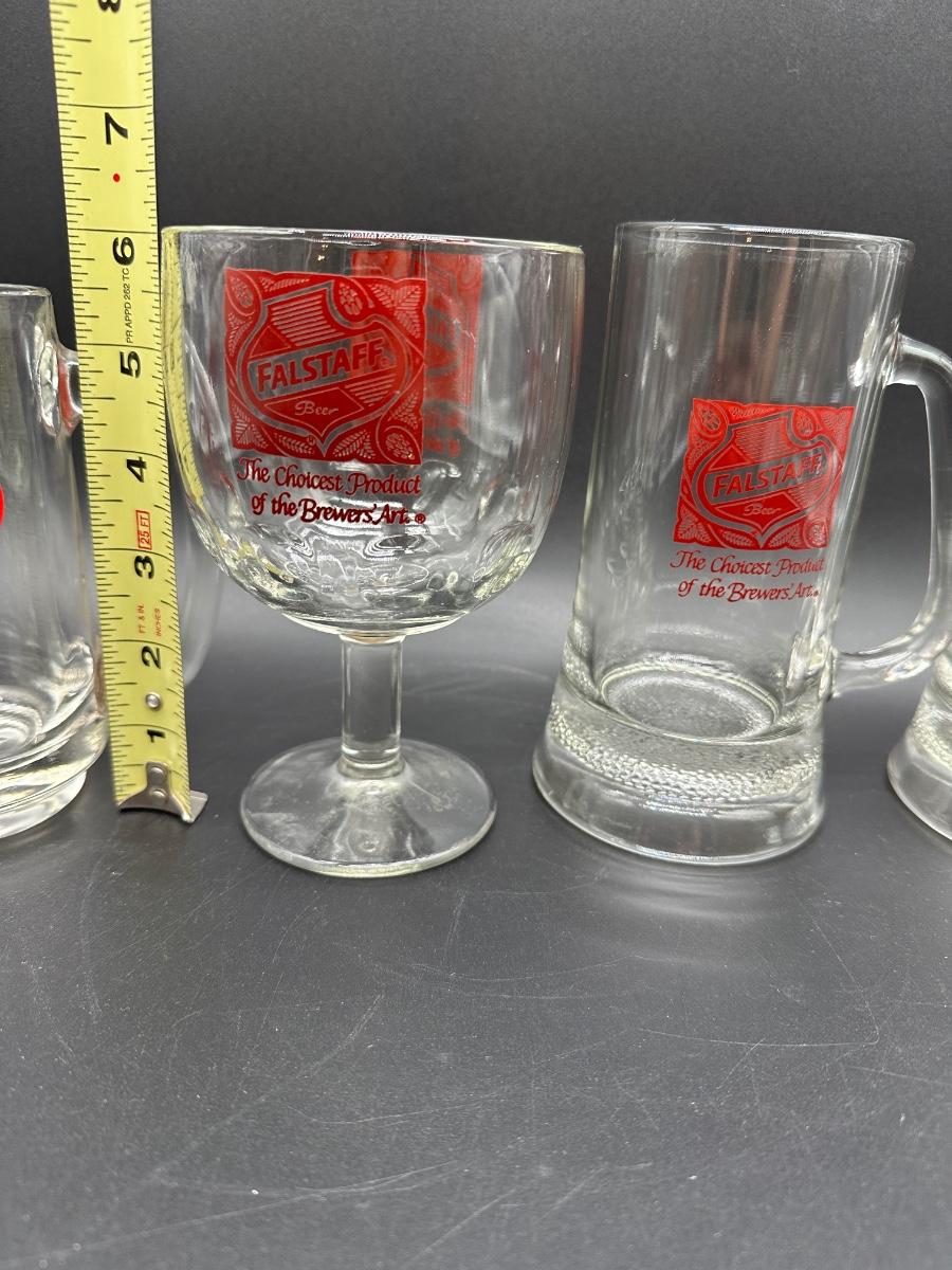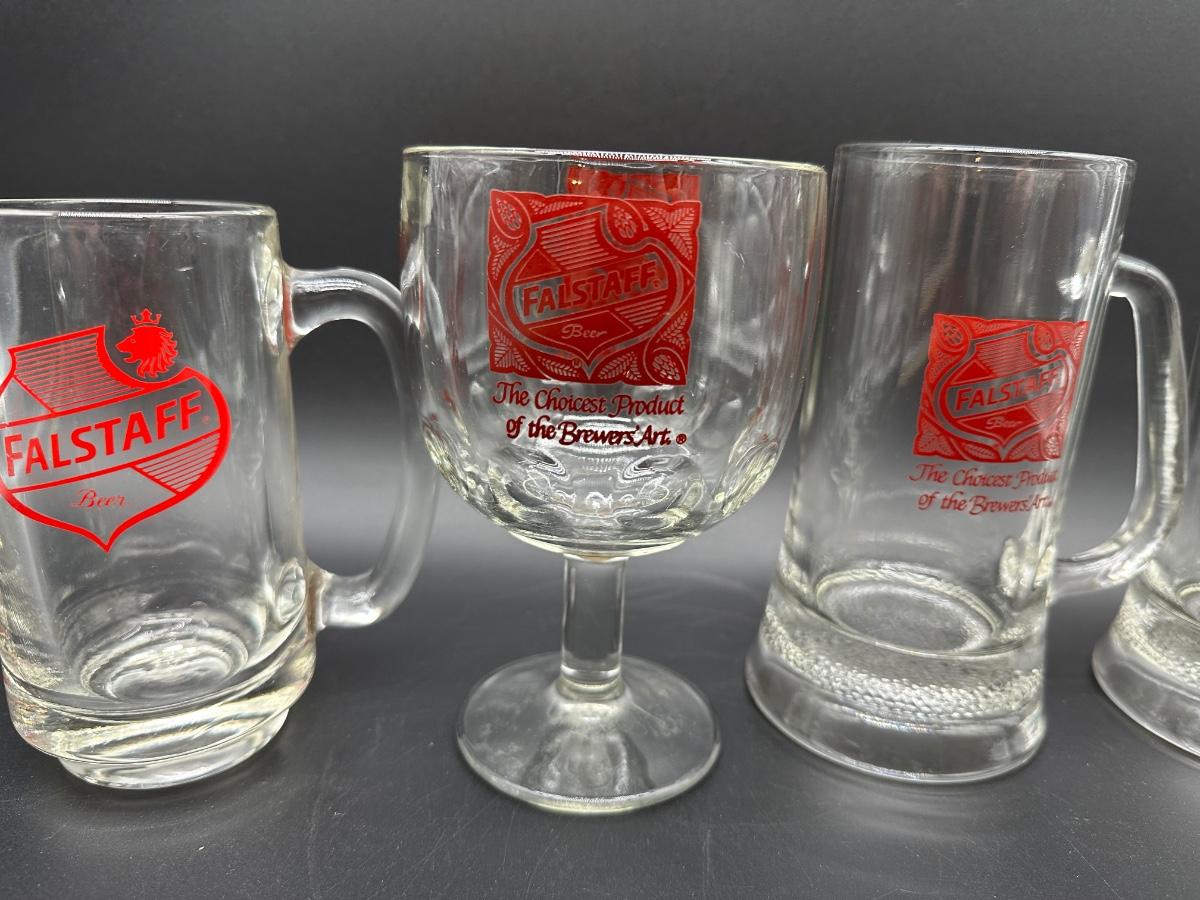 Lot of 4 Vintage Falstaff Beer Glasses – 2 Steins, Mug & Goblet – Red Logo Barware