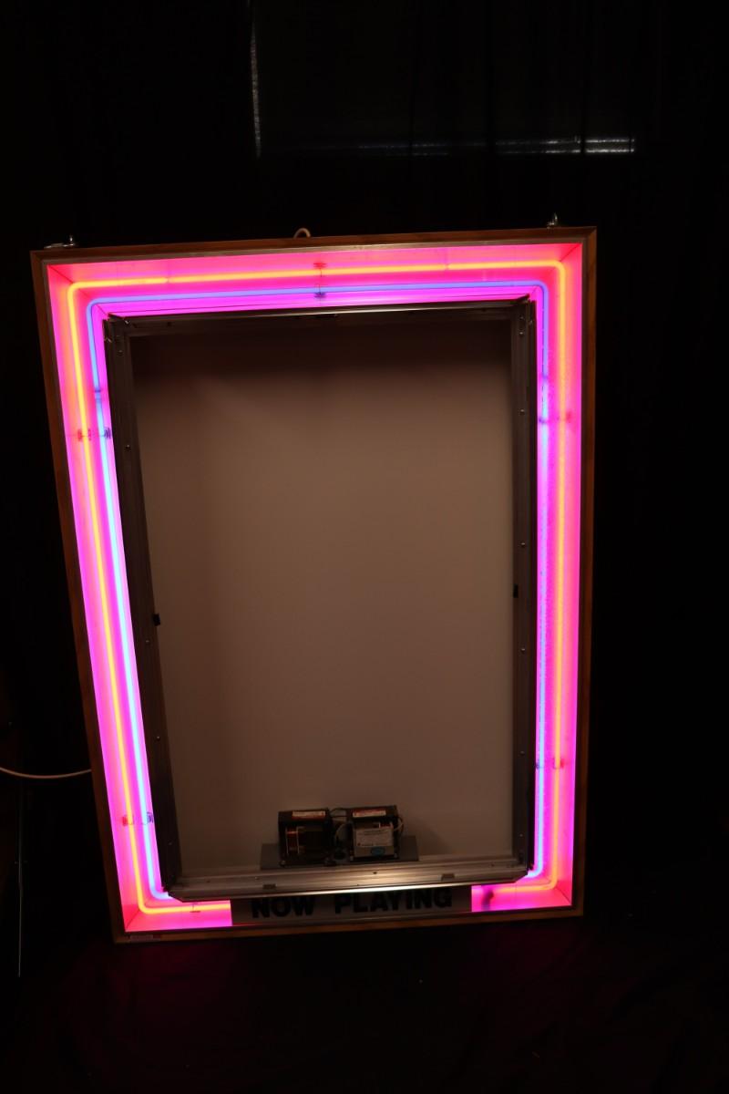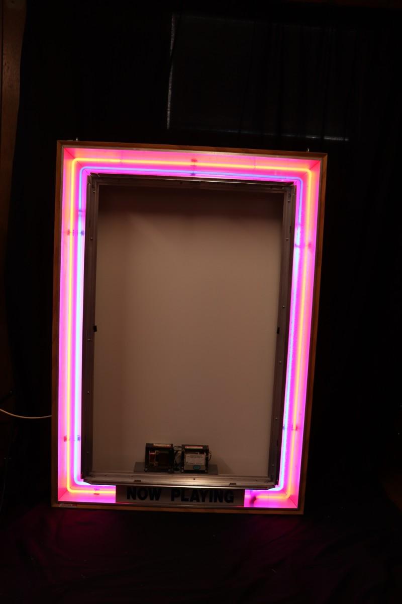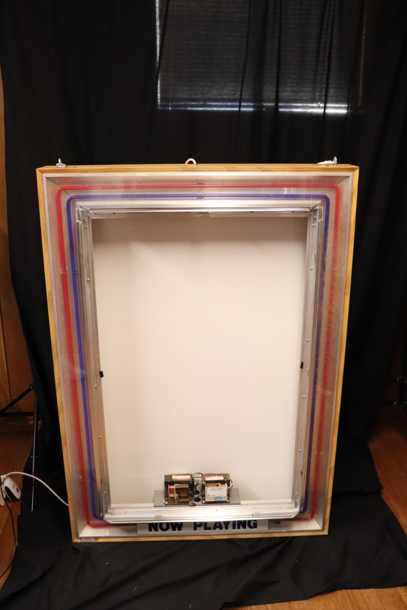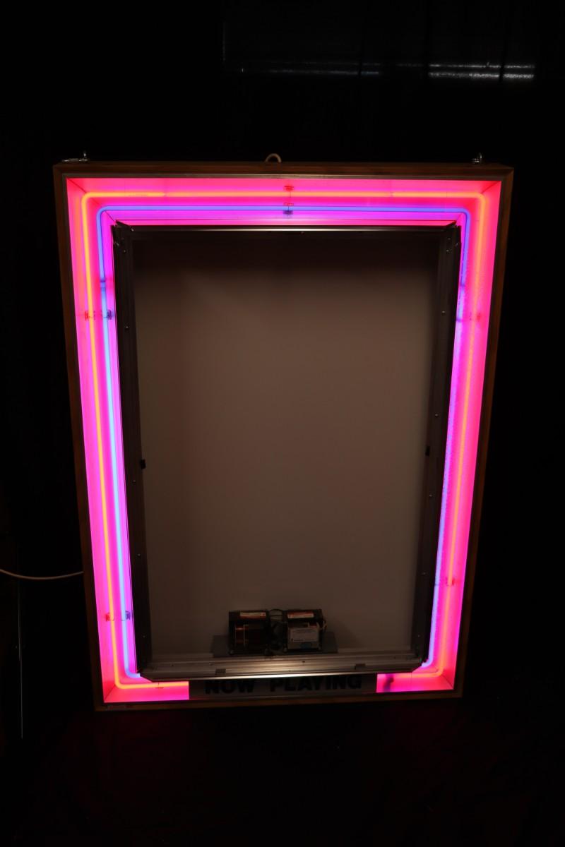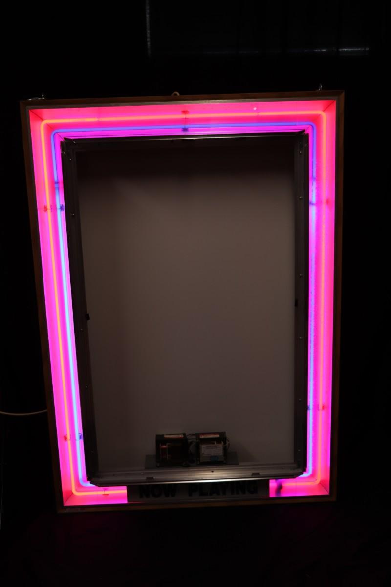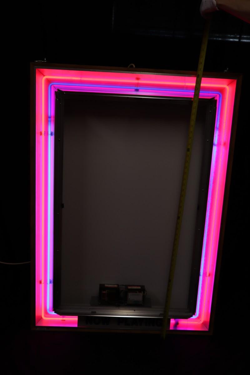 Fantastic Lot of 4 Vintage Neon Advertising Signs! Three of the signs are hanging (as shown), and one was stored separately (shown in stand-alone images). Each neon sign is approximately 49 inches tall and 35 inches wide. All 4 neon signs illuminate in bright pink or purple and blue on the perimeter, while only one sign appears to currently illuminate in the center info area of the light boxes. All four signs say "Now Playing" at the bottom. Condition as shown.