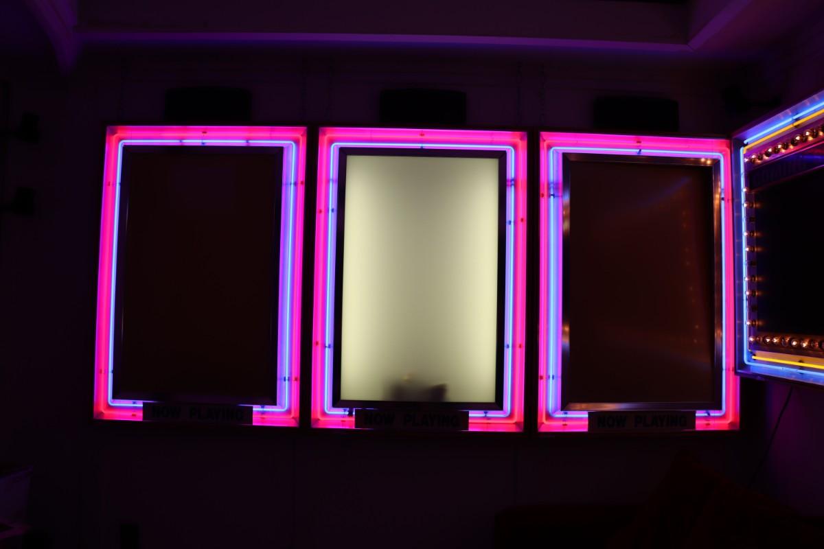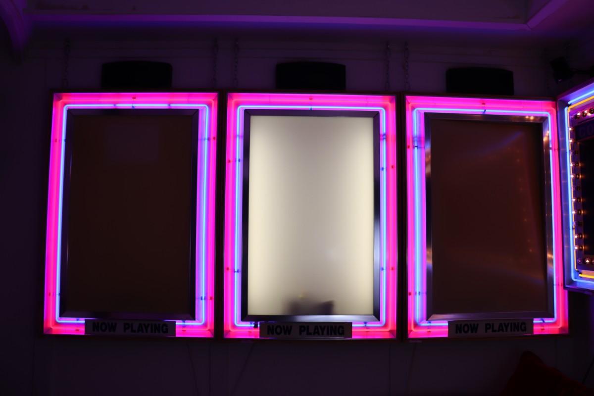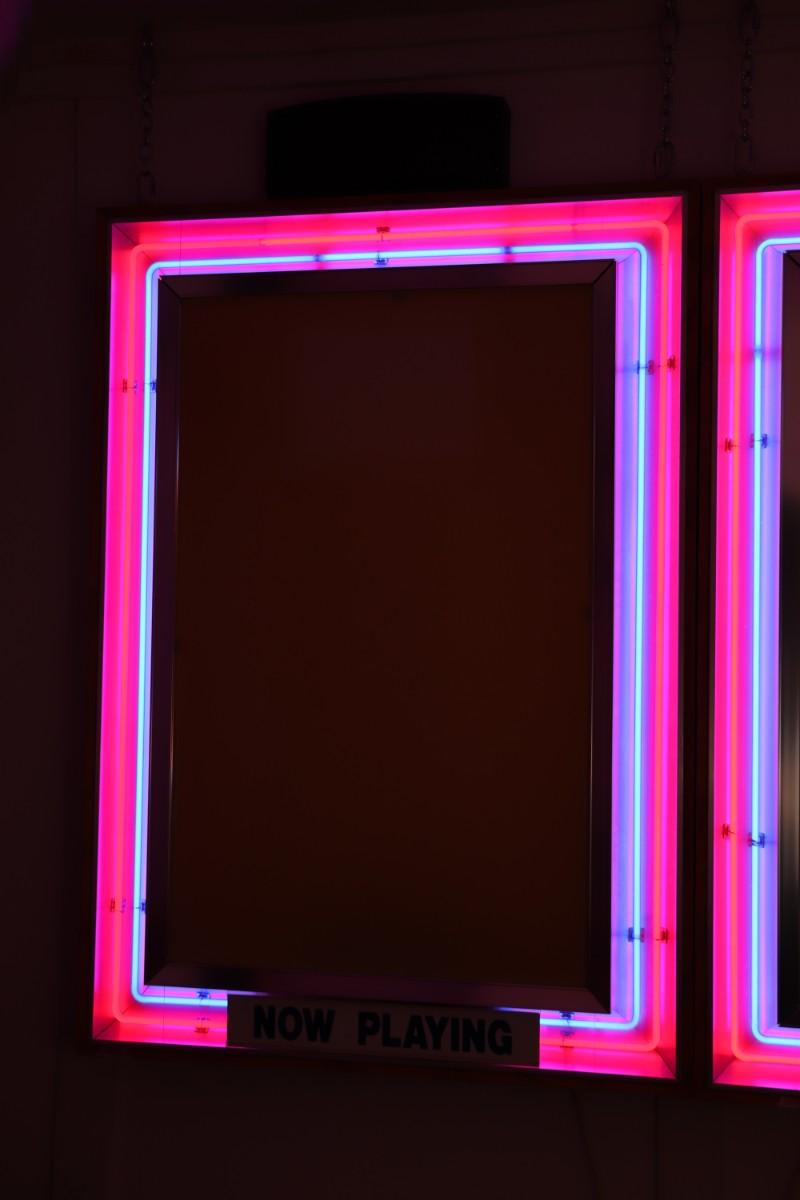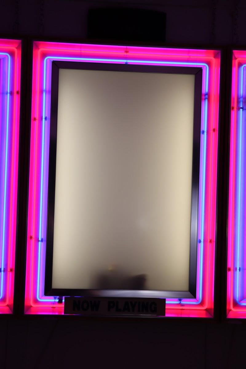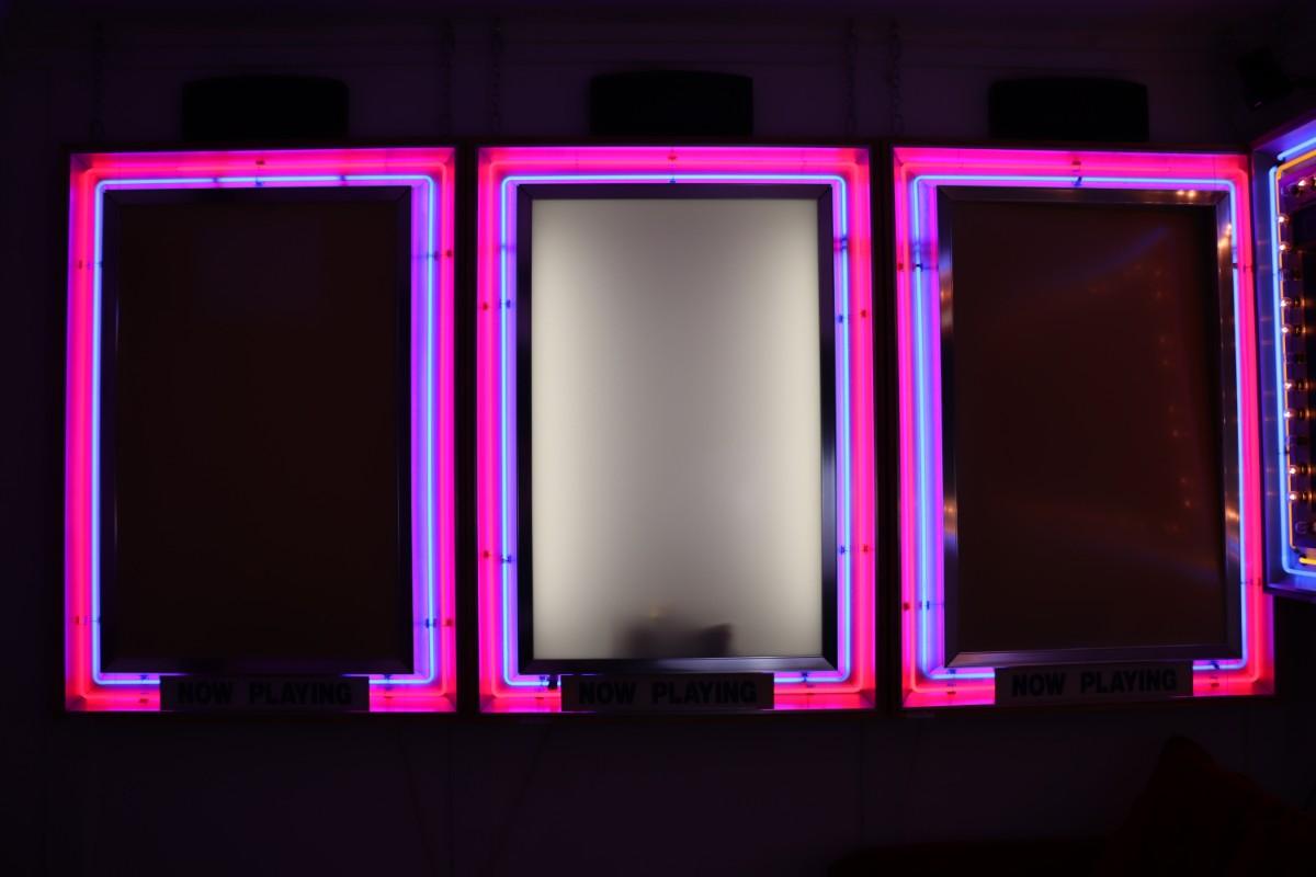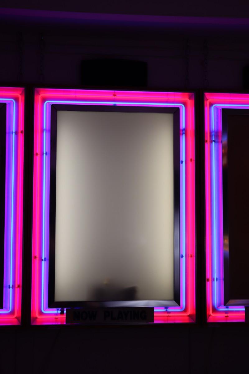 Fantastic Lot of 4 Vintage Neon Advertising Signs! Three of the signs are hanging (as shown), and one was stored separately (shown in stand-alone images). Each neon sign is approximately 49 inches tall and 35 inches wide. All 4 neon signs illuminate in bright pink or purple and blue on the perimeter, while only one sign appears to currently illuminate in the center info area of the light boxes. All four signs say "Now Playing" at the bottom. Condition as shown.