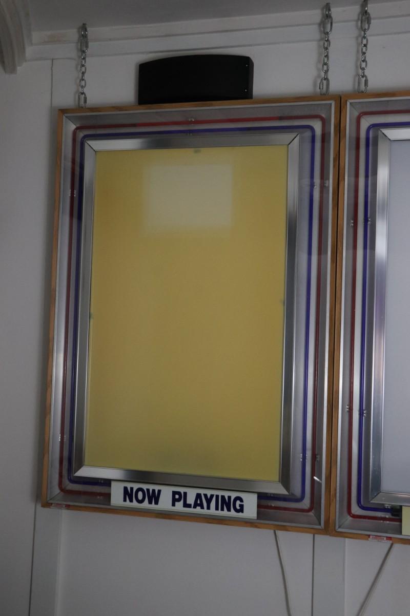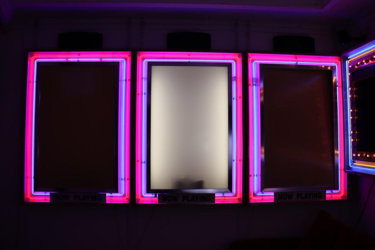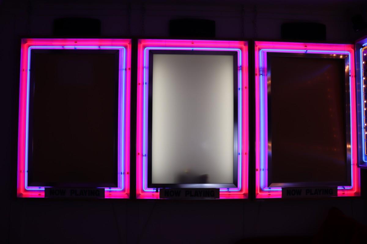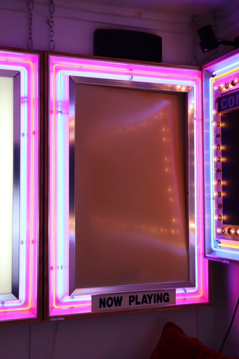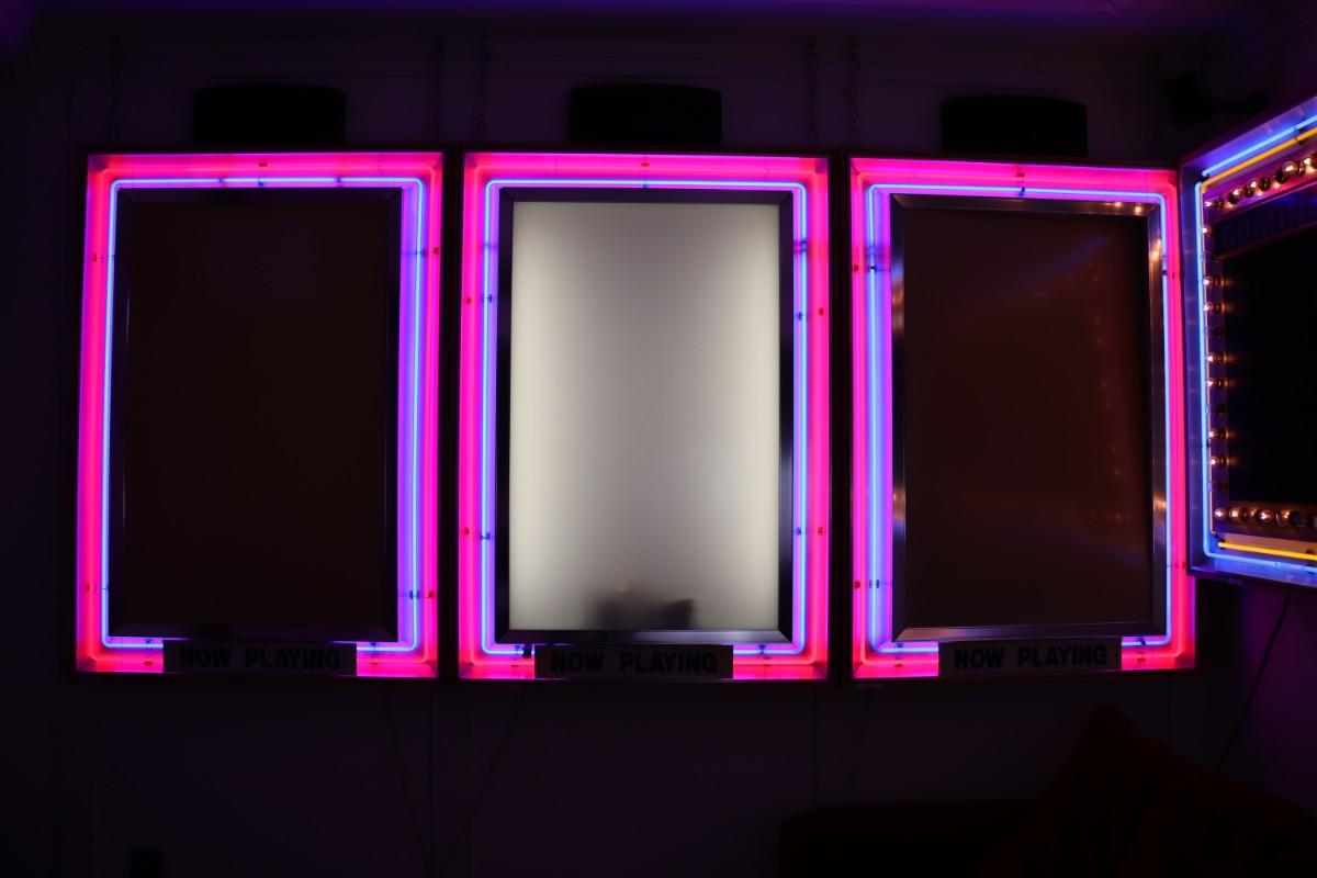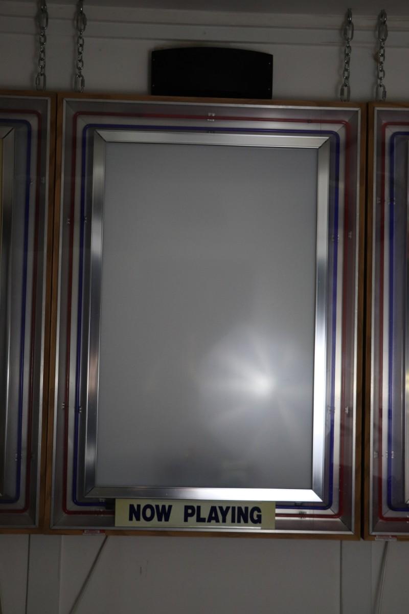 Fantastic Lot of 4 Vintage Neon Advertising Signs! Three of the signs are hanging (as shown), and one was stored separately (shown in stand-alone images). Each neon sign is approximately 49 inches tall and 35 inches wide. All 4 neon signs illuminate in bright pink or purple and blue on the perimeter, while only one sign appears to currently illuminate in the center info area of the light boxes. All four signs say "Now Playing" at the bottom. Condition as shown.