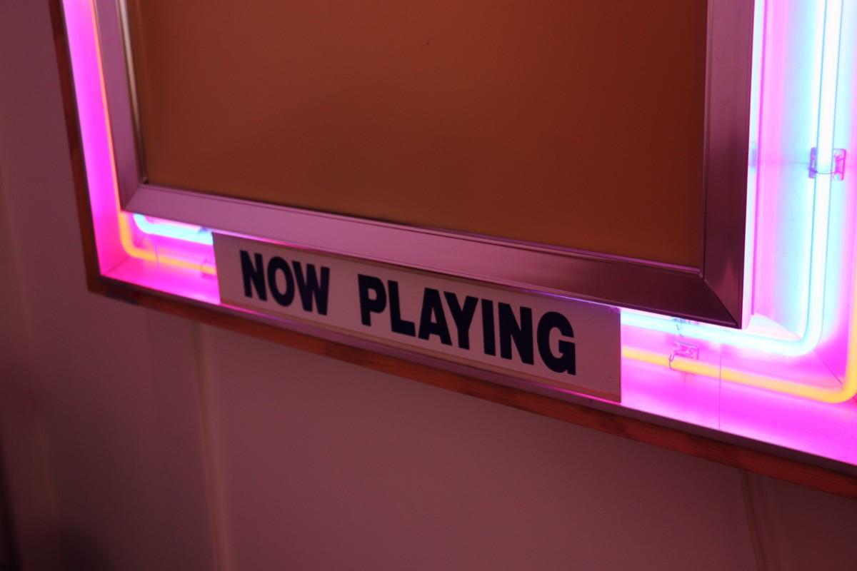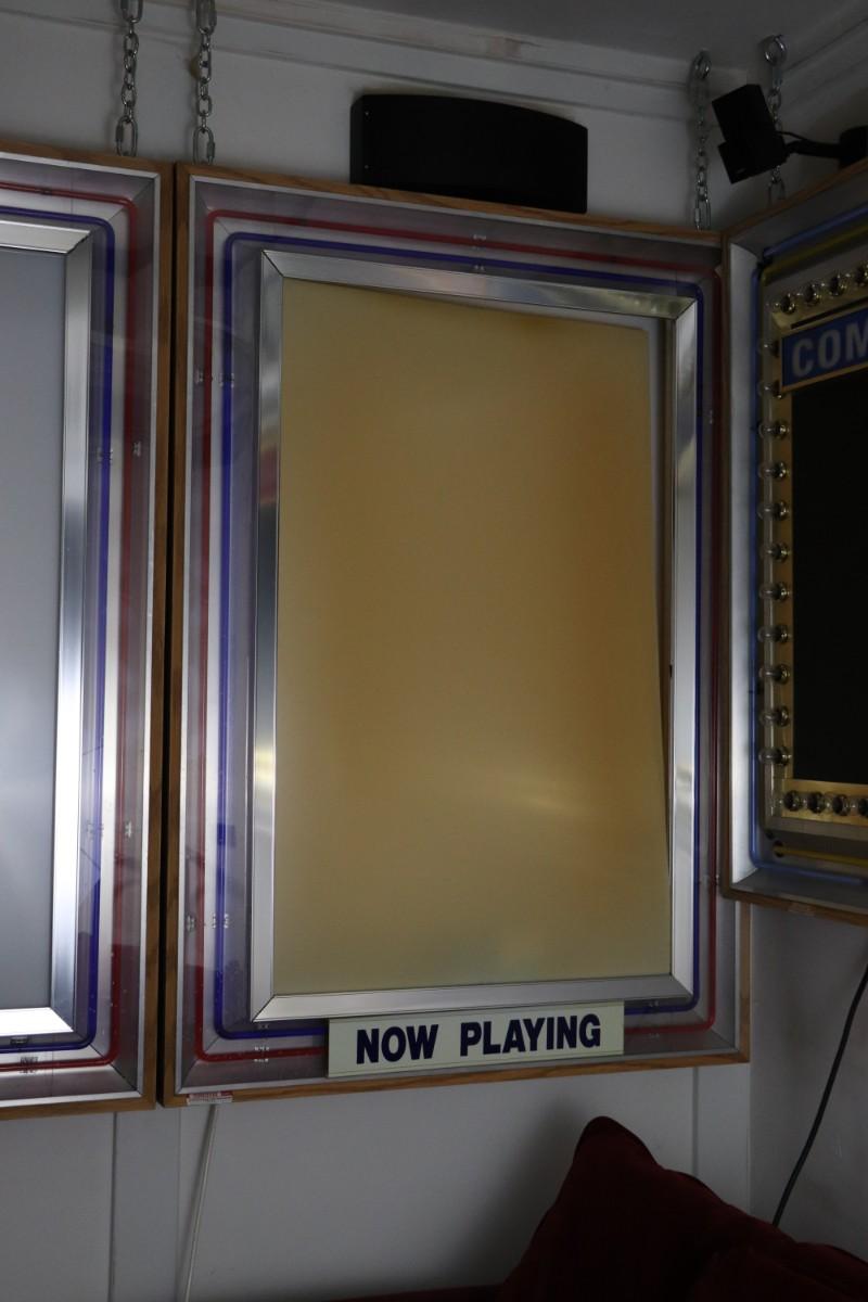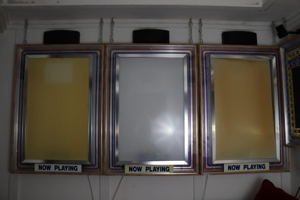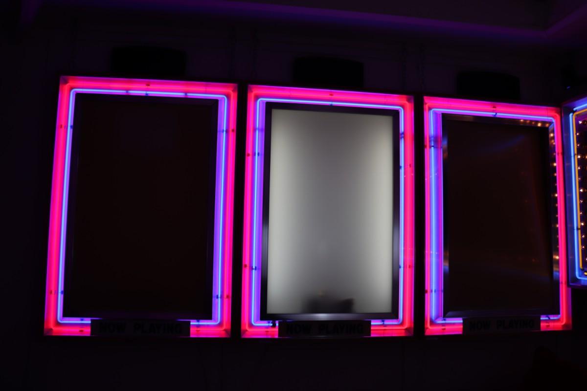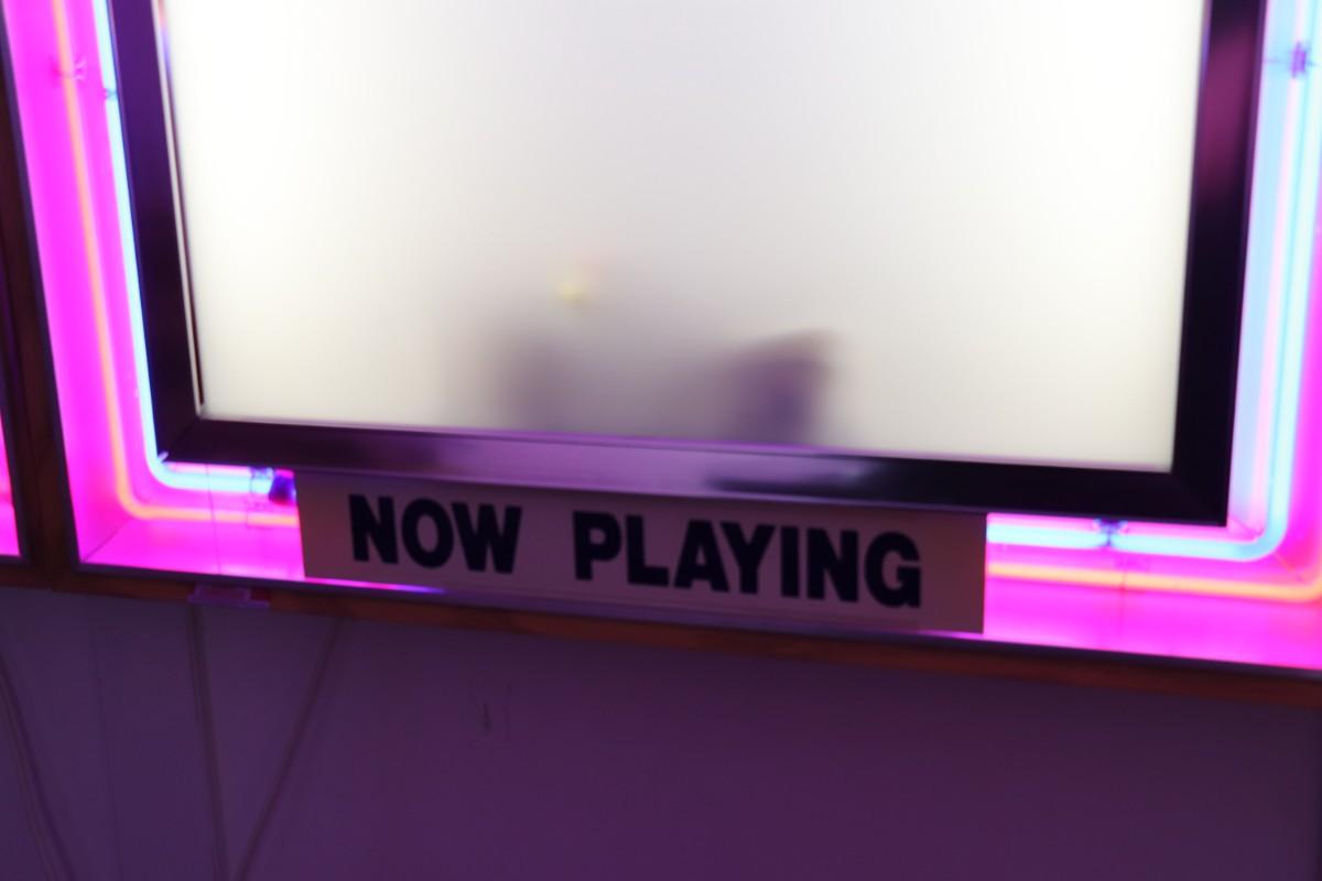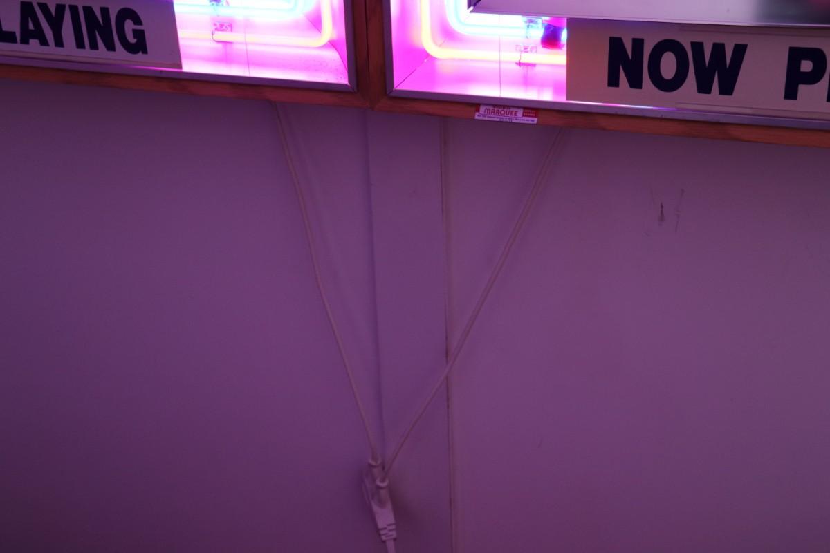Fantastic Lot of 4 Vintage Neon Advertising Signs! Three of the signs are hanging (as shown), and one was stored separately (shown in stand-alone images). Each neon sign is approximately 49 inches tall and 35 inches wide. All 4 neon signs illuminate in bright pink or purple and blue on the perimeter, while only one sign appears to currently illuminate in the center info area of the light boxes. All four signs say "Now Playing" at the bottom. Condition as shown.