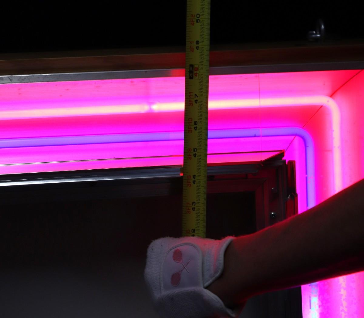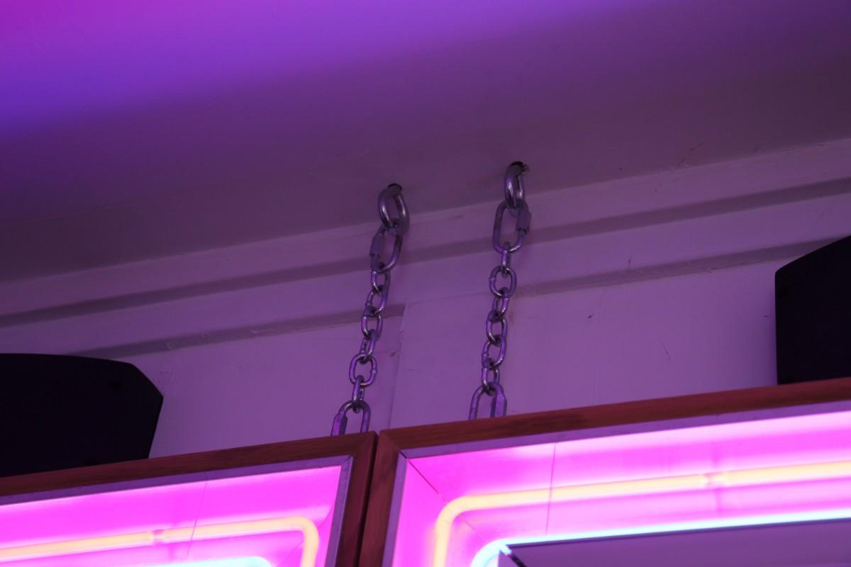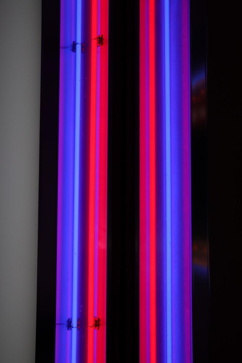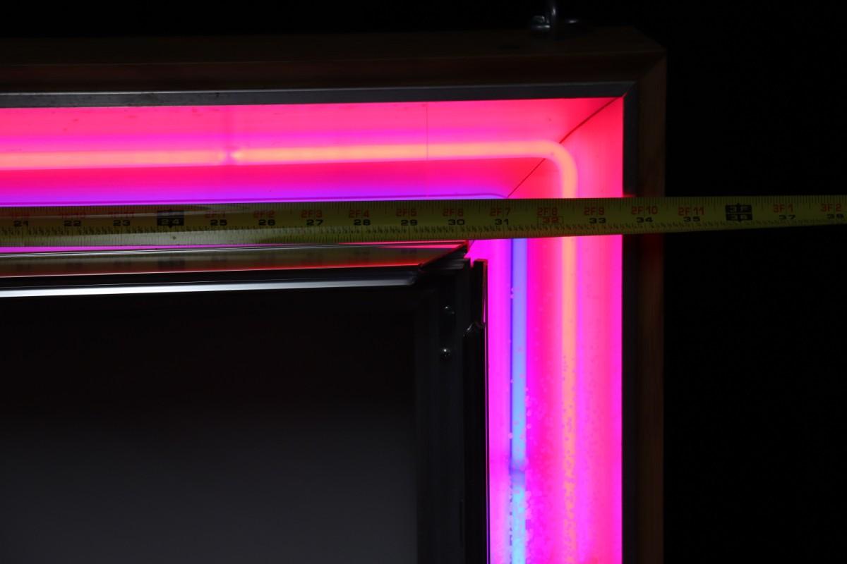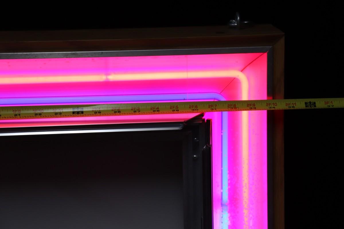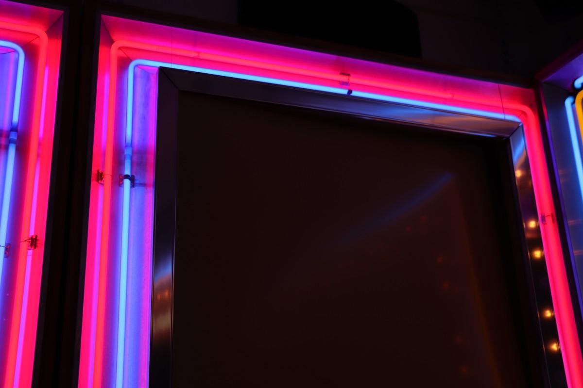 Fantastic Lot of 4 Vintage Neon Advertising Signs! Three of the signs are hanging (as shown), and one was stored separately (shown in stand-alone images). Each neon sign is approximately 49 inches tall and 35 inches wide. All 4 neon signs illuminate in bright pink or purple and blue on the perimeter, while only one sign appears to currently illuminate in the center info area of the light boxes. All four signs say "Now Playing" at the bottom. Condition as shown.