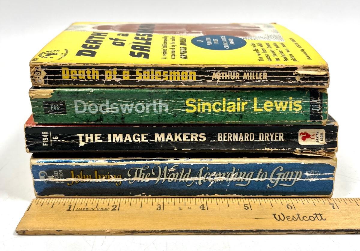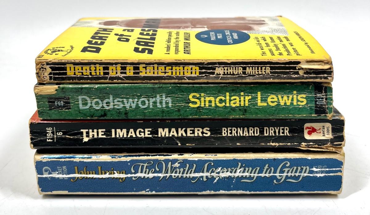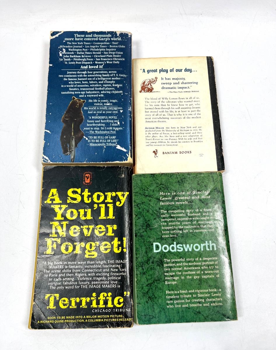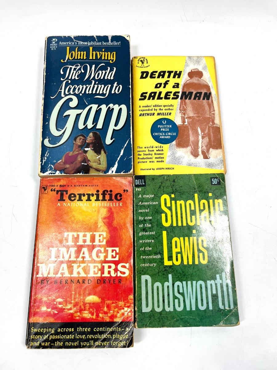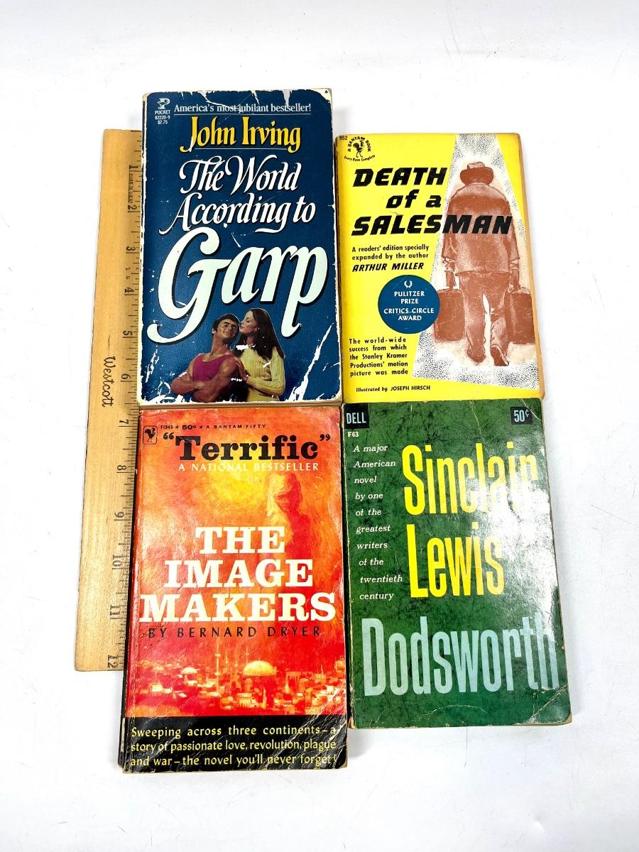 Lot of 4 vintage paperback novels World According to Garp, Death of a Salesman, The Image Makers, Dodsworth