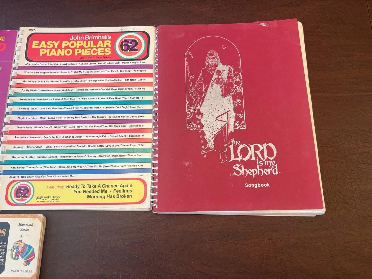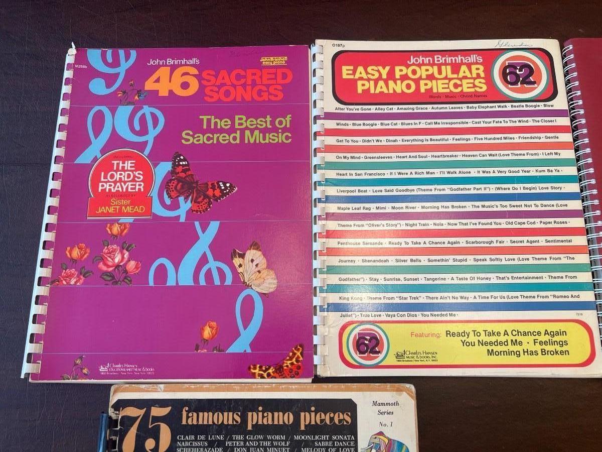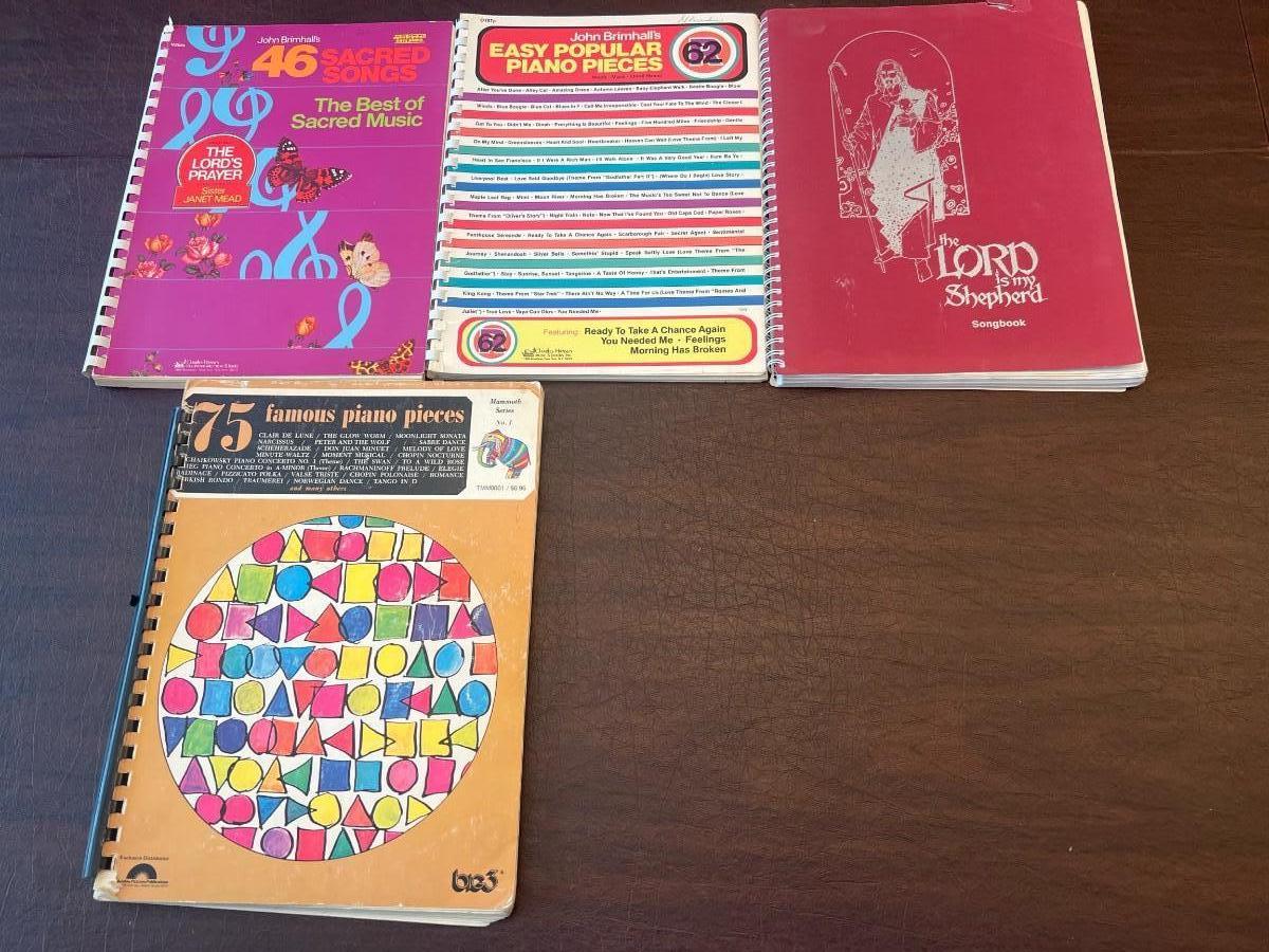 Collection of four vintage spiral-bound piano instruction and song books featuring popular, classical, and sacred music from the 1960s–1980s.