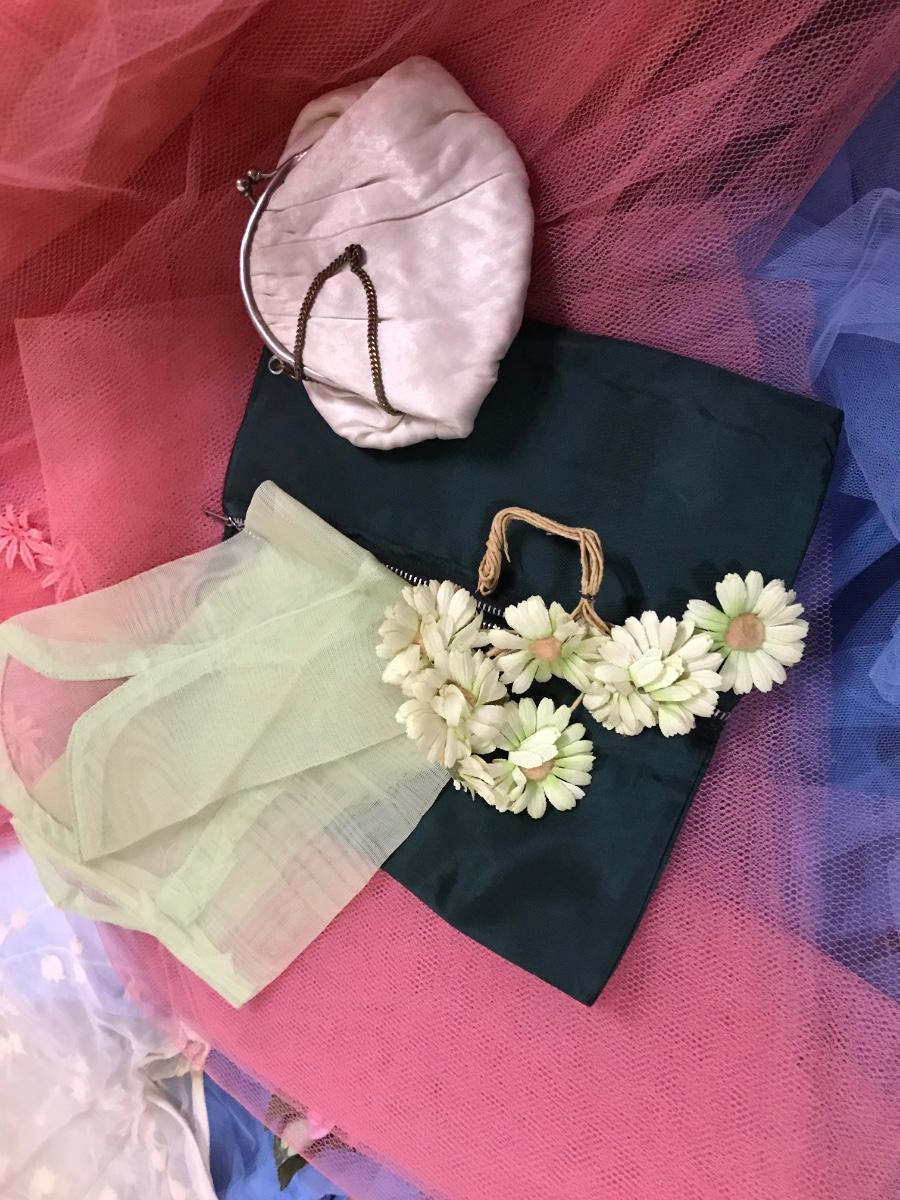 Pink and dark blue in great vintage condition. Pink comes with matching wrap. Light blue and green in need of cleaning and repair. Green ones with matching purse hairpiece and gloves. Light blue has matching gloves. Plus one small silk white wristlet purse. Sizes small and medium.