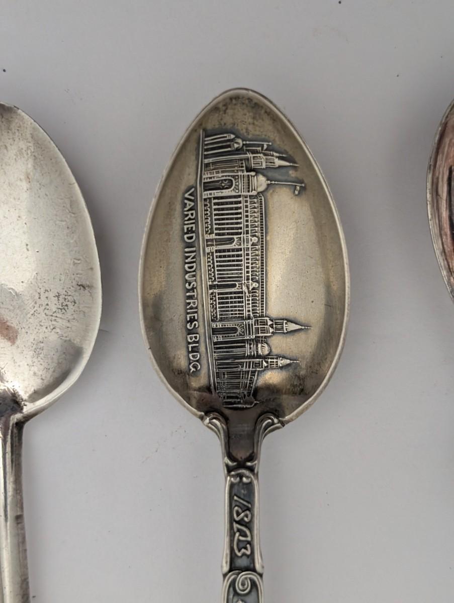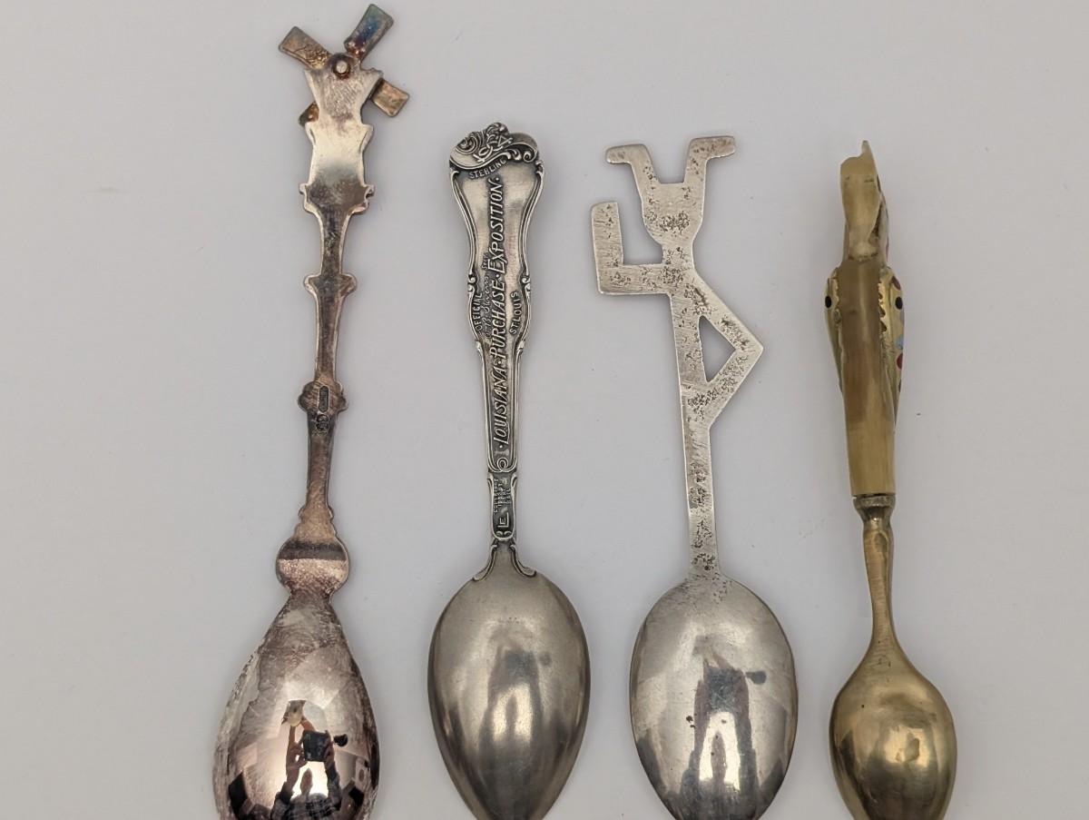 souvenir spoons, vintage spoon lot, collectible spoons, Dutch windmill, Varied Industries Building 1893, abstract design, bone handle, hand painted, antique silver spoon, world souvenir collection, travel memorabilia, global collectibles, eclectic display, vintage flatware, metal art spoons