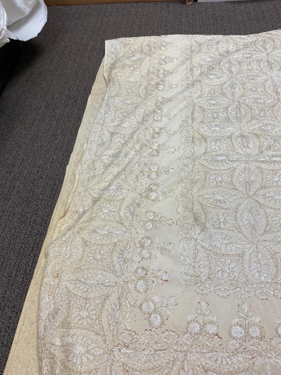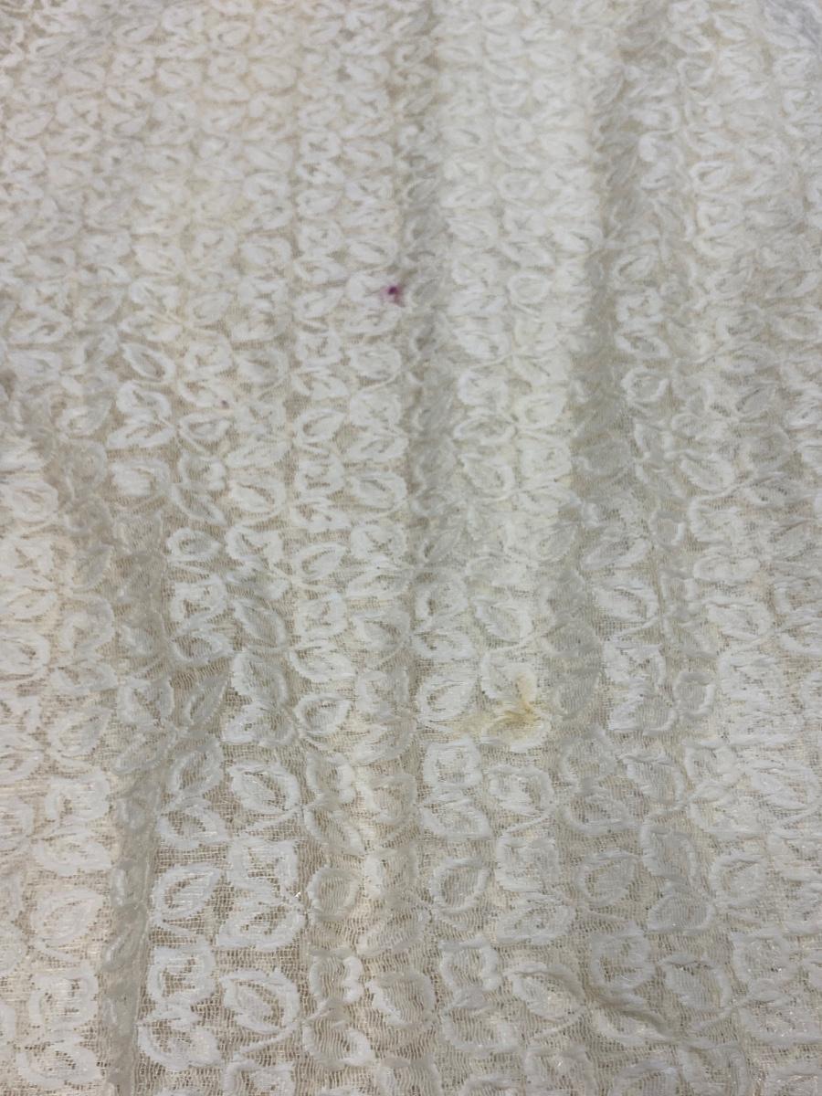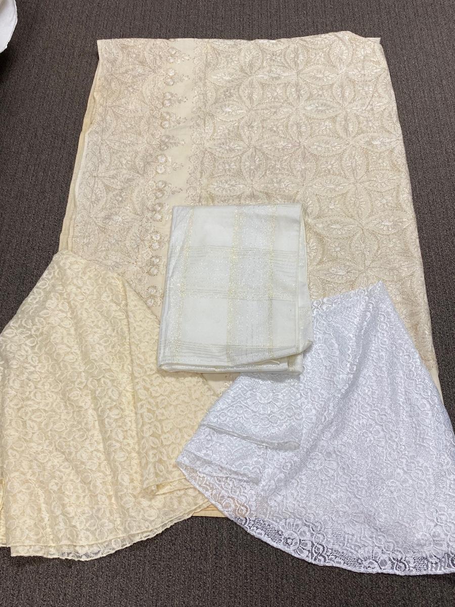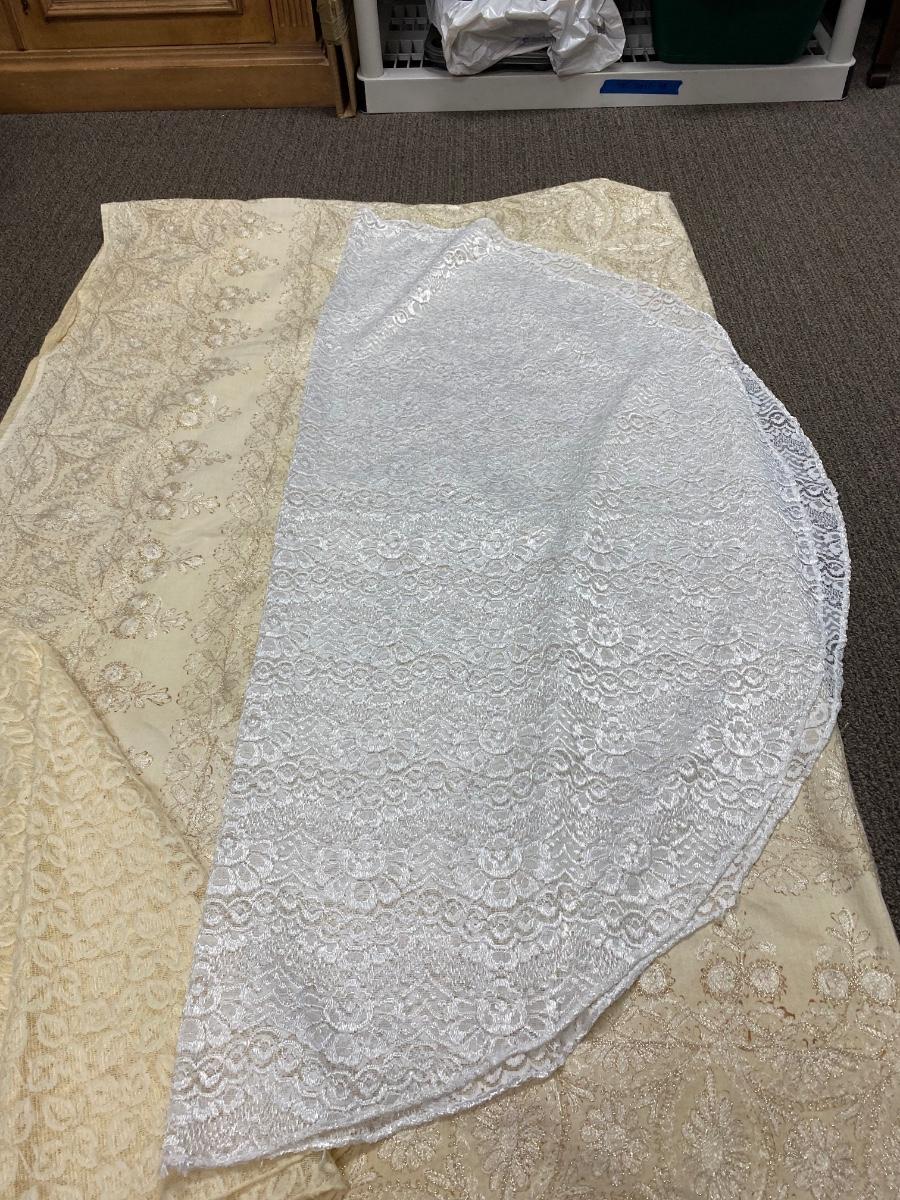 Lot of 4 White & Gold Lace Embroidered Tablecloths Different Sizes. The two lace covers are round about 5' diameter. The smaller white rectangle cloth has a gold metallic plaid pattern. The large rectangle has an embroidered pattern but is very discolored around the edges.