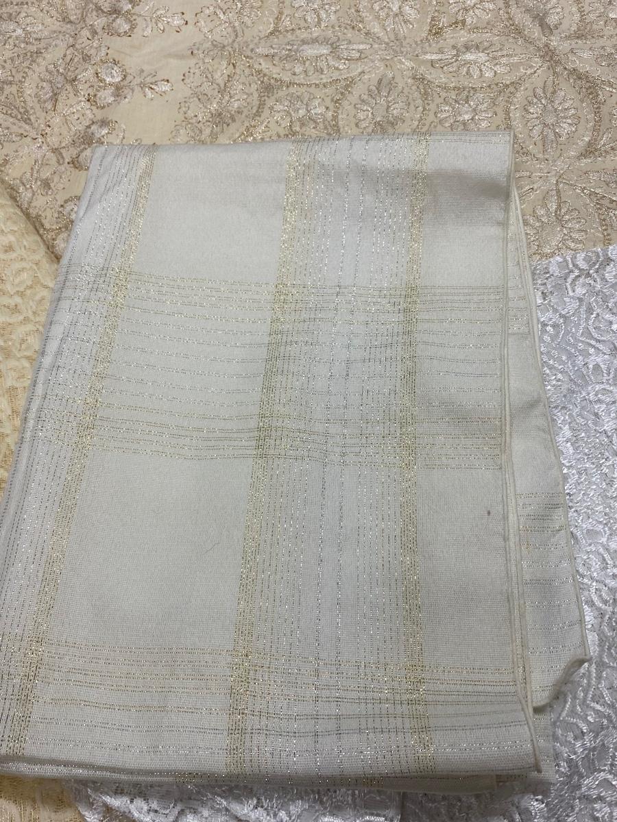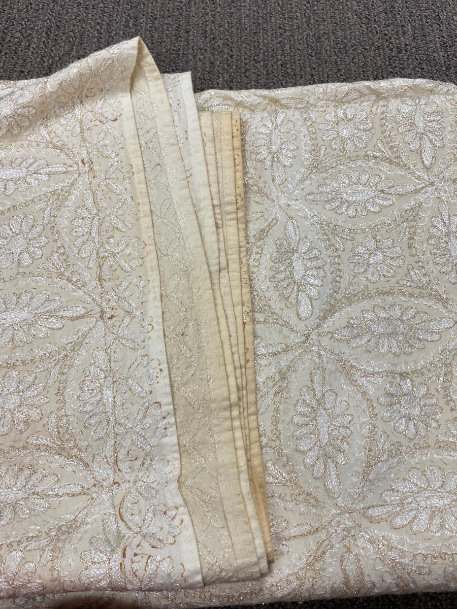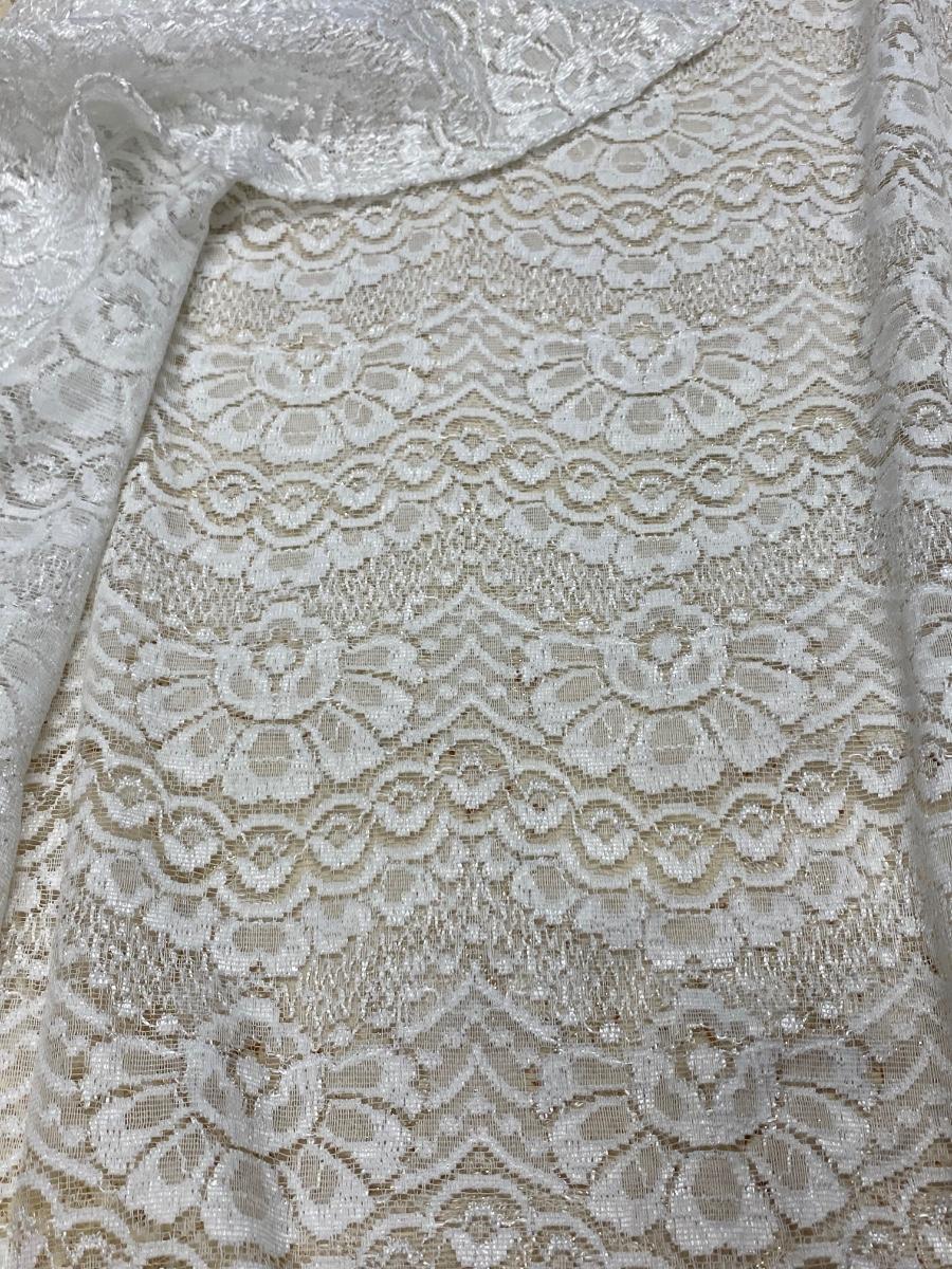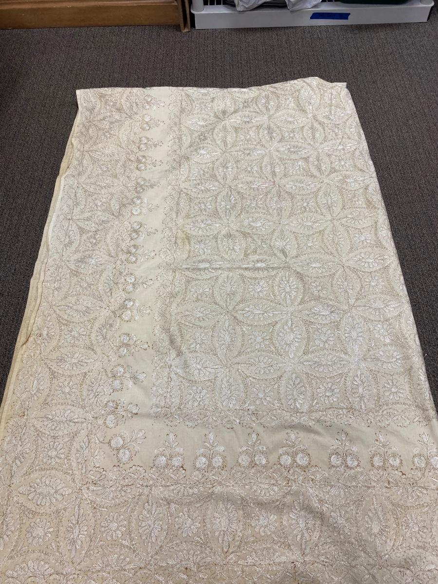 Lot of 4 White & Gold Lace Embroidered Tablecloths Different Sizes. The two lace covers are round about 5' diameter. The smaller white rectangle cloth has a gold metallic plaid pattern. The large rectangle has an embroidered pattern but is very discolored around the edges.