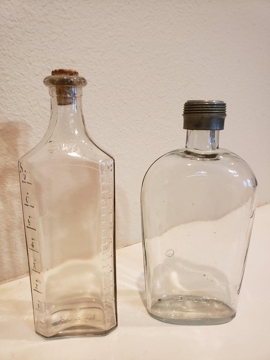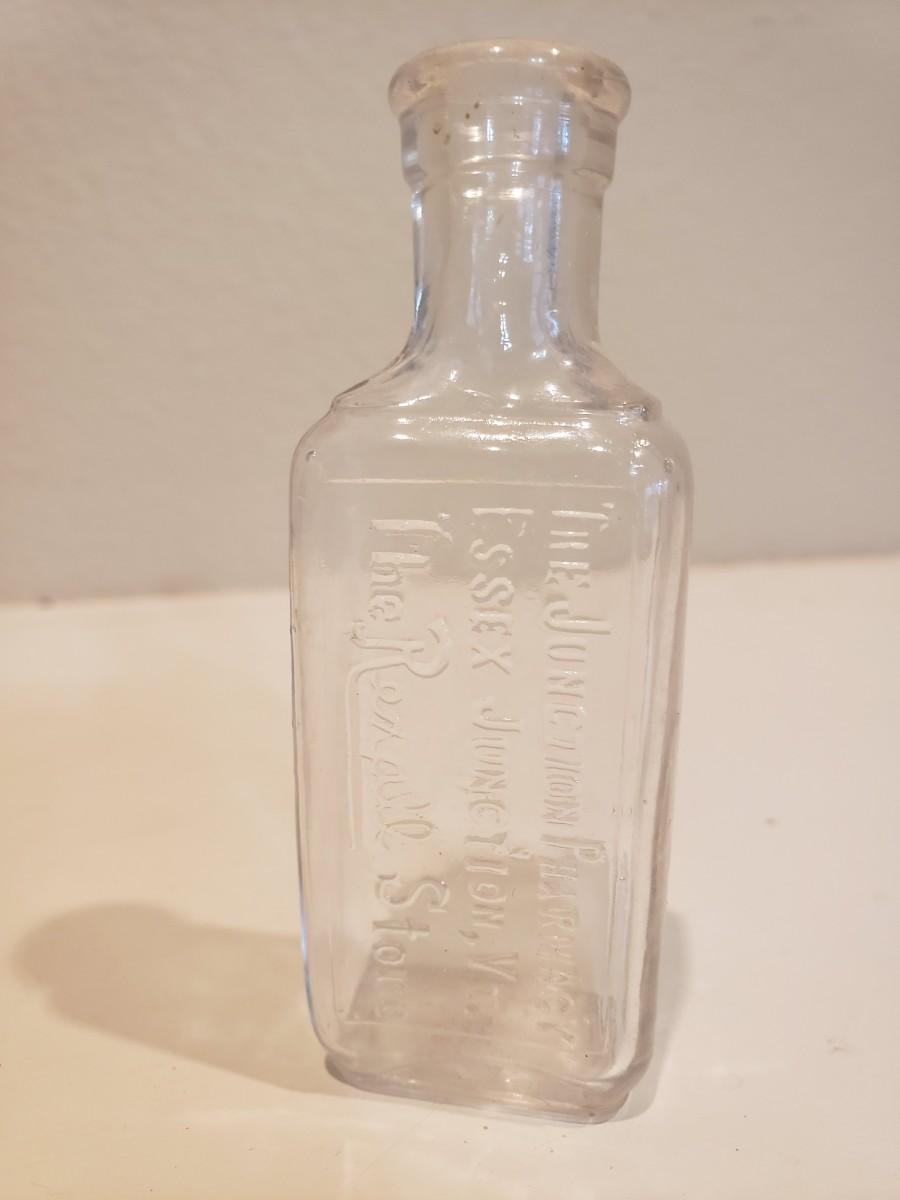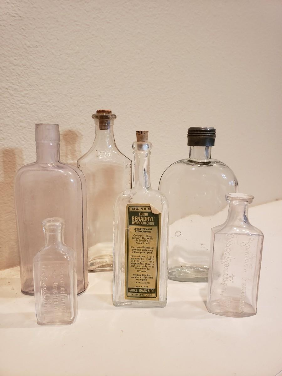 Lot of 6 antique bottles. The Junction Pharmacy 3.5", Benadryl Elixir 6.5", Junction Pharmacy 5.5", and three unmarked 6.5"; 7" & 7.5".