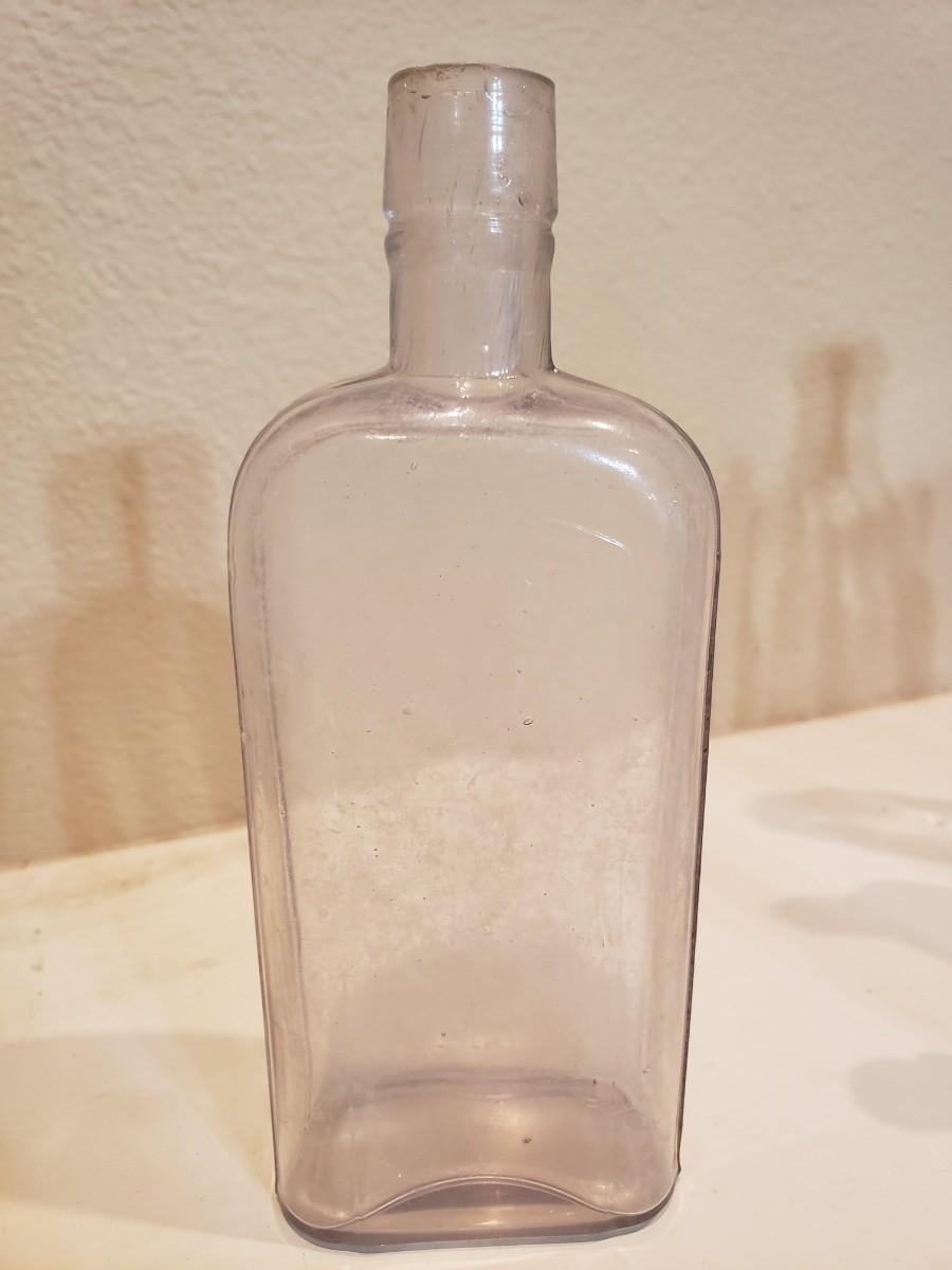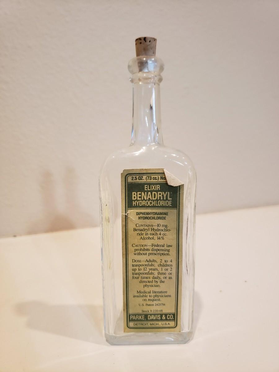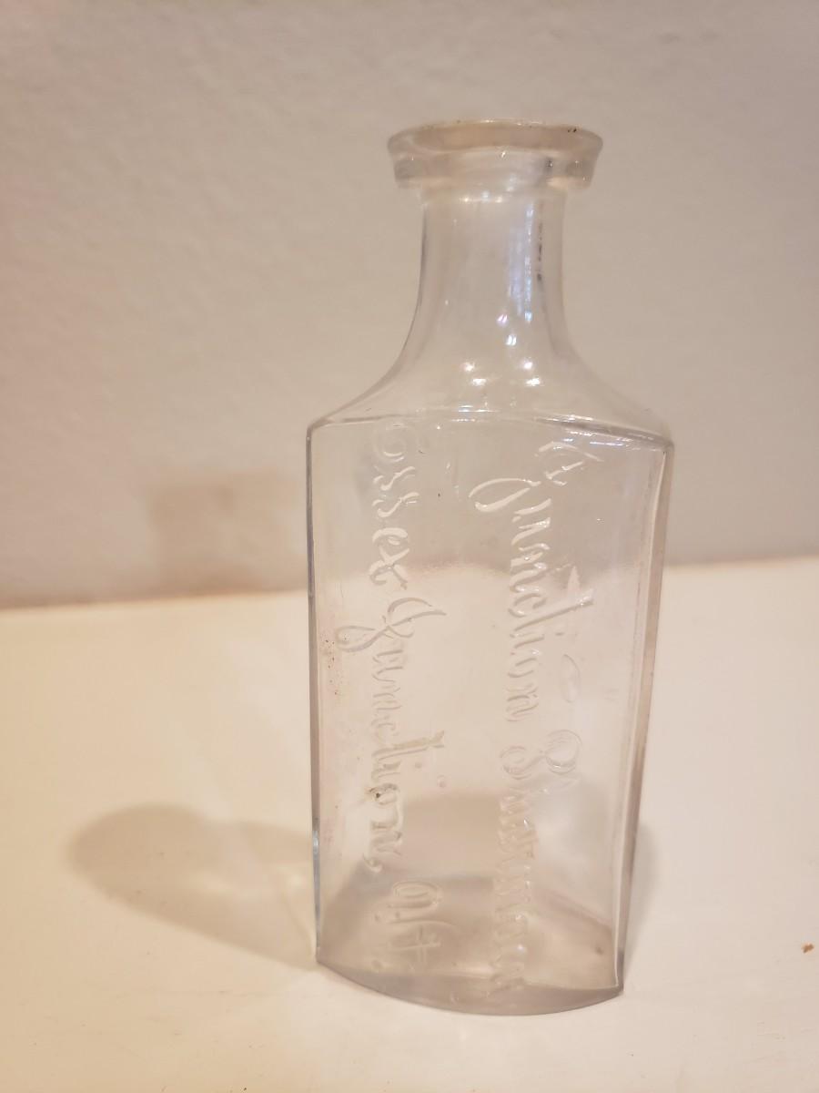 Lot of 6 antique bottles. The Junction Pharmacy 3.5", Benadryl Elixir 6.5", Junction Pharmacy 5.5", and three unmarked 6.5"; 7" & 7.5".