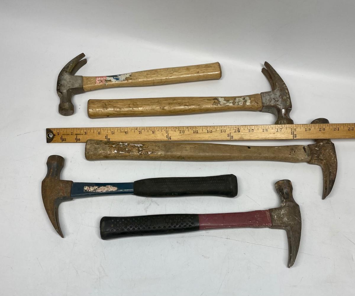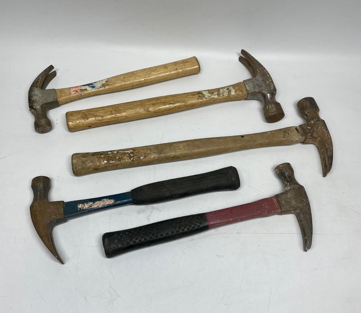 5 hammers, 3 with wood handles and 2 with composite handles.