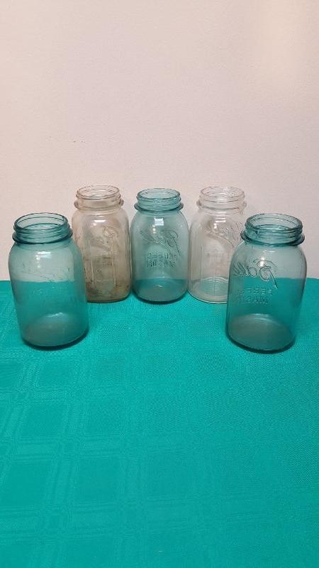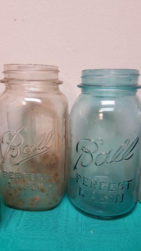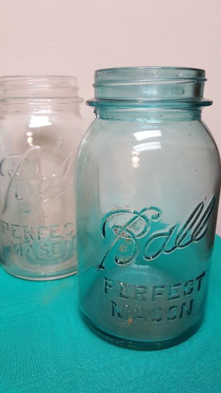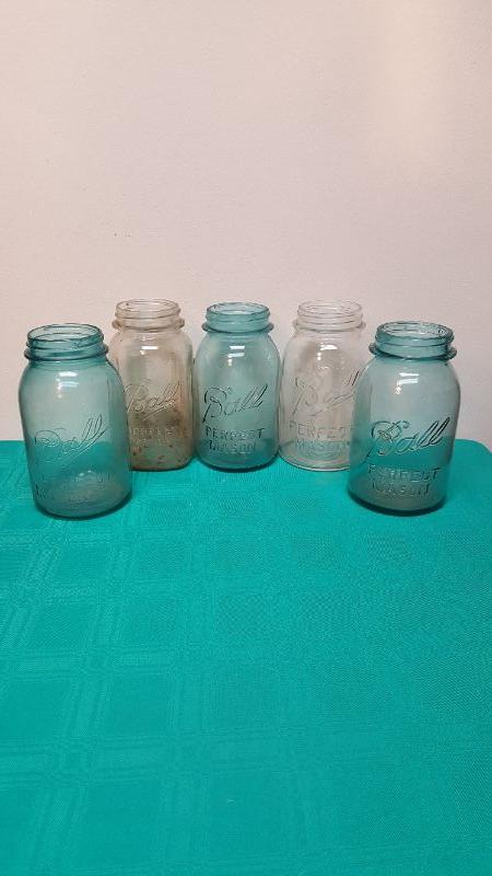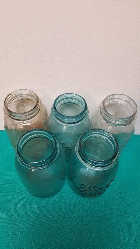 Lot of 5 clear and aqua blue, large sized Ball Mason jars. All in good condition. Two blue jars have minor chip on inside rim. See pics.